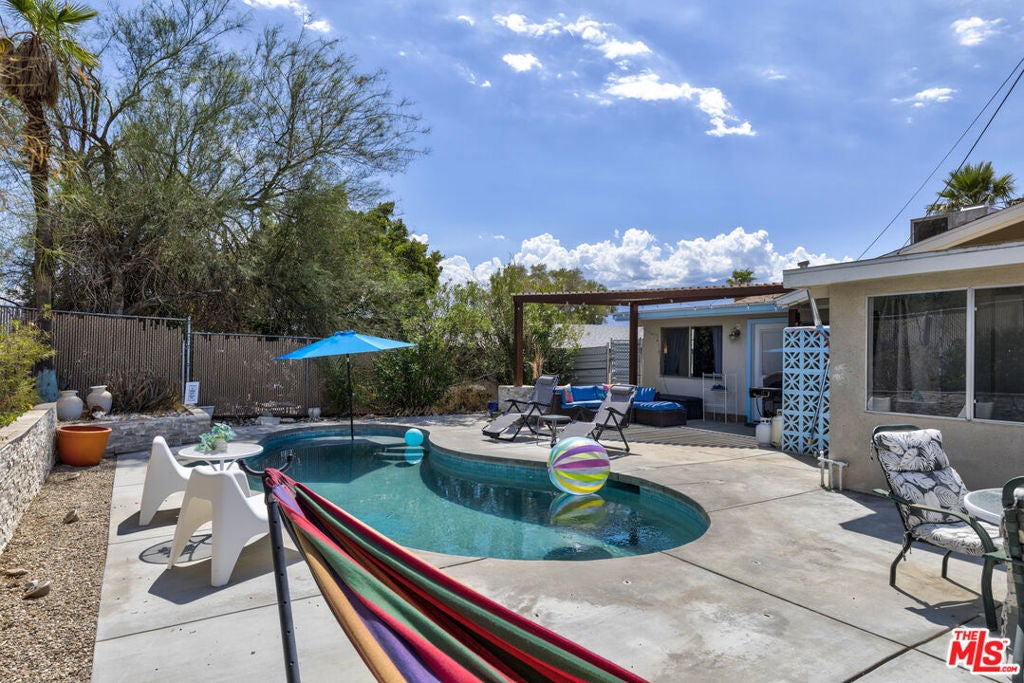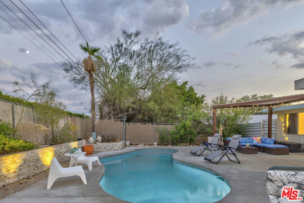 Welcome to this beautiful, spacious home with large size bedrooms, full kitchen, remodeled throughout, and an amazing swimming pool! Enjoy sunsets over the San Jacinto mountains from the front patio, or entertain guests at the back patio by the BBQ, pool, and the private movie/media room. Sitting on a quiet street, walking distance to some nice trails up into the desert hills; a perfect place to call home either permanently or when you need to get away. Pool was built in 2021, completely permitted. The pool is gas heated and features a fountain system which can be turned on or off. Kids love running through the fountains! The house features a side yard with separate entrance to the "guest suite". The house comes completely furnished with stainless steel appliances- refrigerator, dishwasher, stove, microwave, and more. Central AC and heat keeps the home warm in the winter and cool in the summer. The garage features tons of storage and is well maintained. More storage sheds are in the backyard by the pool house. A fully paid for security system with 4 different cameras around the house provide that extra security protection. 18 solar panels help pay the bills, the solar system is completely paid for and comes to the new owner. A well maintained and landscaped front and back yards are watered by sprinkler systems, as well as exterior lighting to make the scenes bright. The house is currently being used as a short term vacation rental (Airbnb, Vrbo) via permit. This permit is 100% transferrable to the new owner, but must be done by the new owner's effort. Current owner will assist in the transfer as possible. The house is booked until the end of April, any reservations may be transferred to the new owners, or cancelled. Welcome to your new home, or investment, either way this place is not to be missed!