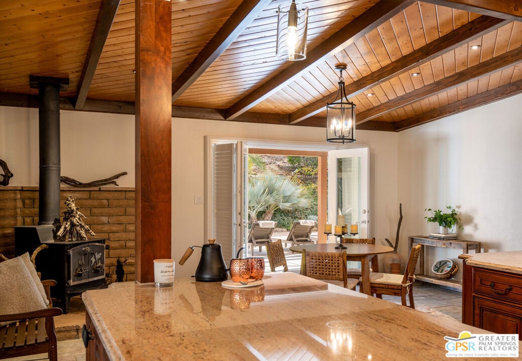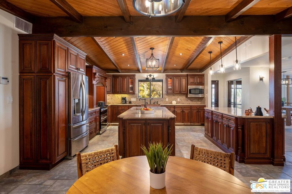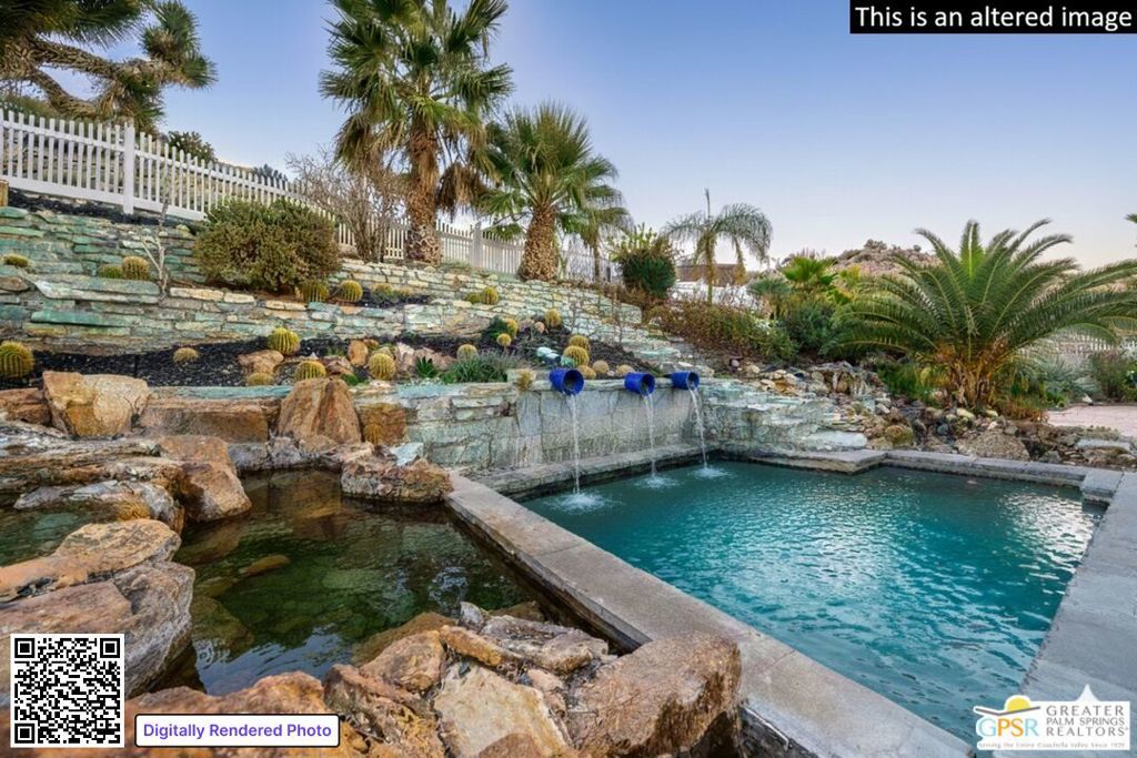 ATTENTION Buyers, The Koi pond has been evaluated and confirmed it can be converted to a pool. We have a new bid in hand. Discover Ridge Oasis, a stunning 3-bedroom, 2.5-bath fully-furnished retreat set against the hills of Yucca Valley's serene Country Club neighborhood. Perfect as a primary residence, a vacation escape, or a high-potential investment, this fully furnished home blends desert serenity with modern elegance, just minutes from Joshua Tree National Park. Inside, the open floor plan is bright and spacious, with high ceilings and clean modern finishes. The centerpiece is a gourmet kitchen, outfitted with dual islands, two sinks, and premium appliances; it's a chef's dream, perfect for family gatherings or entertaining. Enjoy morning coffee at the breakfast nook or host dinner parties in the elegant dining room, with seating for eight, complete with a cozy reading corner overlooking the expansive living area. The living room, bathed in natural light, offers breathtaking desert views through its expansive windows. Avast stone fireplace completes the space, creating a seamless connection to nature. The primary suite is a true haven, offering a sitting area, a spa-inspired ensuite with dual vanities, and walk-out doors to a serene patio - perfect for starlit evenings. Two guest bedrooms share a spacious bathroom with dual zones for privacy. A powder room and full laundry room round out the interior layout. Outside, the gated property invites exploration. Wonder paths lined with palm and Joshua trees, relax by the exotic Japanese Koi pond (which includes complete pool infrastructure for conversion), or stargaze from the upper deck's sweeping views. The hot tub and spacious entertainment patio make it easy to host and unwind. The home also comes with a three-car garage, a large custom shed, and an upgraded solar system (keeping utility costs low).Just a short drive from local dining, shopping, and hiking, Ridge Oasis offers seclusion and accessibility. Schedule your tour today to claim this desert masterpiece as your forever home!