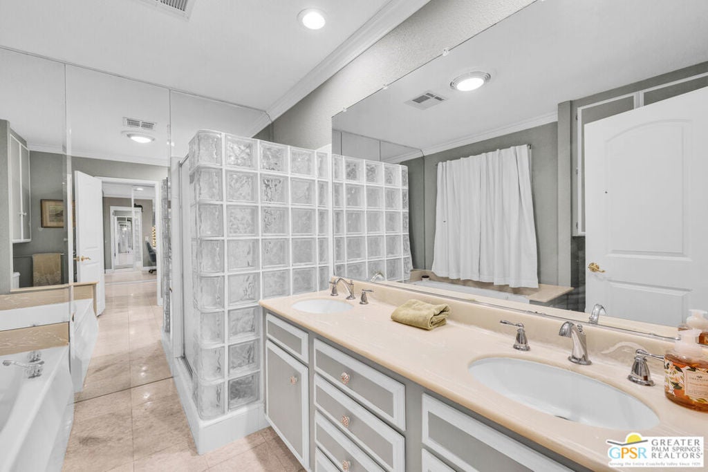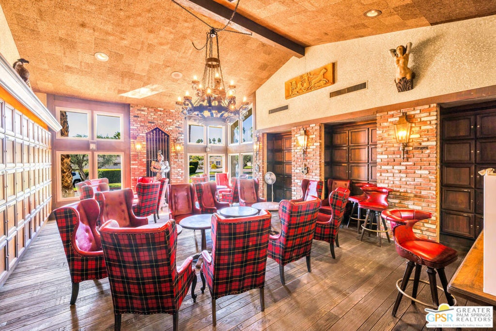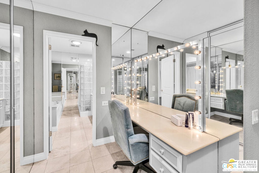 Check all your negative assumptions about a manufactured home and come see this fabulous custom former model home in The Colony in Rancho Mirage. You'll find wow upgrades in every room and million dollar + views from the spacious living room. The oversized lot has room to enjoy the outdoors and an enclosed 2 car garage with a workshop. Live the easygoing Rancho Mirage lifestyle for a reasonable price in a well-maintained, super convenient community. This home has been updated and decorated in keeping with the Hollywood Regency style. You enter thru dramatic double doors to a formal entryway, to the right is a large living / dining room with soaring ceilings, and walls of glass that look onto the garden and toward the mountains. Plenty of built-ins for storage in the dining area. To the left of the entryway is a Den with a built-in bar- great for entertaining. The amazing feature of the bar area is an elegant appliqued glass mirrored wall in a bamboo pattern- very unique! The large kitchen has a walk in pantry, plenty of cabinets and a breakfast area. There are 2 bedrooms and 2 baths. The large primary bedroom has the closets of your dreams. The walk in section of closets has mirrored doors that you can open and use as a 3-way mirror. All opposite a sit down vanity- very glam! There is a spa like bath as well with a separate soaking tub. There are solar shades on the living room windows to help keep the home cool. Lovely mature landscaping surrounds the property. This amazing property will not last long!