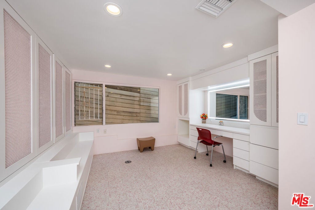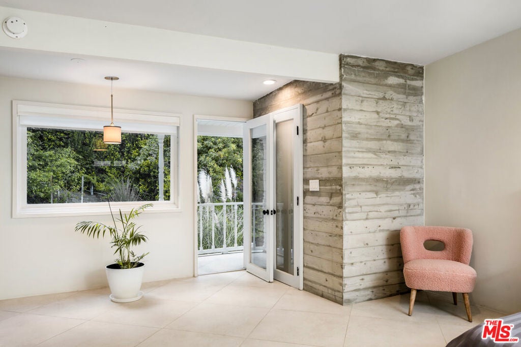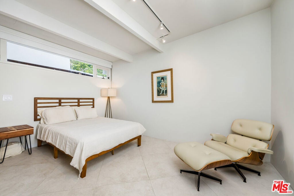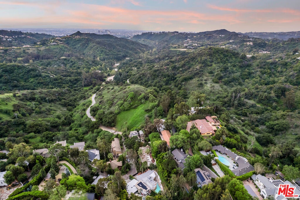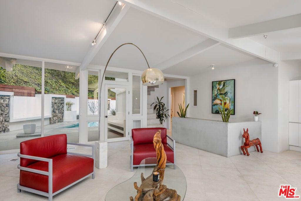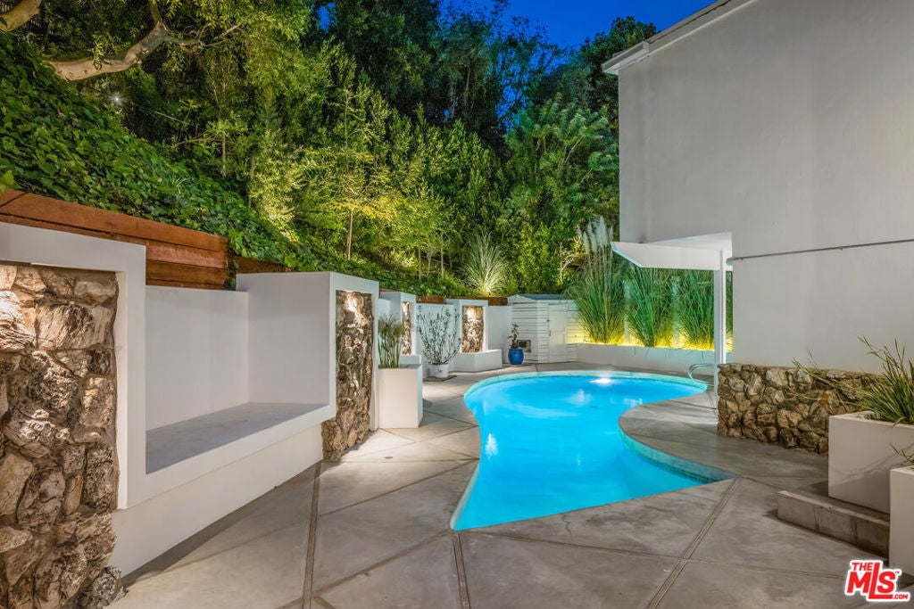 Nestled in the secluded hills of Franklin Canyon, this residence thoughtfully balances mid-century modern architecture with contemporary, material-driven updates. The original structure defined by open volumes, clerestory windows, and expansive walls of glass remains easy to read, while later remodels introduce a textured, organic sensibility that complements the modernist framework. Natural light permeates the open-plan living spaces, reflecting off steel-troweled cement walls and contrasting textures throughout the interiors. A consistent material palette, expressed through the textured fireplace surround, smooth hand-troweled kitchen finishes, and built-in planters, creates a tactile dialogue that bridges eras while preserving architectural clarity. A sculptural concrete and stone fireplace anchors the living room, emphasizing the connection between structure and material. The kitchen, featuring a custom curved island and bespoke cabinetry, serves as a central architectural element, reinforcing the home's focus on flow and craftsmanship. The entire upper level is devoted to the luxurious primary suite, conceived as a serene retreat with a private balcony overlooking the lush, secluded backyard. The suite includes a spa-inspired bath with a cement soaking tub and separate shower, dual closets, and a private water closet with sink. Two guest bedrooms are located on the main level, while a versatile office or glam room on the lower level supports productivity, creativity, or quiet retreat, seamlessly blending function and design. Outdoors, lush palms and hedges ensure exceptional privacy. Built-in concrete benches, framed in the home's original mid-century stone, establish continuity between the front facade and the backyard, while a water feature set within one of the recessed bays provides a serene focal point. Together with a saltwater pool, deck, fire bowl, and intimate lounge areas, these elements extend the modernist ethos seamlessly into the landscape. Situated between Franklin Canyon Park and TreePeople conservation lands, the property offers a rare balance of seclusion and proximity, embodying a home shaped by light, material, and nature.