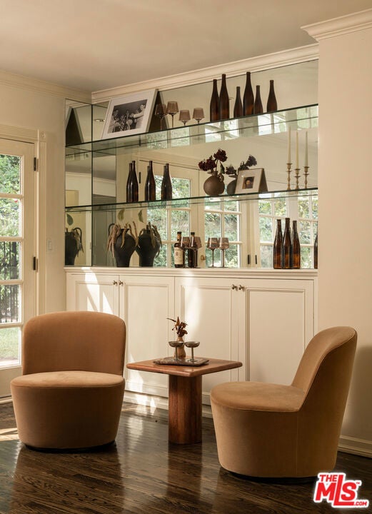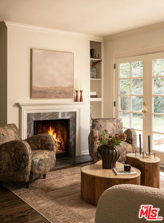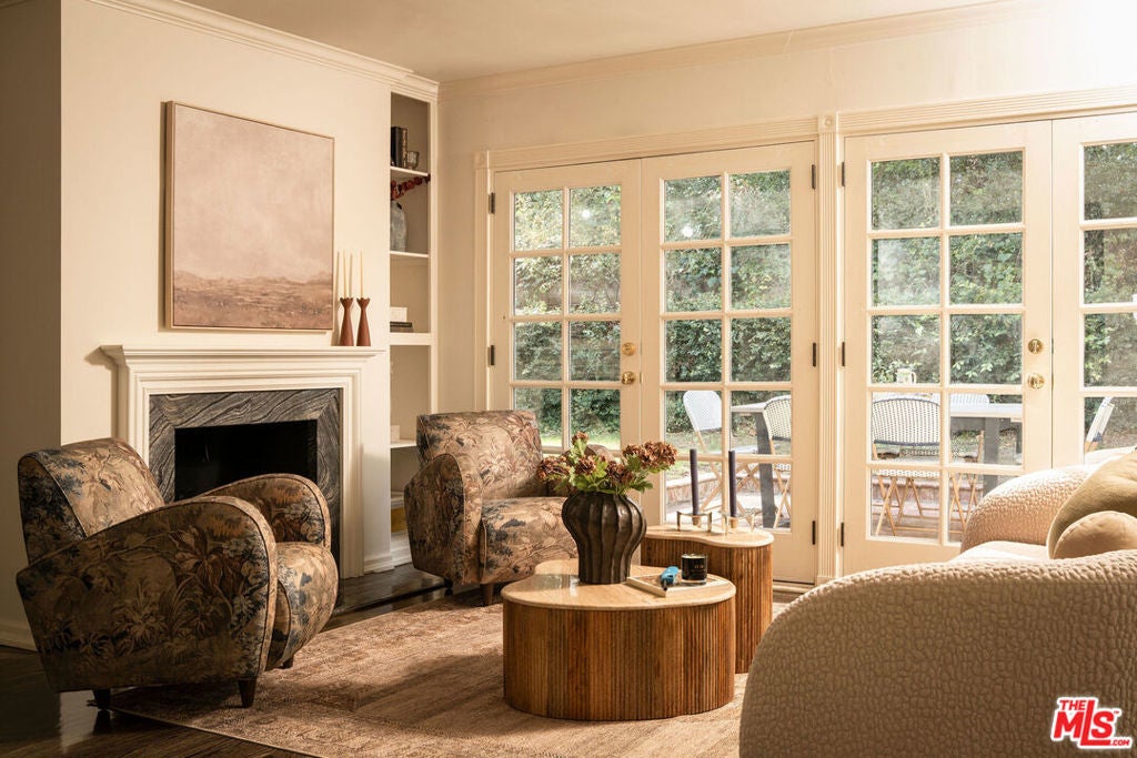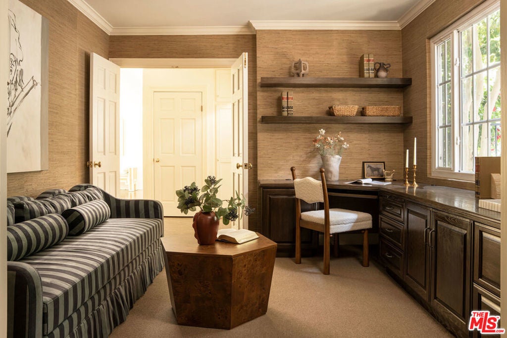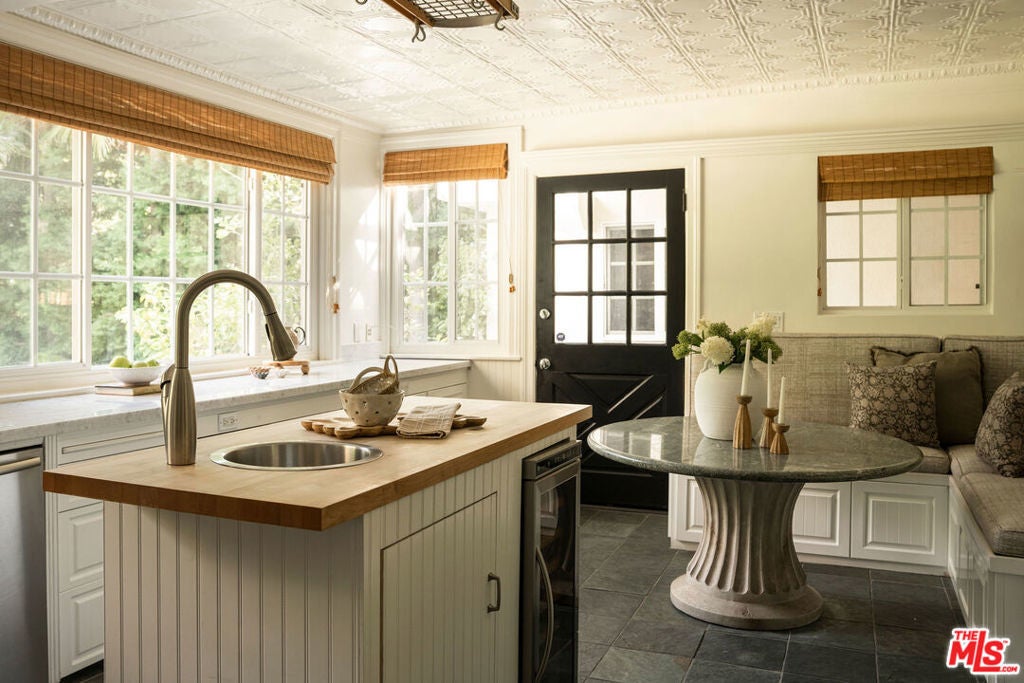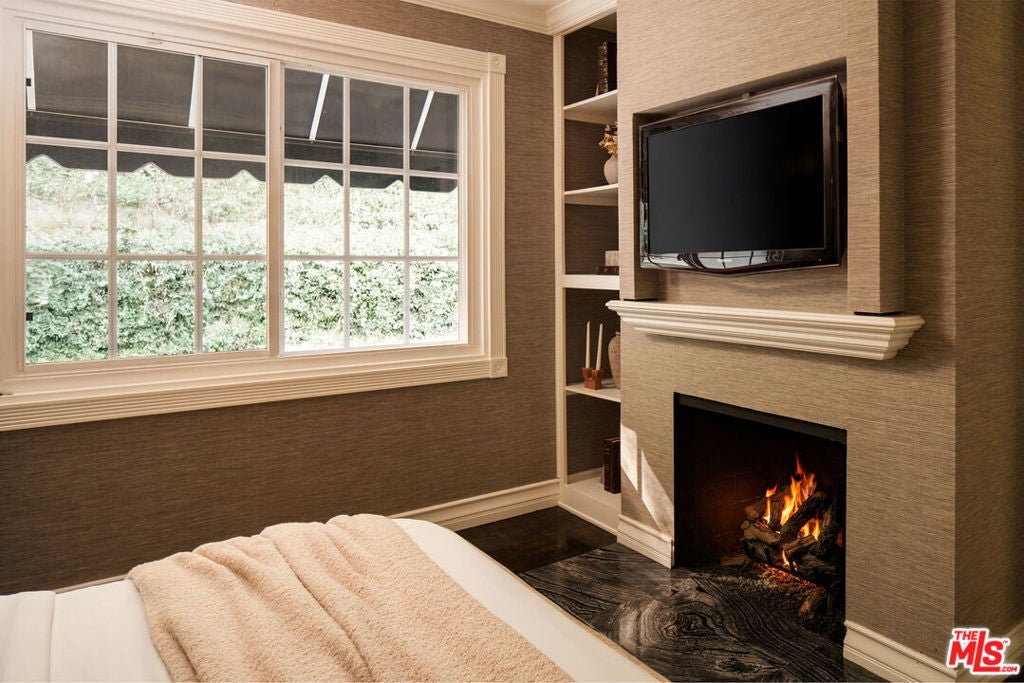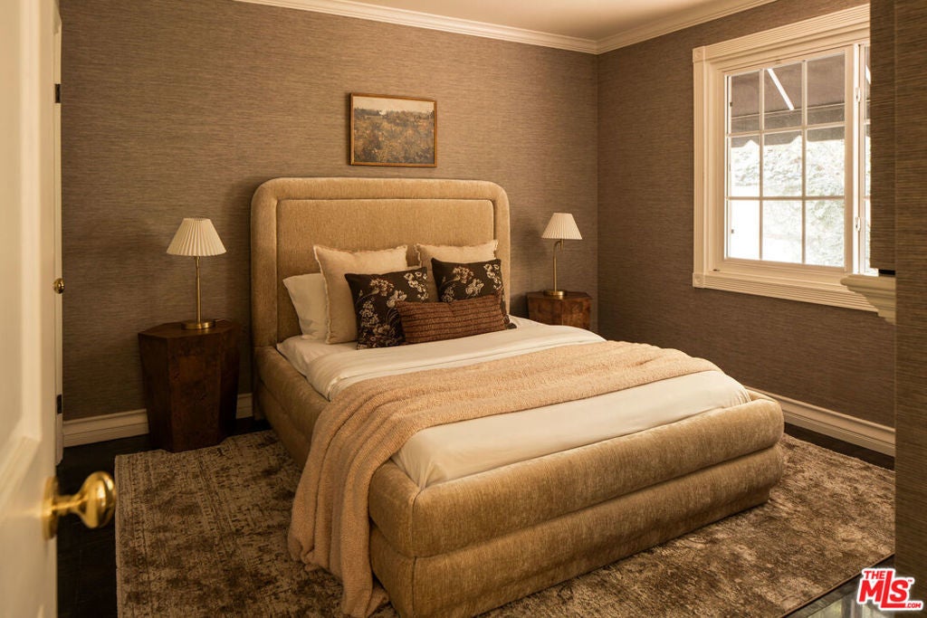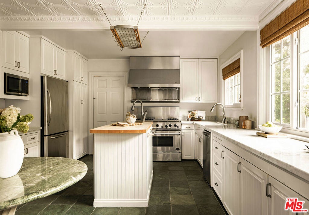 Hidden from the street behind gates and towering 50-foot privacy hedges, this pristinely updated storybook traditional haven promises a charm-filled lifestyle amidst peace and serenity, with three bedrooms + den. A vast circular motor court wraps around the grassy front lawn and leads to the home's exposed-brick entry, its reddish hue complemented by the freshly painted creamy white facade. Inside, fantastic newly refinished dark hardwood floors impressively shine, reflecting natural sunlight welcomed by large picture windows. A bank of French doors lines the formal living room, with its elegant fireplace and dry bar/tasting area. The country kitchen includes a butcher-block island with wine refrigeration, comfy breakfast nook, open shelving, copious cabinetry, farm sink, period tin ceiling, and state-of-the-art stainless-steel appliances. Restored original wainscoting in the adjacent formal dining room adds classic prestige to intimate dinner parties. The primary wing, a true prize of the home, is equipped with a double-door entry, French doors to the backyard, fireplace, built-ins, and a versatile antechamber with a built-in desk, perfect as a television room, office, lounge, nursery, and more. The en-suite spa-inspired bath is complete with radiant floor heating, a glass-enclosed shower and separate oversized tub, subway tile wraparound, and massive department-store-like changing wardrobe with custom organizers, dresser island, makeup desk, and a safe for securing valuables. The guest bedroom is also warm and inviting and features a third fireplace and bath with shower. Outside, dine al-fresco and converse with friends and family surrounded by lush plant life. Or, retreat past terraced rose gardens for calm reflection from a trellis-covered patio, perched above the quaint grounds with delightful views of various treetops and natural ridge line. A detached guest house includes a wet bar, side-by-side laundry, doggy door, and three-quarter bath. In addition to the abundance of storage and deep closets found throughout the home, there is also a bonus storage shed. Parking is for eight to ten vehicles plus a two-car garage. Lovingly updated with modern finishes and gorgeous garden views from every room, this beautiful hidden jewel is move-in-ready and awaits its next chapter. Discover why this ideal location is dubbed Celebrity Row, cherished and private yet just moments to Rodeo Drive and the Westside. Welcome home!
