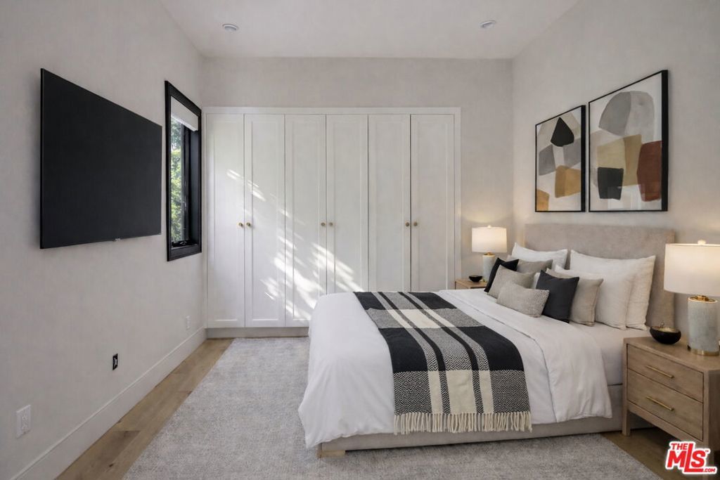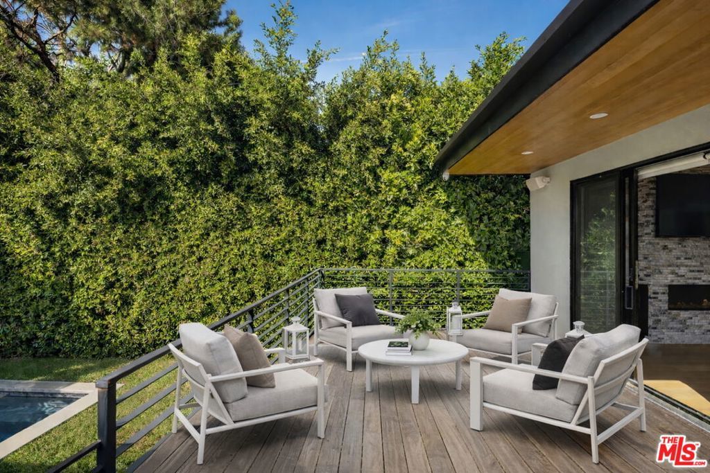 Welcome to this exceptional single-story Modern Farmhouse set on one of Beverly Grove's most coveted streets. Privately gated and hedged, this meticulously designed entertainers home reflects refined architectural intent and uncompromising craftsmanship throughout. A striking 9-foot pivot door opens to a beautiful light-filled living room with a statement fireplace, an expansive picture window, and wide-plank white oak floors. The kitchen and family room flow seamlessly through to an IPE wood terrace, creating an effortless indoor-outdoor lifestyle. Your resort-style grounds feature a newly completed pool and spa alongside a detached, fully permitted ADU/pool house with a kitchen and bathroom, ideal for guests, an office, or a retreat. Interior appointments include 10-foot ceilings, 8-foot solid doors, Emtek brass hardware, Jeld-Wen windows, Sonos audio, and a chef's kitchen with a stunning 12-foot island and bespoke cabinetry. The main residence offers three bedrooms and two and a half baths, complemented by a storage basement and a turnkey ADU with mini-split HVAC. A rare offering where timeless design, modern comfort, and privacy converge, crafted for those who value discretion, quality, and effortless living.