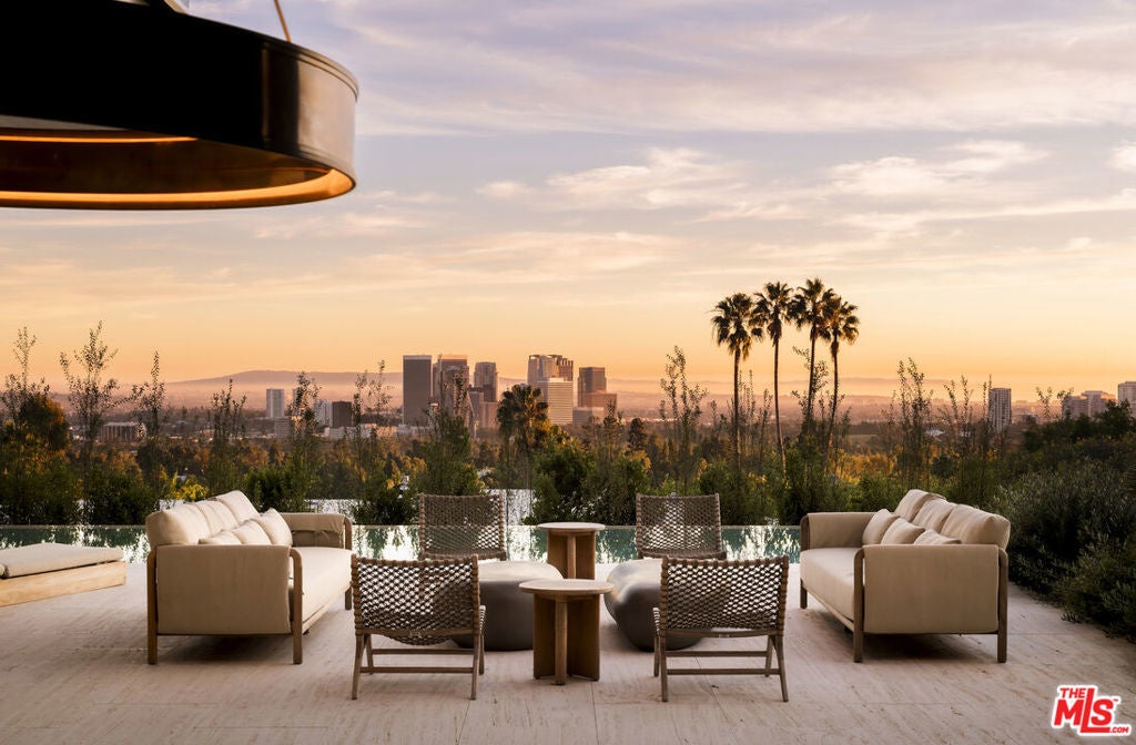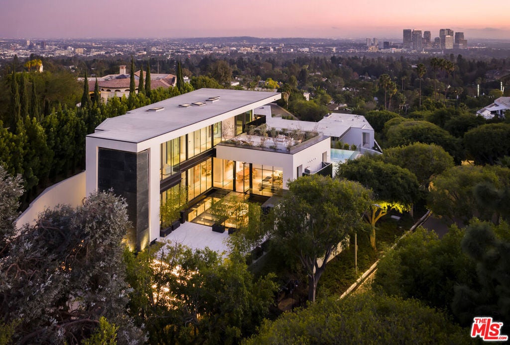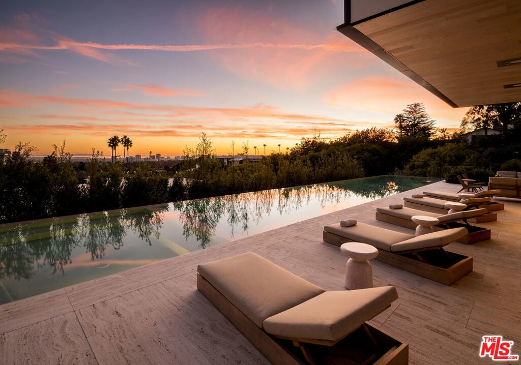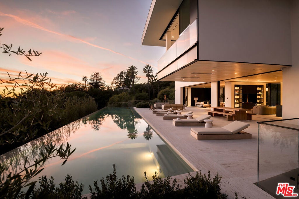 Exceptional design meets refined luxury in this brand-new Beverly Hills architectural masterpiece, set behind privacy gates on a secluded promontory with truly explosive panoramic city-to-ocean views offering the rare combination of dramatic vistas and effortless convenience just moments from the Beverly Hills Hotel and the heart of the city. Created by renowned architect Paul McClean with interiors by Waldo Fernandez, this one-of-a-kind residence is a study in meticulous craftsmanship and elevated modern warmth. Behind the gates, twin marble waterfalls frame a dramatic entry, leading to illuminated travertine paths and a striking glass bridge that reveals the home's stunning three-level design. Walls of glass, soaring wood-paneled ceilings, and contrasting accents create a seamless indoor-outdoor flow reminiscent of the world's finest private resorts. An elevator services all levels, enhancing ease and livability throughout. The main level features formal living and dining areas, a kitchen as well as a chef's kitchen with Miele appliances, wine cellar, and private office. Pocketing glass doors open to an expansive outdoor oasis with a full-length infinity pool, jacuzzi, baja ledge, and multiple dining and lounge areas overlooking the skyline ideal for hosting events, parties, and effortless gatherings with quick access for Uber and pick-ups. The upper level is dedicated to a serene primary retreat with a terrace, fireplace, spa-like bath, and dual closets, as well as a secondary bedroom. Below, a dramatic atrium anchors a complete entertainment and wellness floor with guest suite, gym, sauna, steam room, massage room, onyx bar, and a state-of-the-art private home theater - creating the ultimate "vacation-at-home" lifestyle. The home offers exceptional gated parking capacity, including an oversized garage and additional space within the motor court, providing rare flexibility for events, staff, and guest arrivals, all complemented by generous street frontage for convenient overflow parking. A rare opportunity to own a true trophy property offering unparalleled design, privacy, resort-level amenities, and unmatched proximity to the very best of Beverly Hills.
