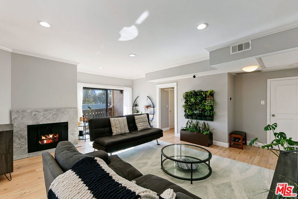 $100,000 price improvement, as the Seller is motivated. This bright, second-level, south-facing, nearly 1,400 sq ft unit offers open views toward the Pacific Design Center. The remodeled kitchen is appointed with Silestone countertops, stainless steel appliances, and a glass-tile backsplash, with a bar counter perfect for entertaining before stepping out to some of LA's best nightlife. Engineered oak flooring run throughout the living areas, complementing the open and inviting layout. Bathroom has floating glass shower doors, tiled walls, and a double-vanity in the primary suite. Ideally located in the heart of West Hollywood, near to the Design District, renowned dining, shops and bars along Santa Monica Boulevard, the Sunset Strip, and neighborhood events. Two side-by-side parking spaces, a dedicated storage room, and in-unit laundry complete the offering. Lobby and elevator updates, refreshed gym, and updated pool side rec room all go towards making 832 Palm Ave a great place to be.