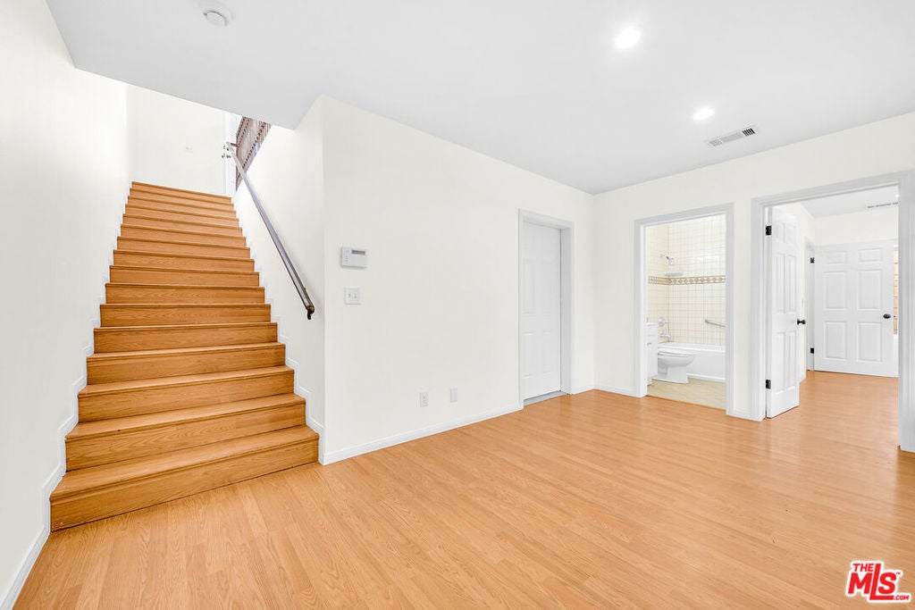 Located within a fully gated and hedged compound, this unattached, two-story front house offers the perfect blend of privacy and Central LA conveniences, with access to Hancock Park, Larchmont Village, and West Hollywood. Thoughtfully updated for modern living, the residence features wood-style floors, central A/C, and a front garden. The flexible floor plan includes three bedrooms and a unique converted garage studio, perfect for a home office or creative den. The upper level serves as the heart of the home with a bright, open-concept living room, balcony, dining area, and kitchen. The lower level offers versatility, including a bedroom, full bath, and a spacious recreation room with kitchen facilities. Outside, enjoy seamless indoor-outdoor living in your exclusive, shaded front yard, a rarity in this area. With no shared walls and its own entrance, this home feels like a private single-family estate. Available for immediate move-in.