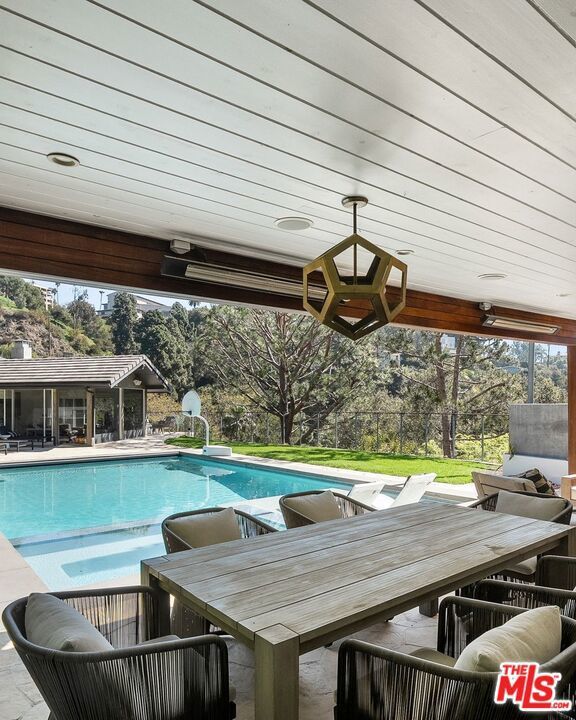 Perched above Sunset Boulevard, this fully furnished and reimagined Brentwood estate offers a rare balance of serenity and sophistication. Set on over an acre of grounds, the residence unfolds across nearly 6,000 sq ft with 6 bedrooms and 7 baths, all enhanced by a 2012 renovation that introduced modern finishes and an airy open plan. Floor-to-ceiling windows frame lush hillside vistas, while light-filled interiors showcase contemporary fireplaces and seamless indoor-outdoor living. The chef's kitchen, designed with quartz counters, custom cabinetry, and premium appliances, anchors the home with both beauty and function.Tailored for entertaining, the estate features a sleek indoor bar, a private theater with convertible guest suite, and an expansive backyard retreat complete with resort pool, cabana, outdoor kitchen, and professional putting green. Smart technology and thoughtful upgrades including solar power, EV charging, a natural gas generator, and water filtration add ease to everyday living. A true sanctuary in one of Los Angeles' most prestigious neighborhoods.