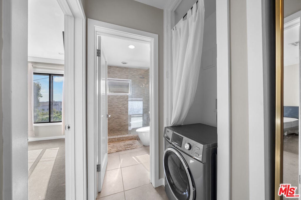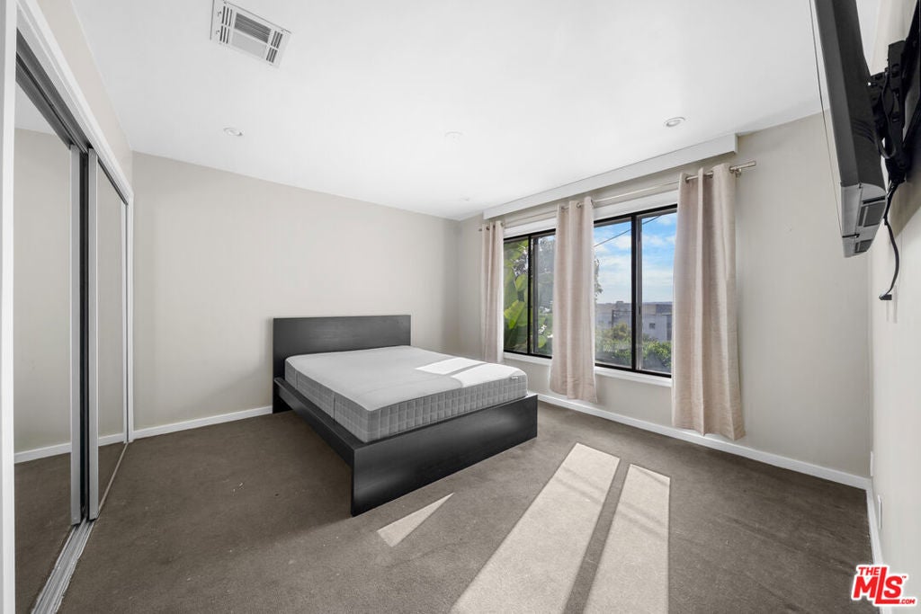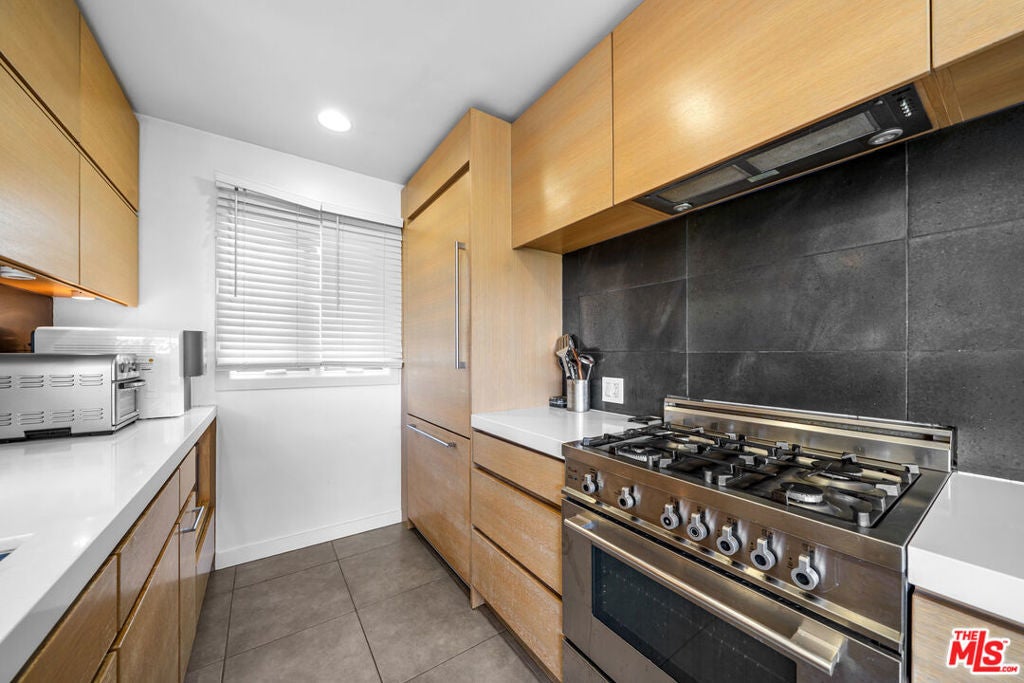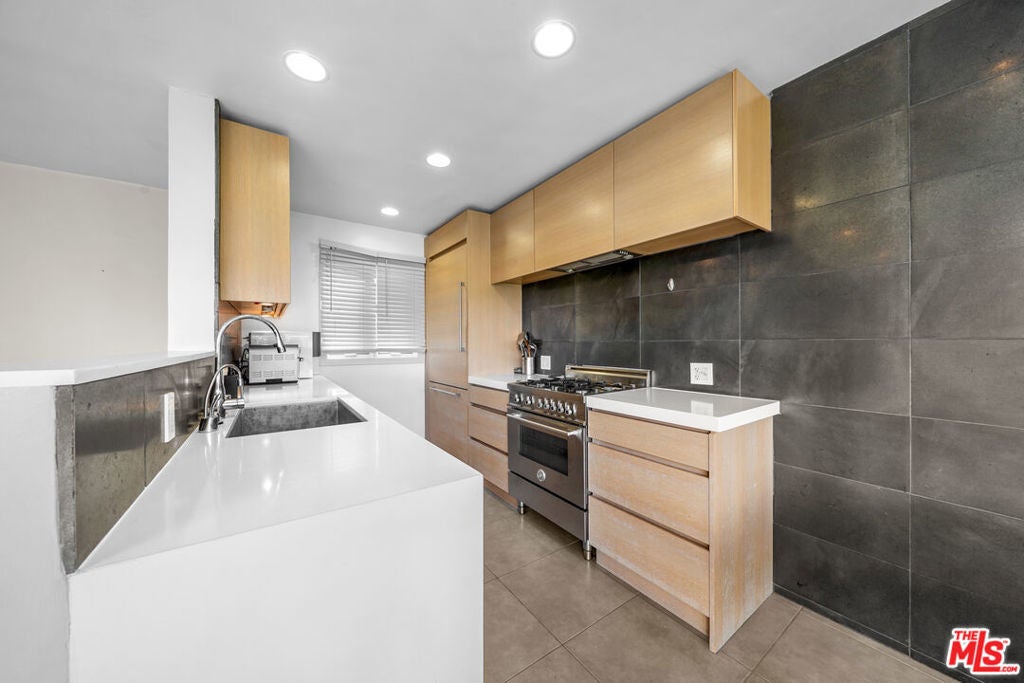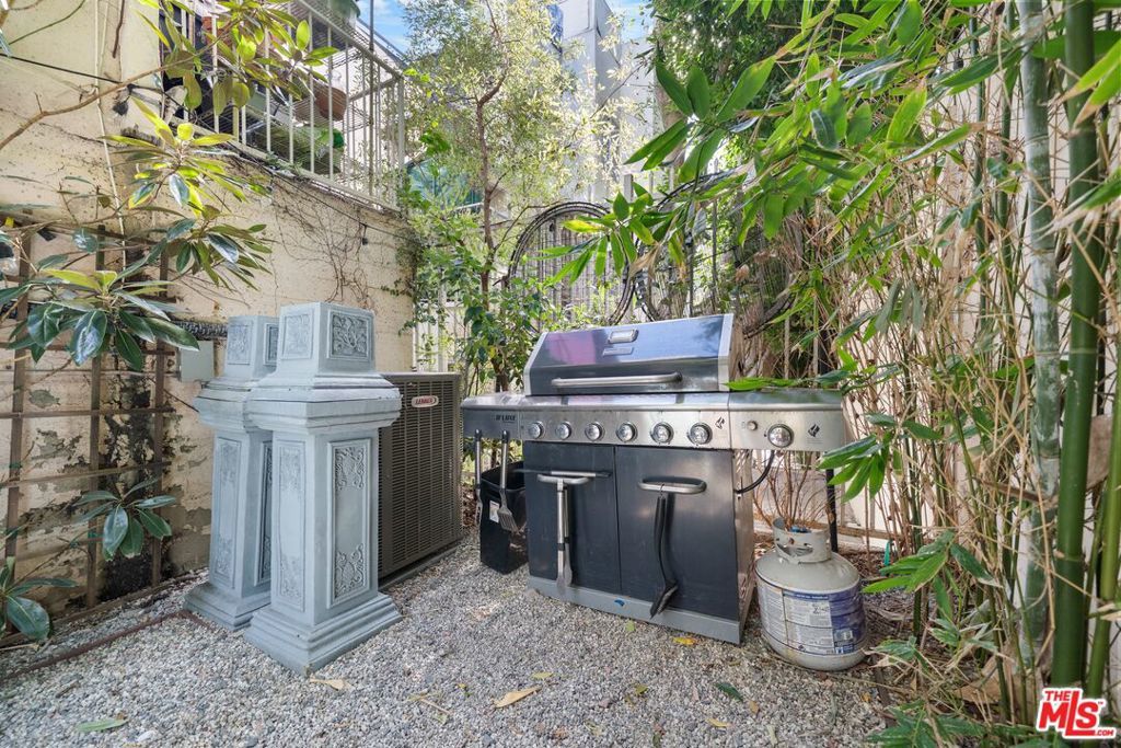 Set in a classic mid-century building, once the backdrop for several iconic David Hockney paintings in the 1960s, this rare, front-facing top-floor condo captures the essence of West Hollywood living. Floor-to-ceiling windows flood the home with natural light, framed by swaying palm fronds, while an open floor plan with recessed lighting offers a seamless flow throughout.The kitchen is thoughtfully designed with Caesarstone countertops, under-cabinet lighting, a stainless-steel Bertazzoni range, and a refrigerator and dishwasher discreetly integrated into the cabinetry. The primary bedroom and bathroom enjoy peekaboo views of downtown, while both bedrooms feature double-paned windows for added comfort and sound insulation. A full bathroom with a tiled shower and an exceptionally long hallway closet provide ample storage.The well-maintained complex offers a pool, laundry room, BBQ area, secured key-fob entry, one-car garage parking, and two additional storage spaces. Enjoy easy access to top coffee shops, restaurants, boutiques, Sunset Plaza, and iconic music venue, plus Santa Monica Blvd nightlife just moments away, without the noise.