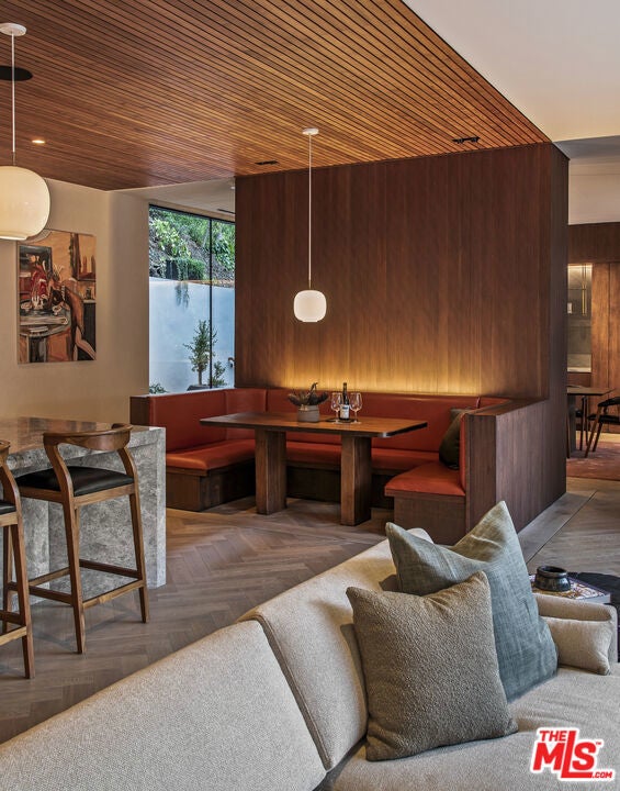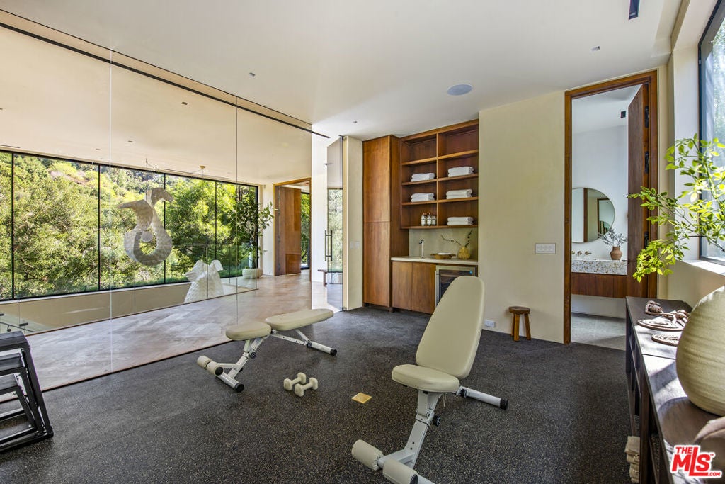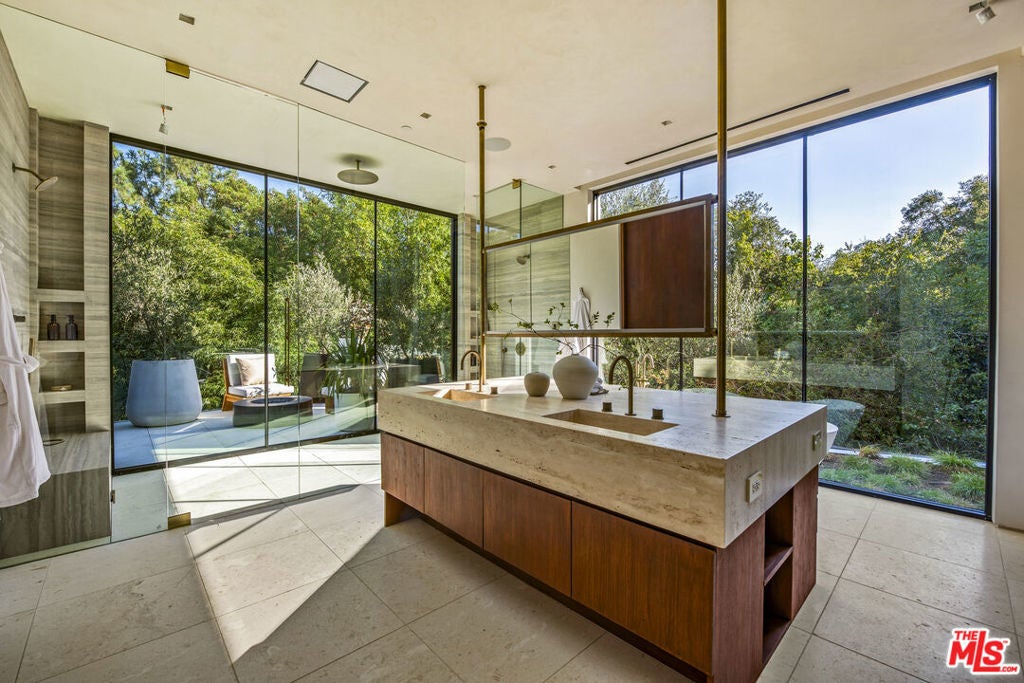 The Hutton House is a rare architectural sanctuary, where transitional Scandinavian modern design meets privacy, nature, and understated luxury in one of Beverly Hills' most coveted settings.Set behind gates on nearly an acre and enveloped by mature oak trees with tranquil canyon views, this newly constructed six-bedroom, nine-and-a-half-bath estate, interior designed by Abramson Architects, offers a level of serenity and seclusion that is increasingly difficult to find. The exterior blends warm teak wood siding with sculptural black basalt stone, softened by mature hedging that creates a true sense of arrival.Inside, soaring ceilings and expansive Fleetwood pocket doors dissolve the boundary between indoors and out, filling the main living spaces with natural light and an effortless sense of flow. Organic, bespoke finishes and carefully curated materials lend the home a calm, resort-like ambiancerefined, warm, and timeless.The heart of the home is a chef's kitchen designed for both daily living and entertaining, anchored by a striking 15-foot custom stone island, top-tier Miele appliances, an intimate breakfast nook, and an automated pop-up window that opens seamlessly to outdoor dining and lounge areas.Upstairs, the primary suite is a private retreat overlooking the canyon, featuring dual custom closets, a sculptural plaster floating fireplace, a secluded deck, and a spa-inspired bath with steam rain shower and custom birchwood sauna. A state-of-the-art gym is also located on this level, allowing for wellness and relaxation within the home's most private wing. An expansive 50+ foot skylight floods the upper level with natural light, while four additional bedroom suites extend to private outdoor decks, reinforcing the home's connection to its natural surroundings.A floating staircase highlighted by a one-of-a-kind chandelier art installation acts as both a functional element and sculptural centerpiece. Below, the lower interior level is dedicated to entertainment and leisure, featuring a tiered private theatre, temperature-controlled wine storage, and thoughtfully designed gathering spaces ideal for evenings in or hosting intimate events.Outdoors, the estate unfolds in layered fashion. The upper grounds are anchored by a zero-edge infinity pool and spa with swim-up bar, multiple fire pit lounges, and fully equipped outdoor kitchensdesigned for both large-scale entertaining and quiet moments of retreat. Below, a private outdoor lower level reveals a full pickleball court with stadium-style seating, set into lush landscaping, a grassy knoll, and handcrafted water features, creating a resort-style experience rarely found in a private residence.Additional amenities include a secondary chef's kitchen, private office with custom cabinetry, Savant-powered smart home technology, two well-appointed laundry rooms, a showcase three-car garage, and additional parking for up to ten vehicles. The residence is also offered with custom-designed indoor and outdoor furnishings created specifically to complement the home's Scandinavian aesthetic.The Hutton House is not simply a home, it is a composed and intentional environment where architecture, nature, and privacy coexist in perfect balance. A truly rare offering just minutes from the heart of Beverly Hills, designed for those who value quiet luxury, thoughtful design, and a life well lived.