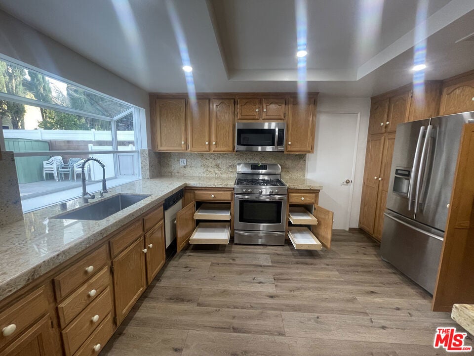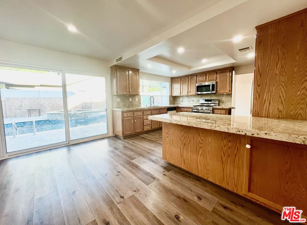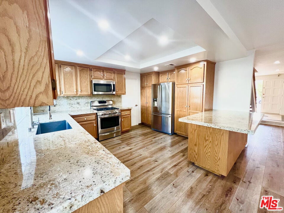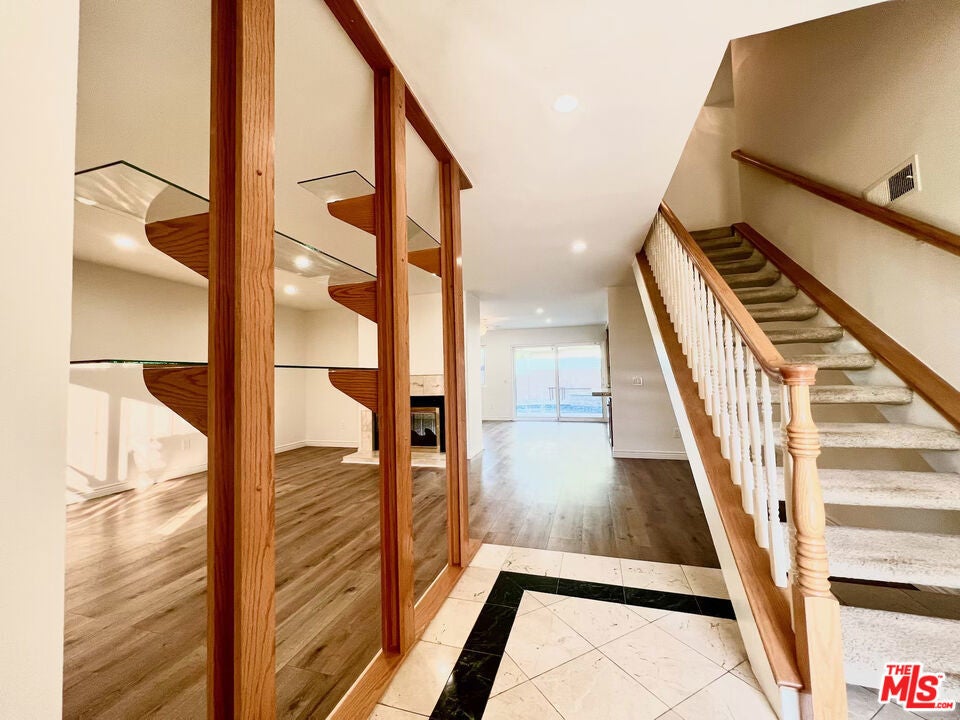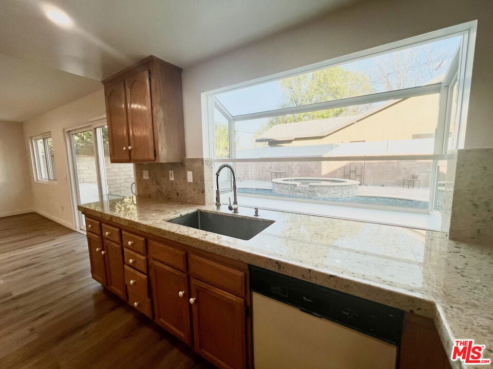 This must-see 3-bedroom, 2.5-bathroom home features numerous upgrades and is located near Desoto and Roscoe. The main level boasts a beautiful marble floor entrance leading into a living room with recessed lighting and a double-sided fireplace shared with the family room. The upgraded kitchen includes marble countertops, a matching breakfast bar, wooden laminate flooring, and custom pull-out drawers for easy access to the pantry and cookware. From the family room, sliding doors lead to a backyard featuring a salt-heated pool, a jacuzzi, and a convenient outdoor shower. Upstairs, the sunlit primary bedroom includes a walk-in closet and an ensuite bathroom. Two additional bedrooms, a full bathroom, and a large linen closet complete the second floor. Key features and upgrades include: -15 paid-off solar panels - EV charger - New plumbing and copper piping - Double-paned windows - Nest thermostat and home security system - Double front door entrance with an upgraded glass screen door - Low-maintenance yard with front turf and a concrete backyard. - Separate Formal dining room. Please call to schedule a showing.