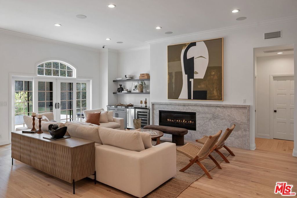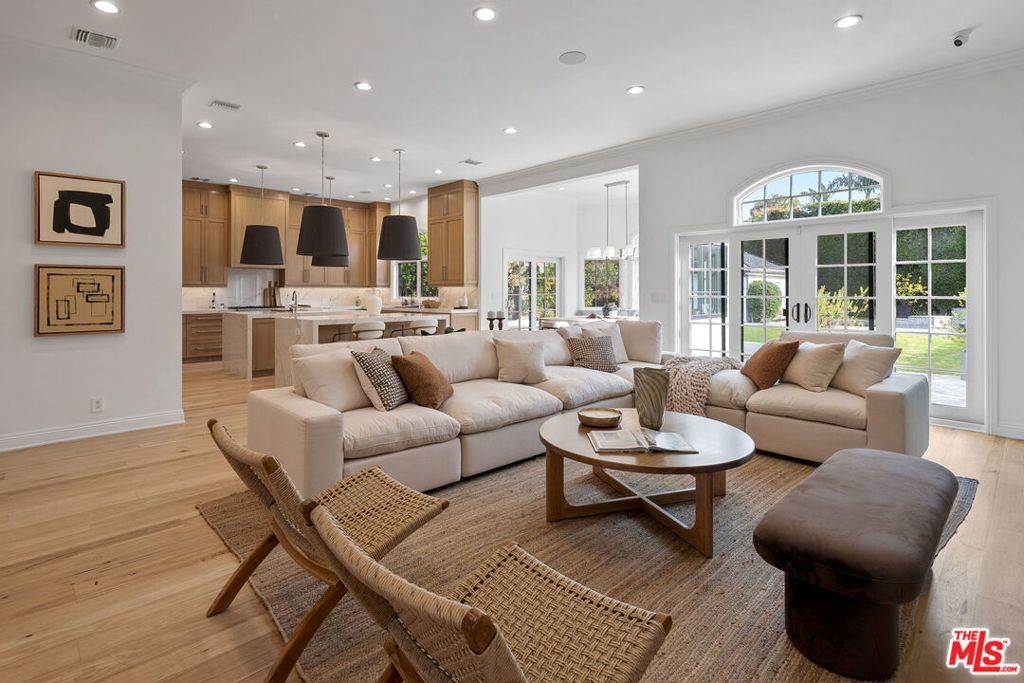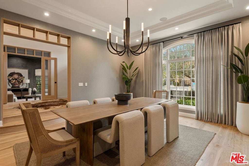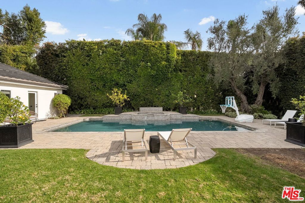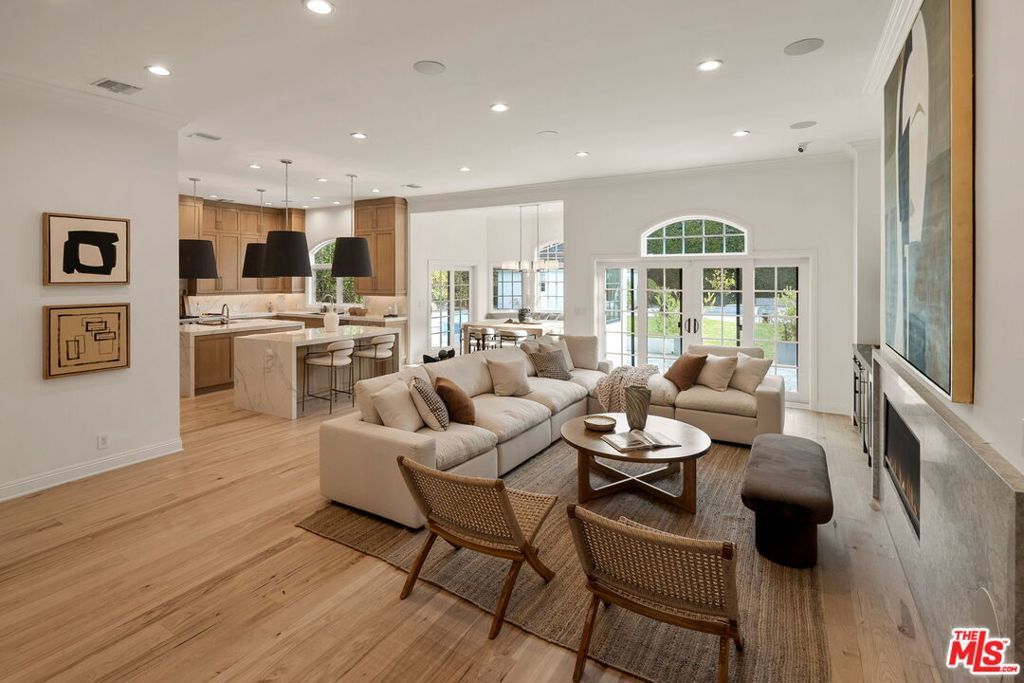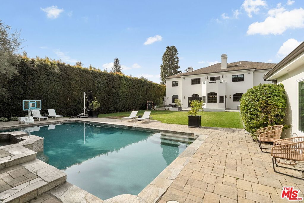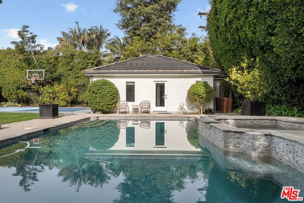 Located on one of Brentwood's most coveted streets, Homewood Road, this newly reimagined estate offers a sophisticated balance of timeless design and effortless California living. Thoughtfully renovated by the current owner, the residence spans approximately 6,800 square feet on an expansive, flat 18,359-square-foot lot. A grand double-door entry opens to a sun-filled foyer with soaring 23-foot ceilings, immediately establishing the home's sense of scale and light. The main level is designed for both refined entertaining and everyday comfort, featuring a formal dining room overlooking the gardens, a dedicated theater, and an expansive great room where a double-island chef's kitchen seamlessly connects to the family room and outdoor living spaces. The kitchen is appointed with custom wood cabinetry, marble countertops, professional-grade appliances, and a walk-in pantry, while a window-wrapped breakfast nook enjoys tranquil views of the pool and grounds. Two generously sized bedrooms and a full laundry room complete the main floor. The upper level hosts four en-suite bedrooms, each with walk-in closets, including a luxurious primary suite with a private sitting area, office, and dual walk-in closets, one currently configured as a fitness studio. Set behind lush landscaping, the resort-style backyard features a sparkling pool and spa, multiple outdoor lounging and dining areas, and a broad lawn ideal for recreation. Additional amenities include a private pickleball court and a fully permitted two-bedroom, one-bath guest house with its own laundry. Situated within the coveted Kenter Canyon Elementary School district and surrounded by Brentwood's finest estates, this exceptional property offers a rare combination of scale, privacy, and modern elegance in one of Los Angeles' most desirable neighborhoods.