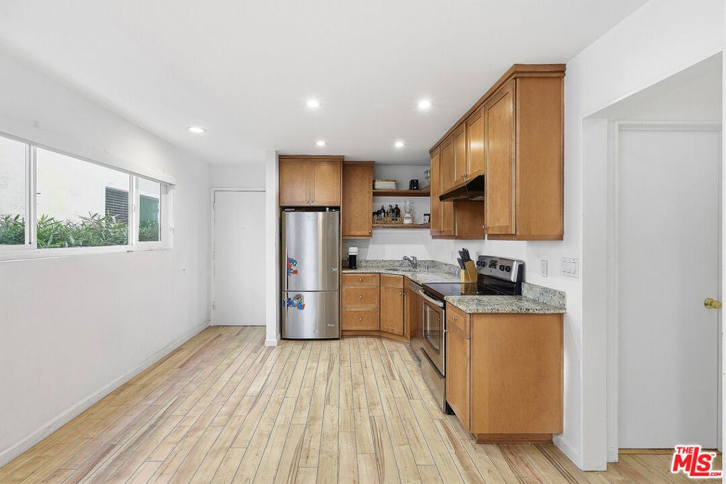 Live just half a block from Venice Beach in this welcoming 2 bedroom, 1 bathroom ground-floor apartment at 1914 Pacific Ave. Nestled in a charming 4-unit building steps away from the boardwalk, this unit delivers effortless coastal living in a highly walkable location. The inviting living room with fireplace flows into an open kitchen equipped with built-in appliances, creating an easy, functional layout. Two comfortable bedrooms feature ceiling fans, and engineered wood flooring runs throughout for a clean, cohesive feel. Head up to the shared rooftop deck for sweeping ocean and city views--ideal for sunset lounging, morning coffee, or casual outdoor dining. Moments to the sand, bike path, and Abbot Kinney's shops, cafes, and restaurants, this is your chance to tap into authentic Venice Beach living. Park the car, grab your board or beach cruiser, and make the coastline part of your daily routine.
