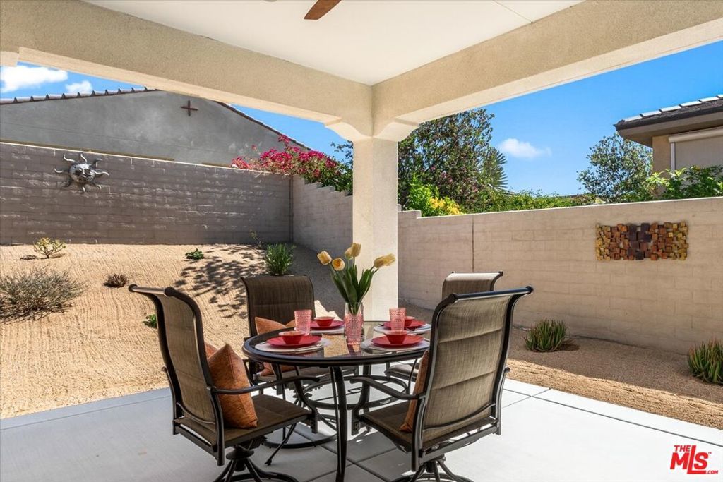 93 Cabernet is located in Del Webb Rancho Mirage, a 55+ gated community. It is an immaculate, warm, inviting PRESERVE model, Elevation A, 2008 sq ft. Upgraded with a 42" entry door, ceramic tile flooring in every room, custom double barn doors, floor outlets, an Executive kitchen island, and ceiling fans. "Kitchen Aid" high-end, stainless steel appliances. Tasteful granite/quartz countertops, along with gorgeous backsplashes, are featured in the kitchen, oversized laundry room, and two bathrooms. The primary room has a barn door to privatize the primary bath, a glass walk-in shower, and a large walk-in closet. You will see matching custom hardware throughout the house in all rooms and cabinets. The sellers did not miss a beat when building this amazing home. The colors throughout are specifically designed to complement the property's unique character. The second bath has also been upgraded to the best that Pulte offered. This home is located in Phase 1, in a tranquil corner of the community. Close to walking paths and the clubhouse, which is surrounded by gorgeous landscaping. You do not want to miss seeing this home. OWNED SOLAR. Upgraded garage door, glass windows, and a 2.5-car garage. Easy to view. When you are not in your beautiful home, this community is known for its active lifestyle. There are more than 30 activity groups and five golf groups. There is pickleball, tennis, bocce ball, two swimming pools, and a state-of-the-art fitness center with the most spectacular views of the mountains. The social committee plans many community events at the clubhouse, including concerts, plays, trivia nights, and more. The ballroom is perfect for more formal events like weddings. You can do anything you want in this community.