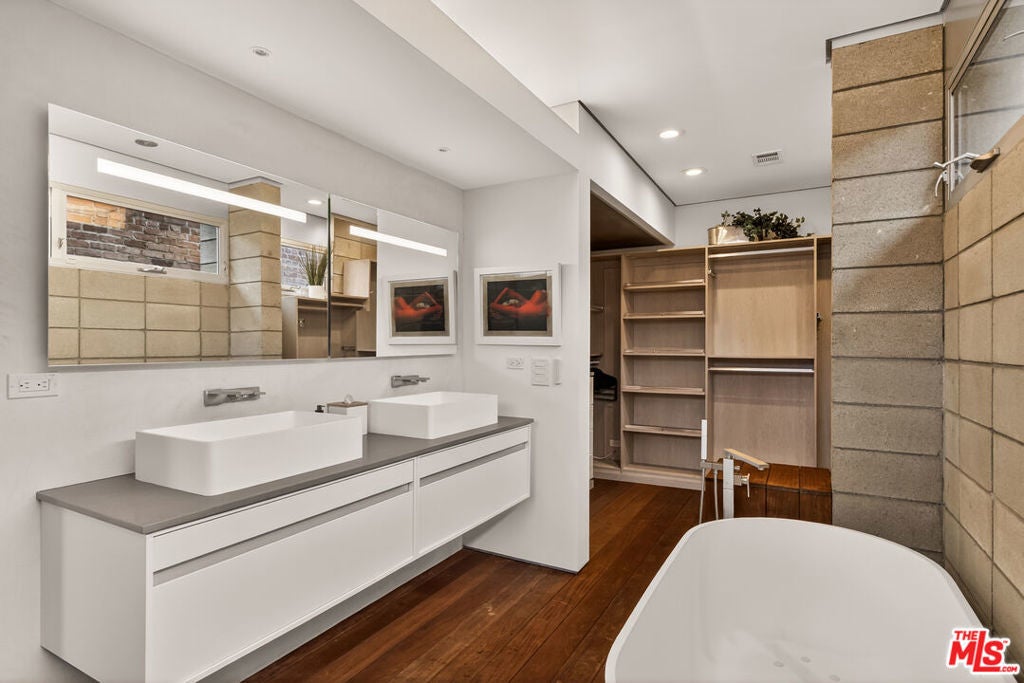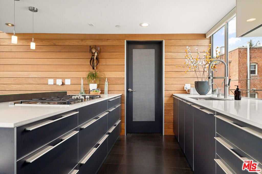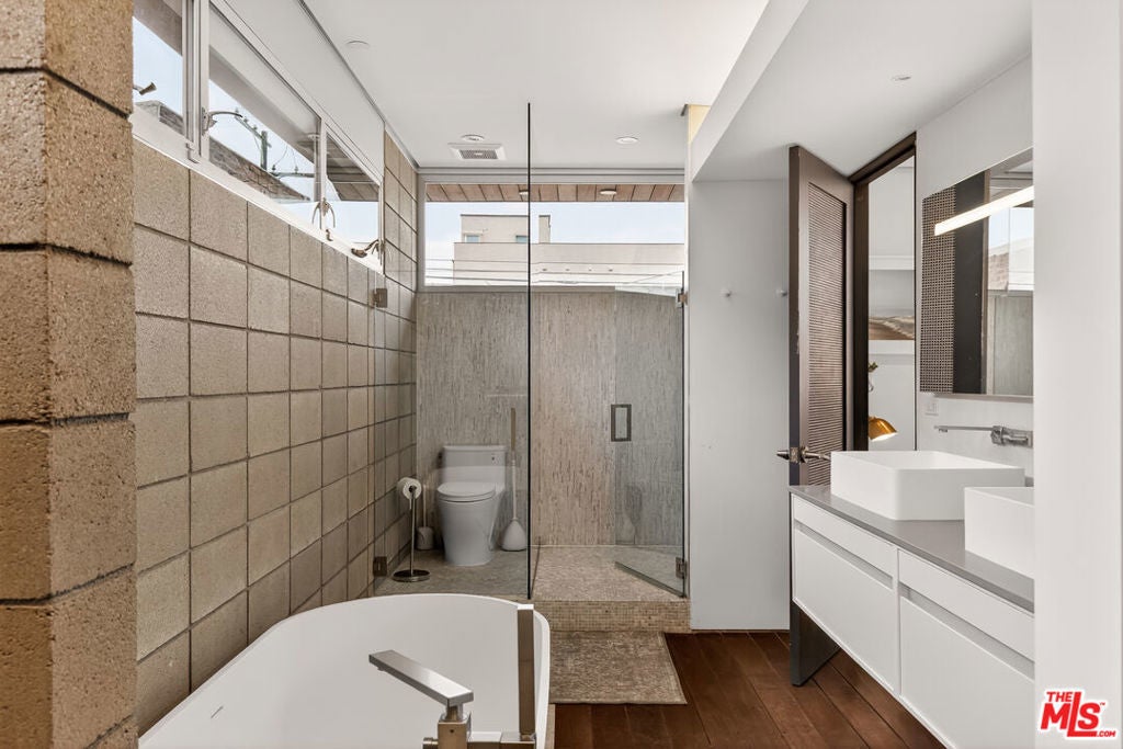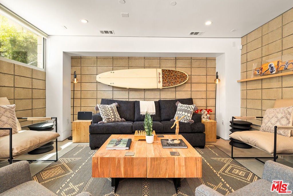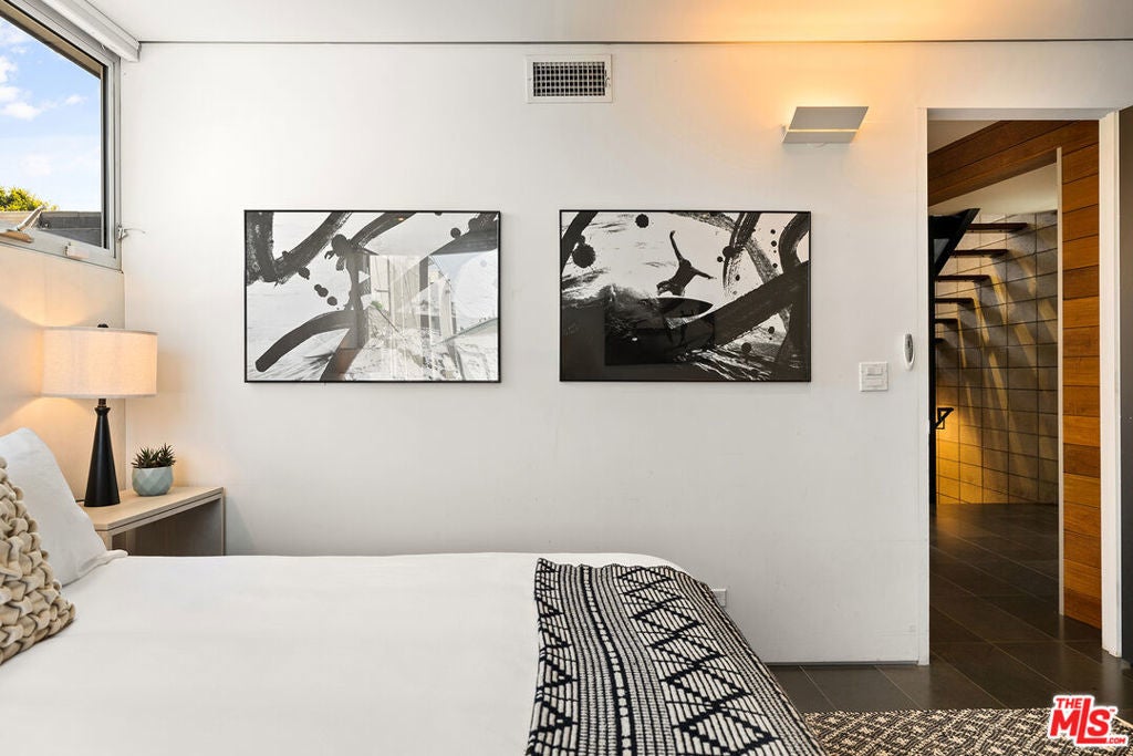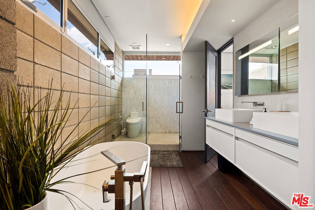 Ocean views abound from this architectural statement in the heart of Venice, just moments to the beach and Abbot Kinney. Designed by renowned architect Bill Adams, FAIA, this three-level residence pairs striking modern lines with a warm, livable layout made for true indoor-outdoor California living. The sun-drenched main level features soaring ceilings, oversized windows, and dramatic walls of glass that slide open to a wraparound deck perfect for sunset cocktails, coastal breezes, and effortless entertaining around a sleek gas fireplace, with an outdoor fire pit just beyond. The chef's kitchen anchors the space with a generous center island and a picture-window sink framing mountain views, while a versatile loft above offers an ideal home office, creative studio, or den.On the bedroom level, three en-suite retreats and a dedicated laundry area provide comfort and privacy, including a serene primary suite with a spacious dressing area/closet and a luxurious soaking tub. The lower level delivers a fabulous media room or flex space opening to a private patio, plus direct entry to a two-car garage. Play on the sand by day, then take in Venice's golden-hour glow from your ocean-view rooftop deck an exceptional modern beach home with every luxury, in one of LA's most iconic neighborhoods.