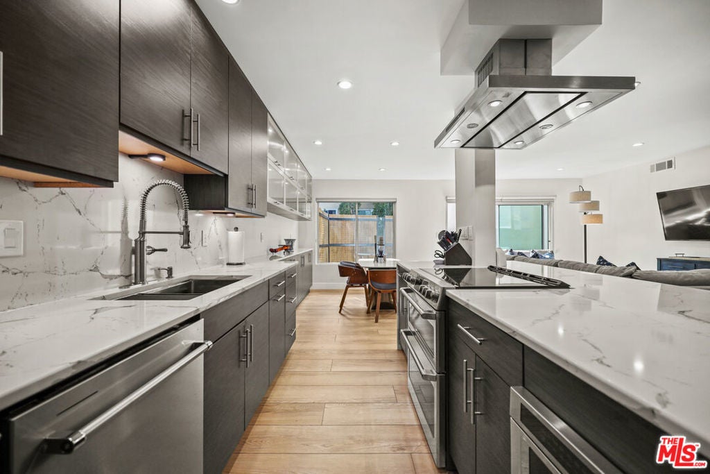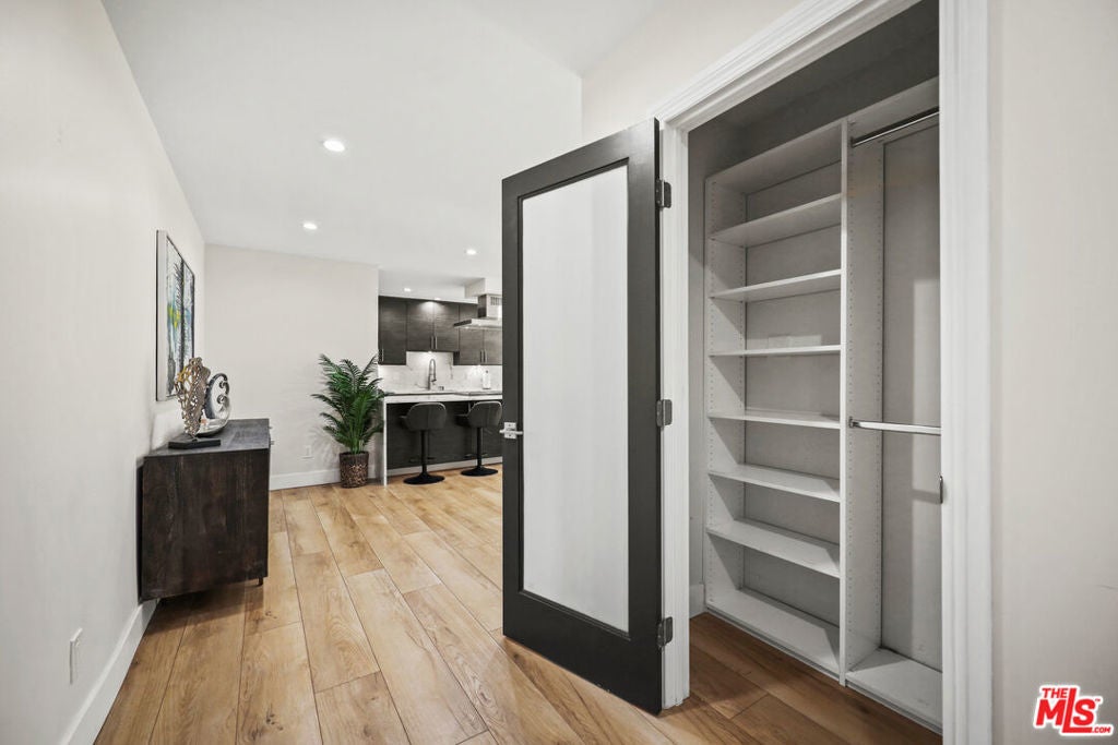 In the heart of West Hollywood, just off Kings Road and steps from Gelson's, this home puts you at the center of it all, where morning coffee, groceries, and dinner plans are all a quick stroll away. You are minutes from Plummer Park for an easy reset, and close to West Hollywood Park and the West Hollywood Library for workouts, laps, and a beautiful place to post up with a book. Inside, the space feels crisp, calm, and thoughtfully upgraded. The kitchen is designed for real life and real hosting, with stainless steel appliances, a KitchenAid refrigerator, a dishwasher, farmhouse sink, and tons of storage, plus an island that naturally becomes the gathering spot with barstools pulled up and drinks poured. The living area is genuinely spacious with a dedicated dining zone, a large coat closet, and abundant storage that keeps everything looking clean and uncluttered. The primary suite reads like a retreat, complete with a walk in closet and an en suite bath featuring a Toto toilet. The second bedroom is brilliantly flexible with an installed Murphy bed, so it can instantly shift from guest space to office to workout room without sacrificing flow. A shared outdoor patio space adds an airy indoor outdoor moment that feels especially right for WeHo evenings. When you want to lean into the neighborhood, you are close to the Pacific Design Center and the shopping and dining energy around Melrose, including Cecconi's for a classic patio meal.