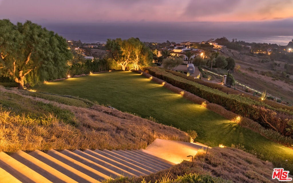 Enter through a grand metal, glass, and wood front door framed by a stone doorway, where breathtaking ocean views immediately greet you. The foyer boasts soaring wood-beamed ceilings and a chandelier, setting the tone for refined elegance. To the right, the formal dining room features high wood-beamed ceilings, arched entryways, and a butler's pantry. Steps lead down to the Main Gallery, lined with barrel ceiling arches and light fixtures. The chef's kitchen is designed for both beauty and functionality, featuring an oversized island with bar seating, stone counters, and wood-beamed ceilings. Premium Wolf appliances, including a double oven stove, additional wall oven, six-burner range, pot filler, and hood fan, complete the space. A Subzero fridge, freezer, and refrigeration drawers provide ample storage. Adjacent, an ocean-view breakfast nook offers stunning pool and coastline vistas. The Family Room includes two sets of French doors opening to the backyard and also features a sliding folding wall system/accordion doors leading to the loggia. An outdoor fireplace and heaters extend the living space year-round. A second living area, accessed through a stone-lined hallway, showcases French limestone floors, an Antilles fireplace, and panoramic ocean views. Behind it, a wet bar with Italian marble countertops with a leather finish, built-ins, and a mini fridge enhances the space.Upstairs, ocean-view bedrooms feature wood floors, large closets, and en-suite baths with stone counters and showers. A guest suite boasts a balcony, high ceilings, and pink marble counters with a shower-over-tub design. The primary suite is an exquisite retreat with a fireplace, a wet bar with a mini fridge, and two expansive closets. The second primary bath features a freestanding jetted tub, a double sink vanity, a shower stall with ocean views, and a private water closet. A stately library off the Main Gallery includes custom built-ins, a cupola, a rolling ladder, and French doors opening to the backyard. An elevator provides convenient access to all three floors. The entertainment level features French limestone floors, a bar with a marble countertop, stone counters, a sink, and a mini fridge. A full gym and a movie theater, which seats 20 comfortably, complete the space.The backyard is a breathtaking sanctuary, with a formal rose garden, an infinity pool with panoramic ocean views, and an outdoor kitchen with a BBQ and bar seating. A built-in couch surrounds a fire pit. Steps lead to a grassy area and an orchard filled with fruit trees. The front yard boasts a lavender garden, privacy hedges, and an expansive carport, while the garage features two 220-volt chargers, alongside space for over 20 vehicles and a Tesla Powerwall. Additional features include a security system, Tesla power walls, prewired generator capability, electrical closets in the backyard, a doggy door, and a double-enclosed dog run. Crestron automation enhances the home's theater, ensuring a seamless modern experience. Designed by renowned architect Richard Landry, this estate defines coastal luxury, offering an unparalleled blend of sophistication, comfort, and breathtaking natural beauty.