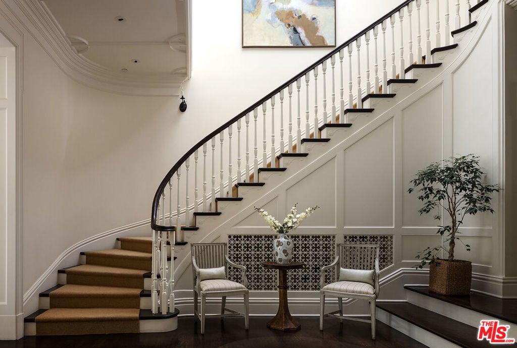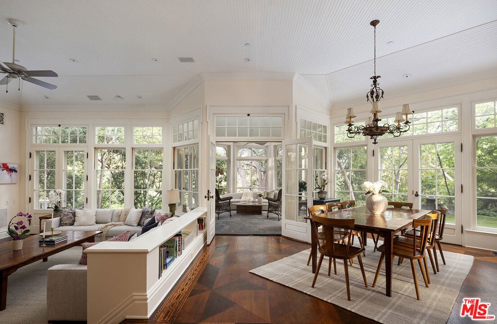 In beautiful lower Mandeville Canyon rests a magical gated private compound, hidden from the street and nestled up a long, tree-lined tranquil driveway. Situated on nearly one acre of lush grounds decorated by blossoming hydrangeas, cascading wisteria, and swaying trees, this rare find was designed by architect Lise Claiborne Matthews, AIA, ASID, and has never been on the market. Once the site of a historical botanical garden, the property spans two verdant parcels, fully encircled by beautiful mature trees for complete privacy. The enchanting facade opens to interiors that blend elegance and warmth, with soaring ceilings, curved glass windows, French doors at nearly every turn, and exquisite custom millwork throughout. Inside, the open-concept design encourages effortless entertaining. Guests are immediately met with a feeling of grand scale and sophistication, as they enter through the foyer and are met with the elegant dining room and formal living room with high architecturally custom-designed ceilings, functional curved glass windows, and anchored by a marble fireplace. Gorgeous greenery and filtered light is to be admired from every window of this stunning home. The living area features a cozy step-down family room with a media center and fireplace, while the chef's kitchen is equipped with a butcher-block island, three sinks, Viking range, Sub-Zero refrigeration, dual Miele dishwashers, and a pantry. A sunlit informal dining area and tranquil sunroom offer a serene setting for coffee, reading, or admiring the surrounding gardens. For grand occasions, the formal living room and dining room provide elegant settings for hosting gatherings, celebrations, and memorable evenings. The balance of the main floor contains an elegant guest suite, a large study, and a sixth bedroom. The expansive primary suite includes a sitting room, custom niches, French doors to a private balcony, and a spa-like bath with marble dual-sink vanity, oversized steam rainwater shower, soaking tub, dual water closets, dressing are, and two walk-in closets. Secondary bedrooms are spacious and full of charm, offering tranquil views of greenery and light throughout. On the recreational level, one would find an entertainment and wellness space with kitchenette, billiards room, sauna, cinema, gym, wine cellar, and a soundproof playroom, along with a light-filled atrium. Outside, the resort-style amenities include a sparkling 50-foot saltwater pool, meditation garden, koi pond, grassy lawn, patios, and lounging decks. Ample space allows for future additions such as a play area or sport court. Completing the estate is a three-car garage, a large fully functional gym or potential ADU, a large motor court, and additional parking accommodating twelve-plus vehicles. Offered furnished or unfurnished, this rare retreat is just minutes from Brentwood, Santa Monica, Pacific Palisades, and all the conveniences of the Westside, yet feels worlds away.