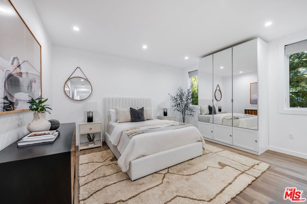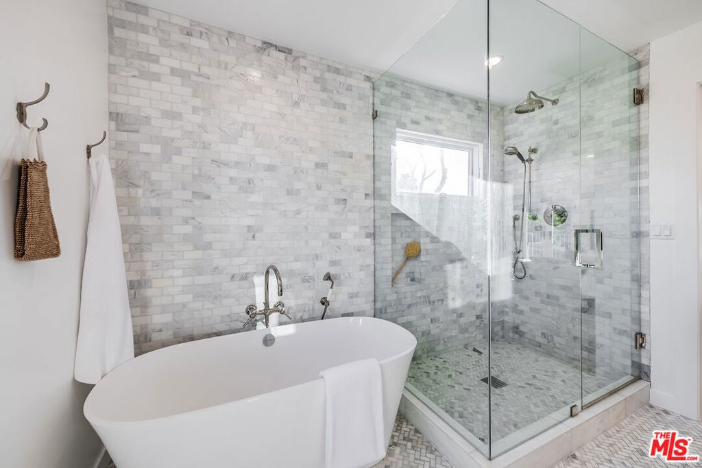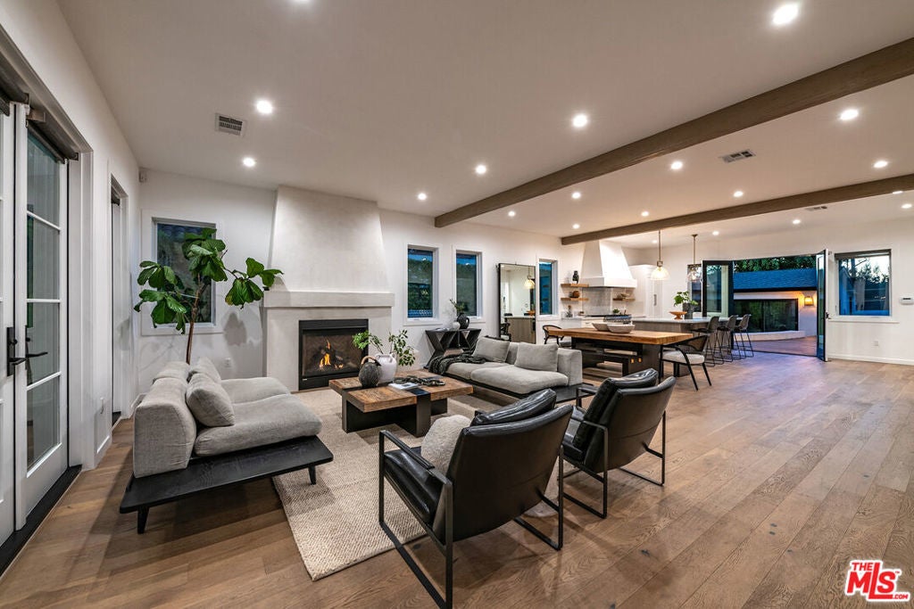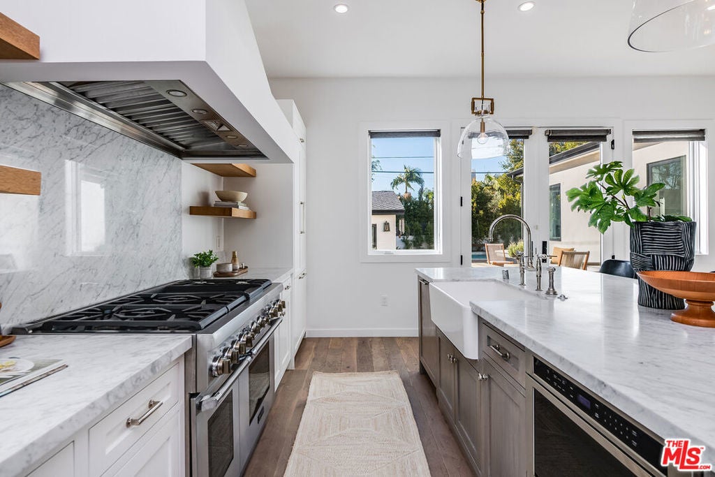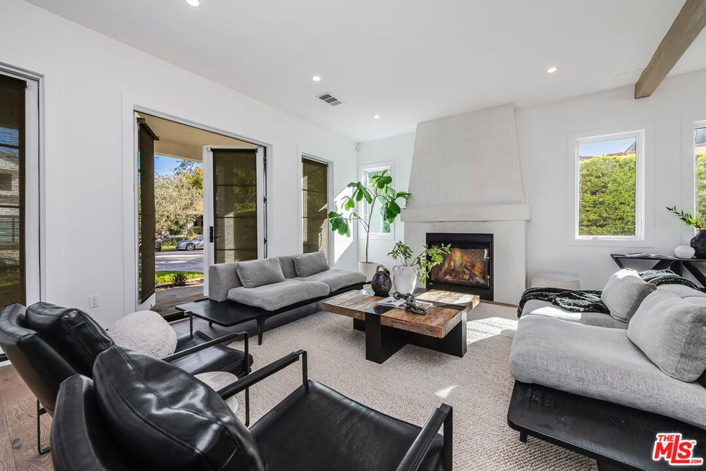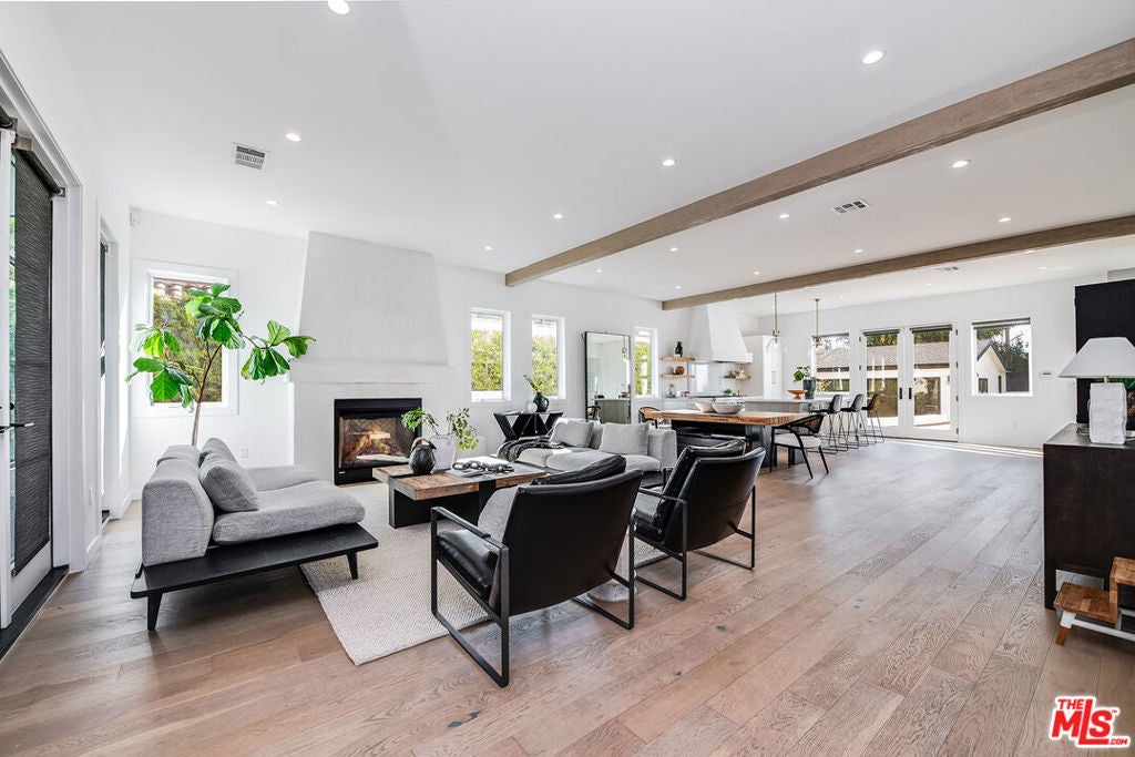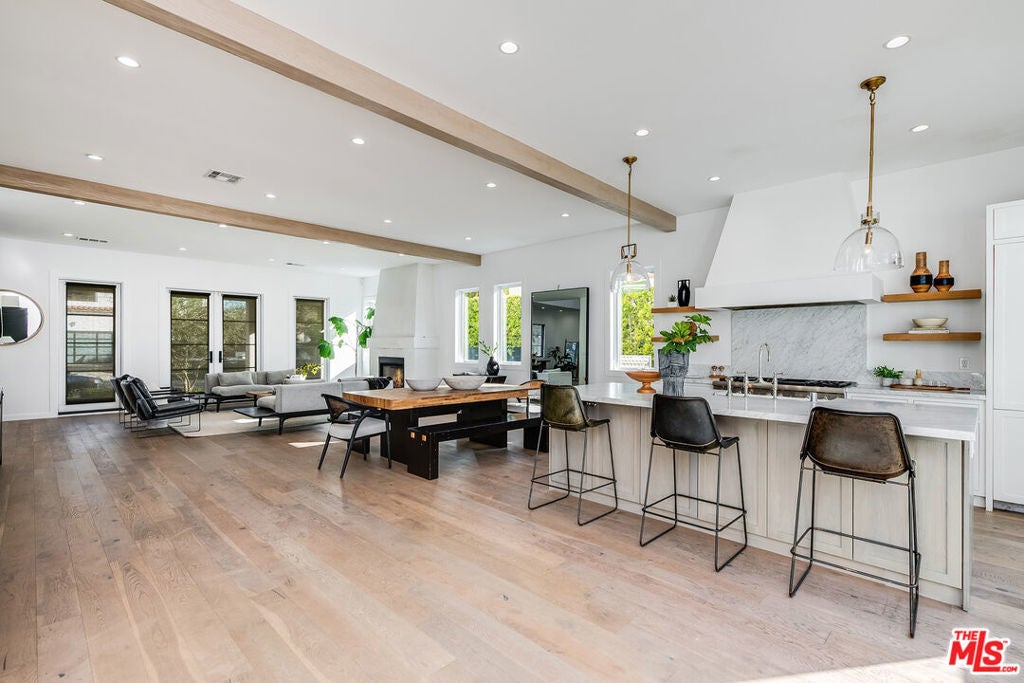 Epitomizing California's relaxed luxury, this four-bedroom modern traditional home in white-hot Brookside, near Hancock Park, is filled with light, style, and sophisticated charm. The heart of the 3462+/-square-foot home is an open-concept living room, dining room, and kitchen with hardwood floors, exposed ceiling beams, large windows and glass doors, and a fireplace. Cooks will appreciate the kitchen's elegant Carrara marble countertops and six-burner dual-oven Thermador range. The four bedrooms include a generous, airy, and bright master bedroom with two balconies and a versatile space perfect for a relaxing lounge. The six stylish baths have quartz counters and designer fixtures; the spa-inspired en suite master bath includes a soaking tub and a glass-enclosed shower. Multi-zone air conditioning and an alarm system are among the modern amenities. A deck encourages alfresco entertaining or soaking up the sun beside the alluring pool and spa. A two-car garage completes the picture.
