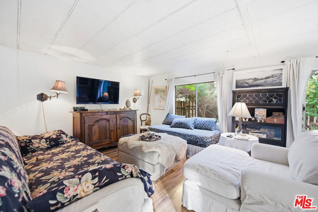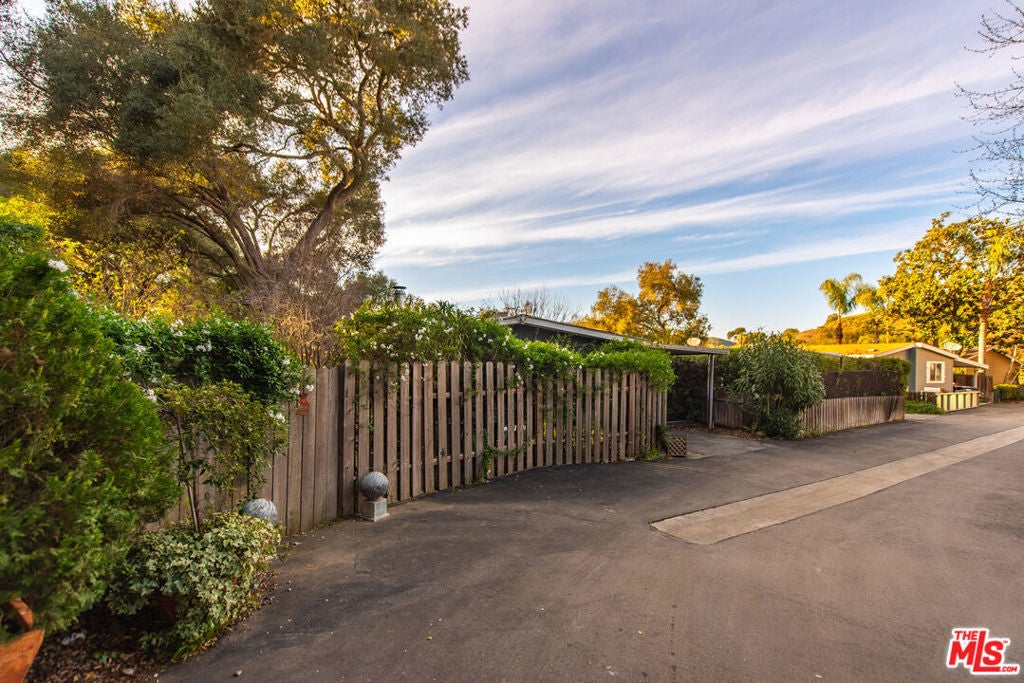Cozy end corner with 3 sides of gardens. Views of meadows and mountains. Peaceful and calm with extra large windows. Open floor plan with fireplace in your serene living room which is open to dining that flows to the gardens via sliding glass door. Dining is open to eclectic kitchen with free standing architectural pieces. Primary suite with the garden / meadow and mountain views, slate floors in both bathrooms. Secondary bedroom and bath. Numerous garden seating areas, greenhouse, above ground spa., exterior shower. Small 2 street community with amenities of large private barn storage structure, BBQ, Fire Pit, lawns for gathering. Close in location between beaches, Fwy, Parks, Shopping. Relaxation is here.