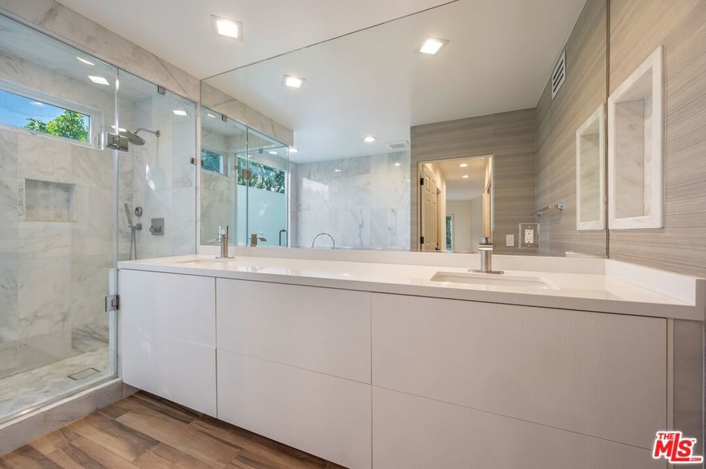 Set on a peaceful street just off the coveted Benedict Canyon, this stylish and updated single-story contemporary home offers the perfect blend of modern living and serene privacy. Located just minutes from Beverly Hills' world-class shopping and dining, this property combines convenience with a tranquil retreat. Bright and airy, the home features beautifully refinished parquet hardwood floors, a newly updated kitchen with sleek countertops, and stainless steel appliances. The open floor plan includes a formal living room, dining area, and breakfast bar, all enhanced by recessed lighting for a warm, inviting ambiance. Surrounded by lush greenery, the backyard serves as a private oasis, complete with a large patio ideal for entertaining and a sports court for recreation. This home delivers effortless style, comfort, and functionality in an unbeatable location.