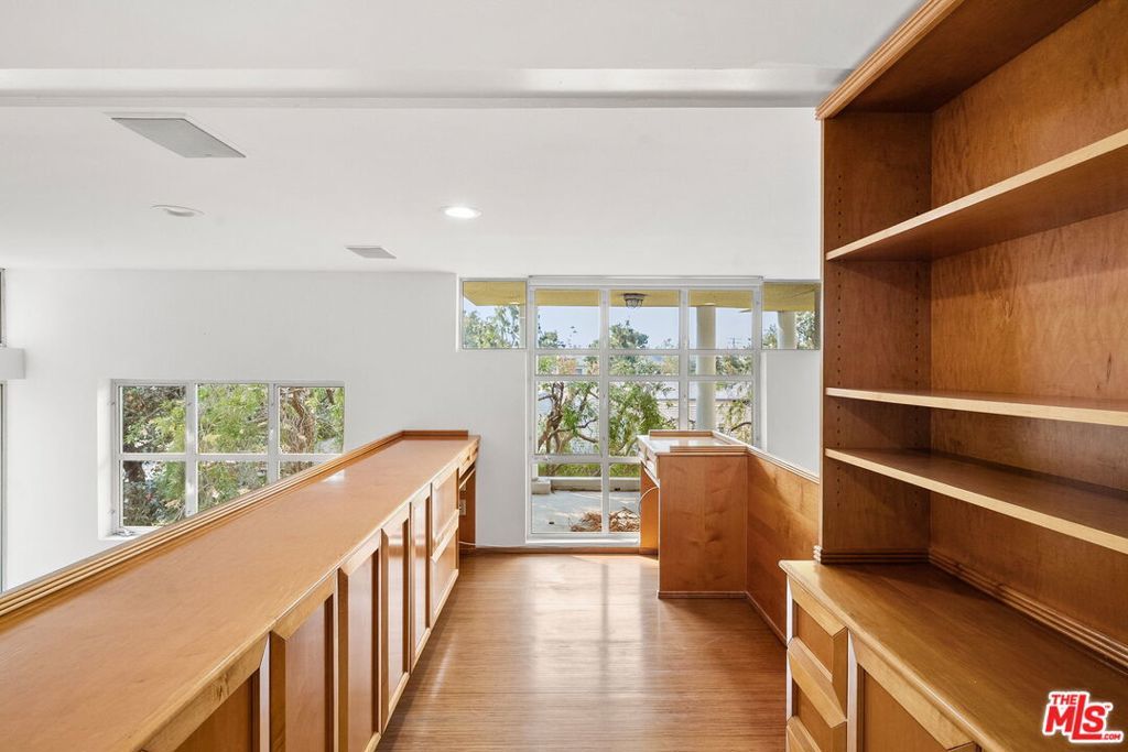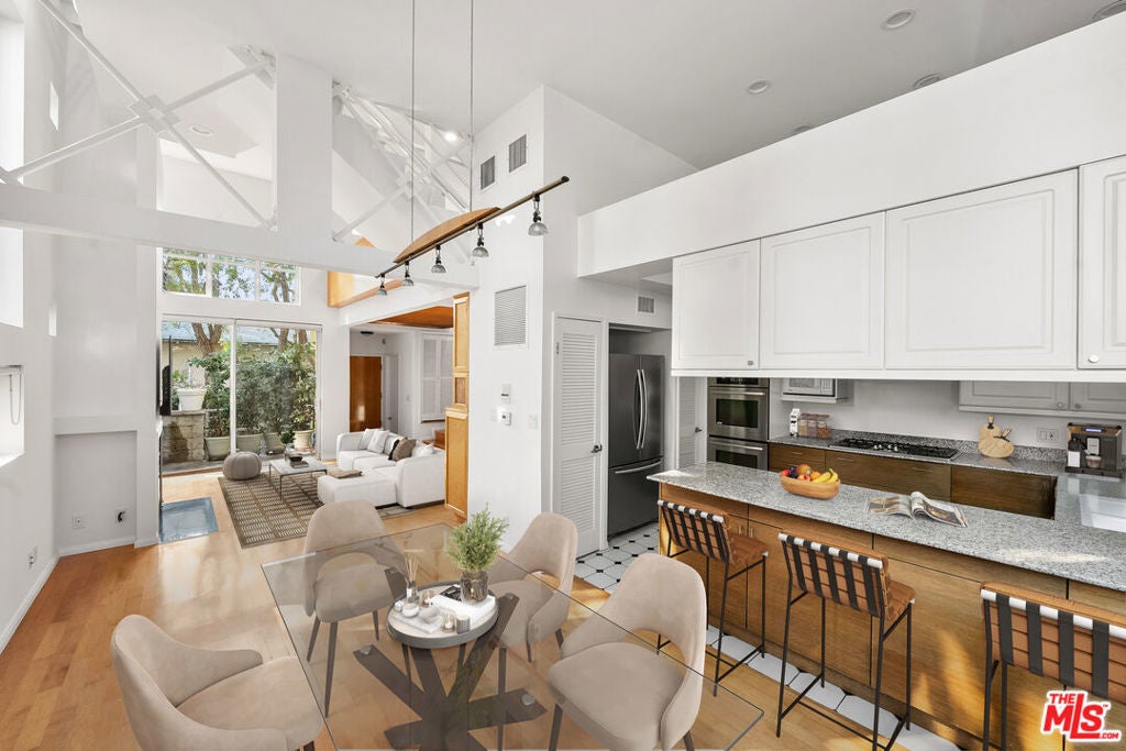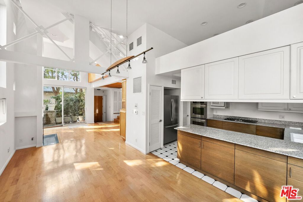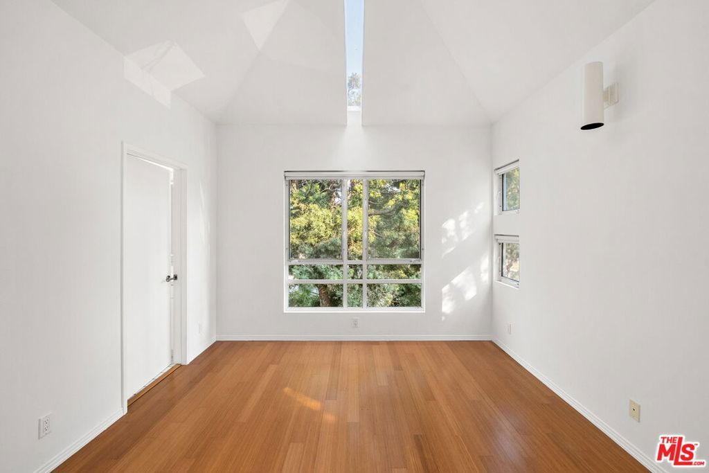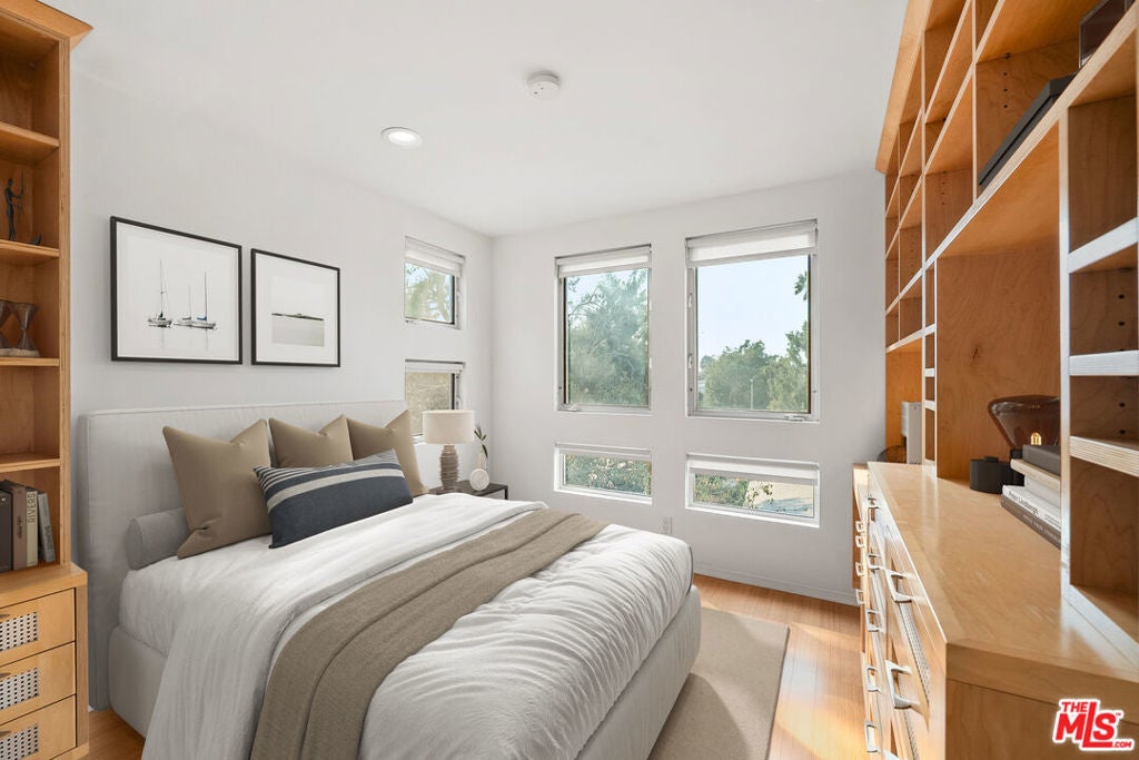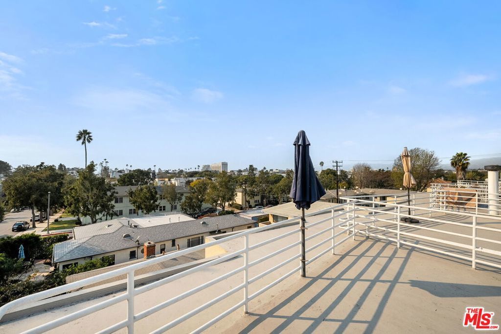 Beautiful and modern townhouse for rent in Santa Monica. Front unit in 5 unit building with lots of light. 3 bedrooms, 2 1/2 bathrooms. The unit has hardwood floors and is open on three sides with large areas of glass.15 feet tall ceiling in the living area and 12 feet tall ceiling in the dining area. Roof terrace with beautiful views. Patios in front of the living area and next to the dining area. Built-in shelves, drawers, and desk in 2nd and 3rd bedrooms. Walk-in closet in primary bedroom. Additional loft area with built-in bookshelves, desks, file cabinets, pull-outs, and drawers. Gas fireplace, bookshelves, and pull-outs in the living room. Washer and dryer in unit. Central heating and cooling. 2-car side-by-side parking included in subterranean gated garage. Direct access to the unit from the garage. Gated pedestrian entry and garage. Direct access to the unit from street level. Alarm system inside the unit. Alarm system in garage. HOA covers water and water heating. Some photo images have been virtually staged/digitally altered.