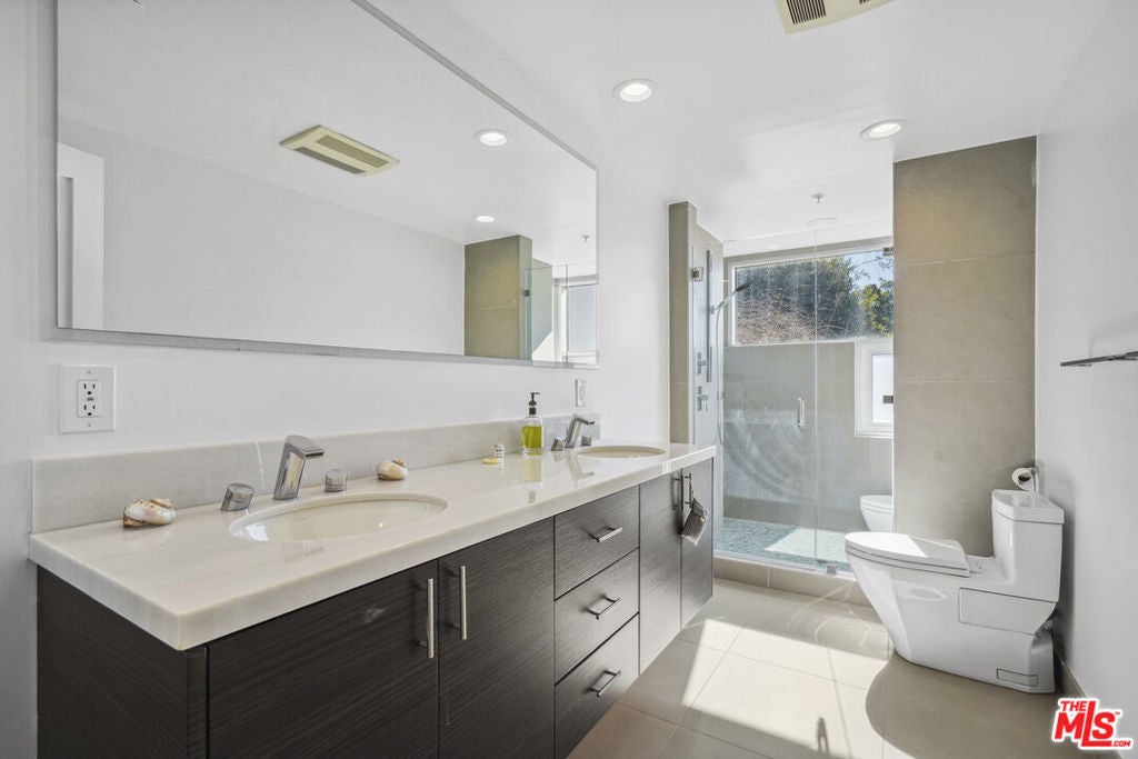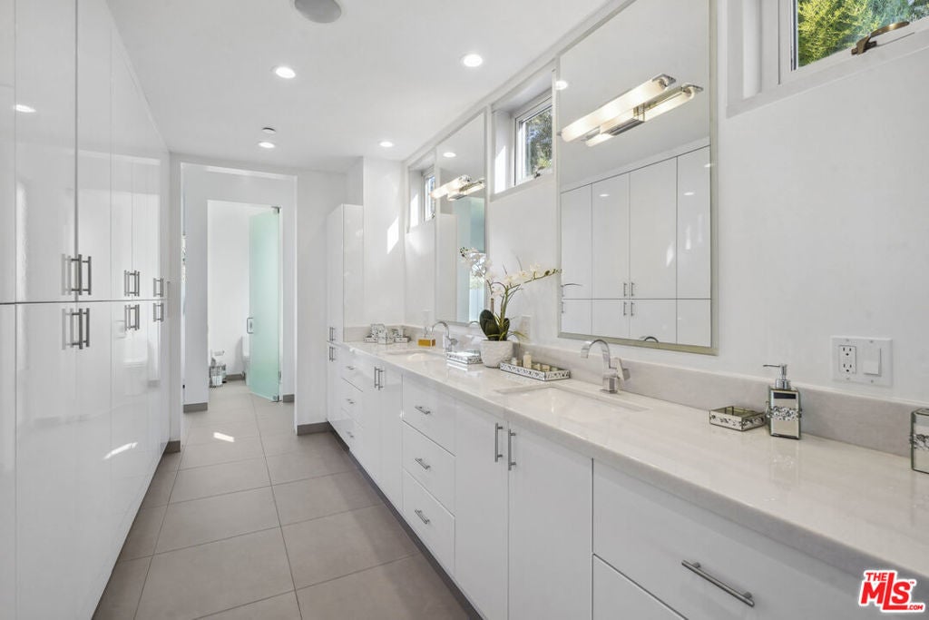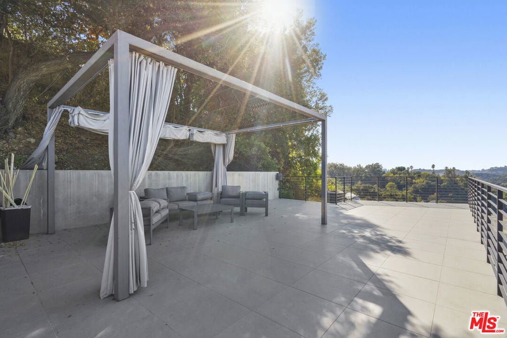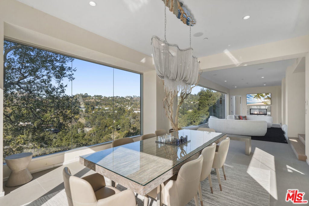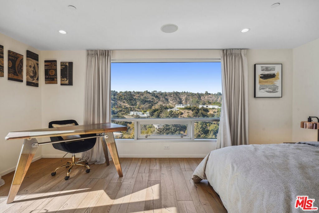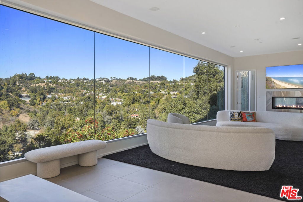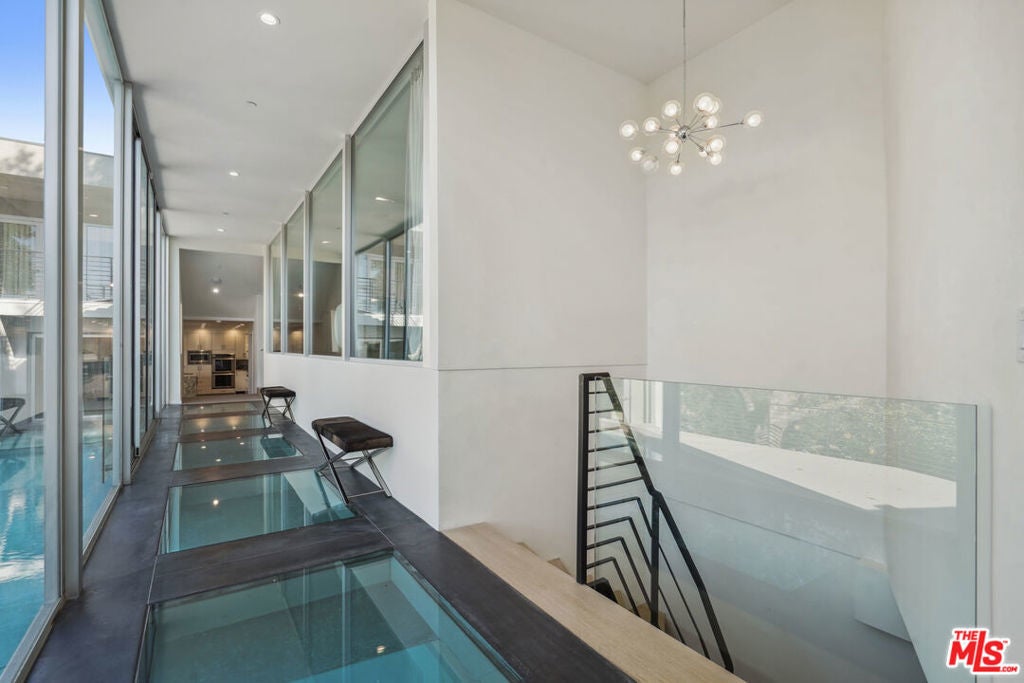 Suspended above the city within one of Beverly Hills' most exclusive, celebrity-favored gated enclaves, 9716 Oak Pass Road is a striking contemporary estate offering exceptional privacy, architectural distinction, and breathtaking panoramic views. The community is gated, and the residence itself is further secured behind its own private gate and drive, creating a rare and dramatic sense of arrival. Spanning approximately 6,244 square feet across three dramatic levels, this modern sanctuary is wrapped in walls of glass that capture canyon vistas from nearly every room, delivering a seamless indoor-outdoor lifestyle throughout. A signature architectural highlight is the glass-enclosed skybridge hallway suspended above the infinity-edge pool, serving as a sculptural centerpiece on the main level and elevating the home to true statement-level design. The residence offers a total of four bedrooms, including an expansive and private primary suite retreat with commanding views, oversized walk-in closets, and a spa-inspired bath. Three additional guest bedroom suites provide exceptional comfort and privacy. Designed for both refined daily living and elevated entertaining, the home features a gourmet chef's kitchen, sophisticated formal and informal living areas, a private executive office anchored by a dual-sided fireplace, and a dedicated private theatre/media room. Multiple view terraces and decks extend the living experience outdoors, while the floating infinity-edge pool appears to merge with the skyline, creating a resort-style setting high above Beverly Hills. Set among notable neighbors within an elite and discreet hillside enclave, this exceptional contemporary residence delivers a rare combination of privacy, prestige, and iconic architecture on one of Beverly Hills' most coveted streets.
