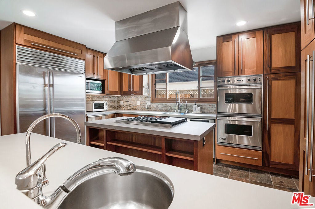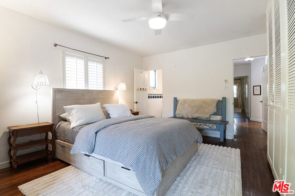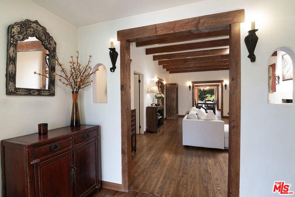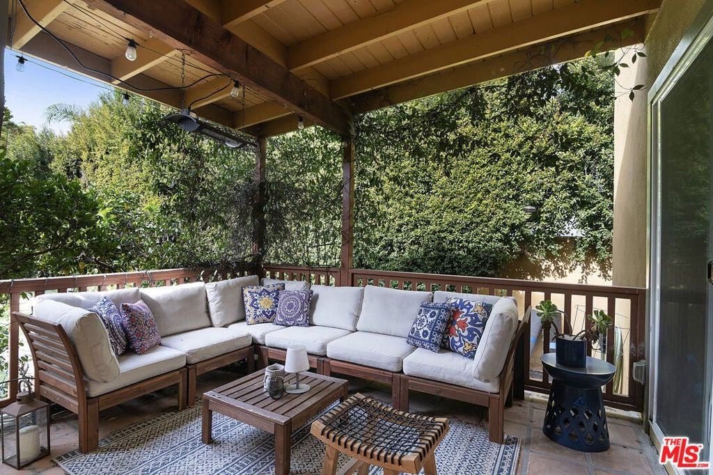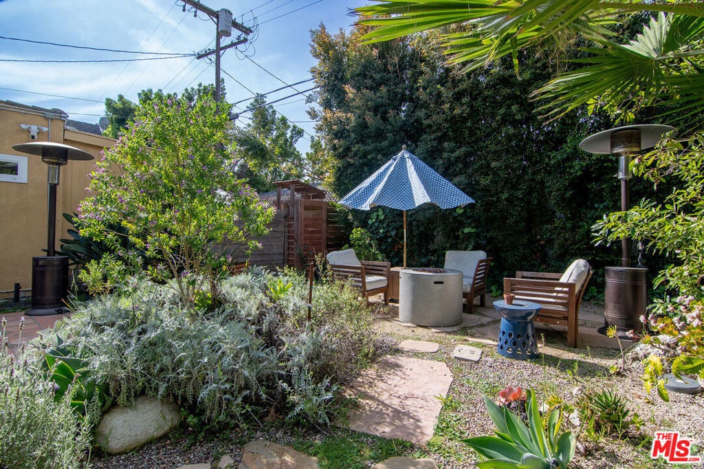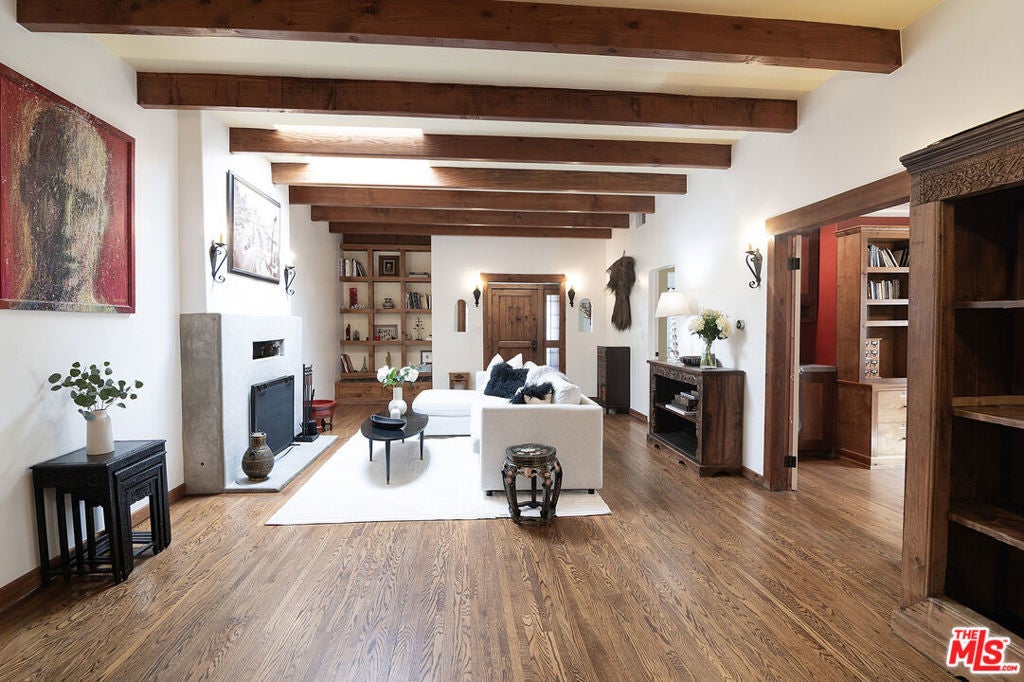 Single Story Mission Spanish Adobe Hancock Park Home with 3 beds, 3 baths and whimsical outdoor garden! Covered front porch and formal foyer open to living room with beamed high ceiling, fireplace, built ins. Library off the living room is lined with bookshelves, has a built-in desk area + wet bar with sink and beverage fridge, and is bathed in sunshine. Kitchen with center island + separate breakfast bar has Viking and Sub Zero appliances, tons of storage and countertop space. Laundry off the kitchen with a door to the yard. Primary bedroom is a suite and opens to a charming covered patio. 2 additional sunshine filled bedrooms with generous closet space + colorful baths with personality, 1 with a tub and 1 with a shower. Backyard has great space for al fresco dining in a private hedged garden with lush mature trees. Hardwood and tile floors, central HVAC. Amazing location close to restaurant row, Larchmont Village, tree-lined serene Hancock Park streets. Third Street School!