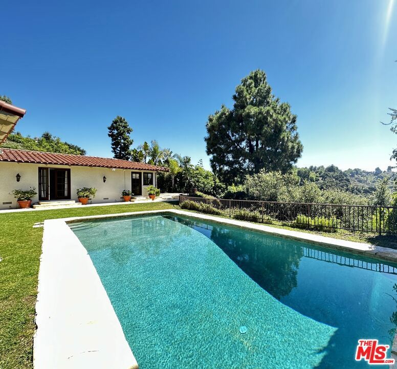 Beautiful walled and gated villa with grassy lawn, sparkling pool and expansive canyon vista. The dramatic entry leads to a formal dining room for gathering with family or friends, the Carrera marble center island chef's kitchen, elegant living room and family room for entertaining and relaxing. Gorgeous dark hardwood floors grace the interior of the home, creating an atmosphere of refinement. The main bedroom wing features a sophisticated master suite and two additional well-proportioned bedrooms sharing a tastefully redone bath. A private fourth bedroom or maid's quarters is located off the kitchen. Enjoy the ease of single story living on a quiet cul de sac. Feel like you are living in the European countryside. Includes extra refrigerator in garage, washer and dryer, Ring doorbell and cameras present.