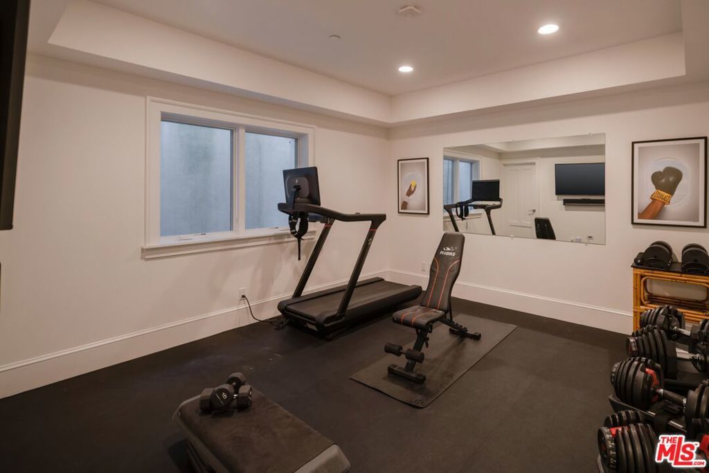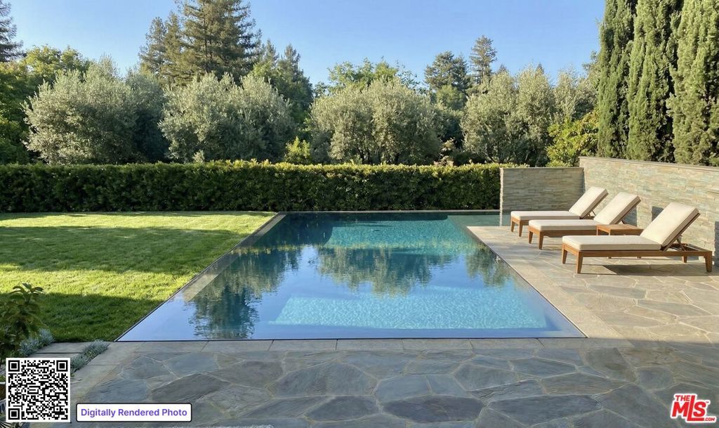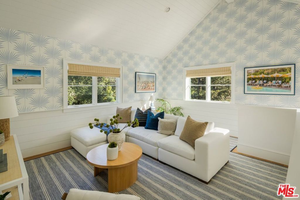 Designed by Gray Malin, renowned fine art photographer, this beautiful home exudes sophistication with a refined coastal elegance. Ideally located in Rustic Canyon, a prestigious enclave of the Pacific Palisades by the Pacific Ocean. The gated front courtyard features whimsical hedging, combining with mature trees and lush greenery for dramatic curb-appeal. Upon entry guests experience a double-height ceiling and voluminous rooms blending open-concept living with defined spaces. A formal entry, sitting room, office or den, and a refined dining room pivot around the stately oak spindle staircase. The living room with wood beamed ceiling, central fireplace and fully retractable wall of glass creates the optimal Southern California indoor-outdoor experience. The main level further includes a secondary dining area, top of the line chef's kitchen featuring Sub-Zero and Wolf appliances with custom cabinetry and large island, dual dishwashers, a walk-in pantry, butler pantry with wine fridge, an office area, secondary entrance/mudroom and half bath. The second level is graced by an oversized primary suite with vaulted ceilings, fireplace, walk-out patio overlooking the lush backyard and canyon views, double walk-in closets, a beverage area and resort-like spa bath with heated stone flooring, soaking tub and steam shower. Three guest rooms, a flex-space perfect for a family room, children's playroom, additional office or bedroom, three baths, and laundry complete the upper floor. At the lower level a generous family and entertainment room with state of the art movie screen, projector and surround sound, a secondary kitchenette/bar, a full home gym or bedroom and additional bathroom create the ultimate entertainment retreat. A beautiful mature oak tree defines the natural setting of the backyard with outdoor sitting areas with fire pit, a spa-pool with fountain, built-in bbq and alfresco dining area perfect for relaxation, play or entertaining guests. It offers the ultimate privacy with beautiful canyon views, a collage of greenery with citrus trees, hedges, a variety of flowers and raised garden boxes for harvesting farmed vegetables. The property features wide-plank floors and coastal designer details throughout with a 2-car garage, solar panels (with capacity to install Tesla Powerwall), EV charging, PuroServe home water filtration system and a storage room. With close proximity to nearby Rustic Canyon Park with tennis courts, top-rated Canyon & Palisades Charter Schools, and fine dining establishments Giorgio Baldi, Muse, the historic Golden Bull, Cafe Delfini, Rustic Coffee and Shore Bar. The home is matched for the most discerning clientele and can be purchased furnished, turn-key ready for occupancy. (Note: Photos 6,8,48 have been digitally altered to depict renderings of a larger pool and relocated firepit with lounge area. As per CA law, the original, unaltered image can be viewed next to the digitally altered image).