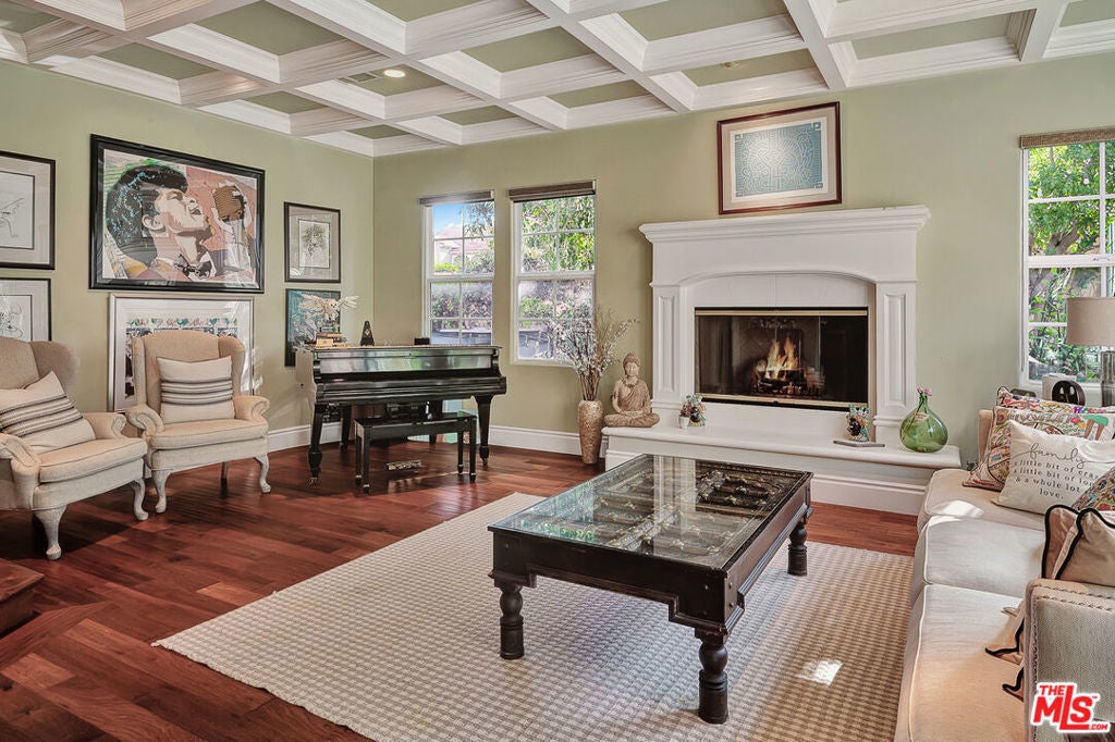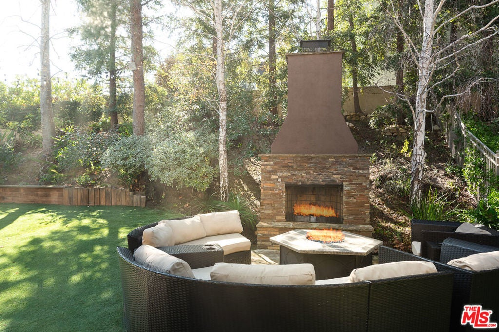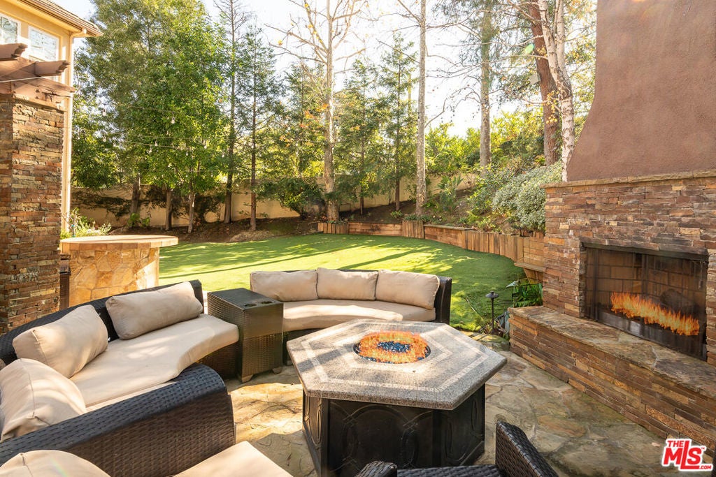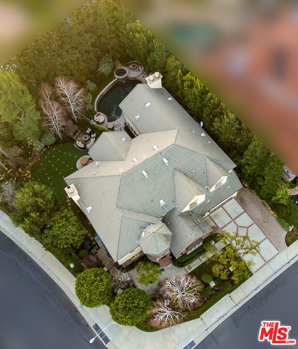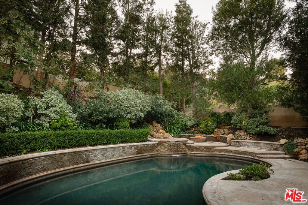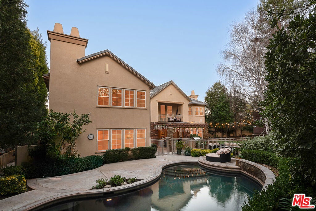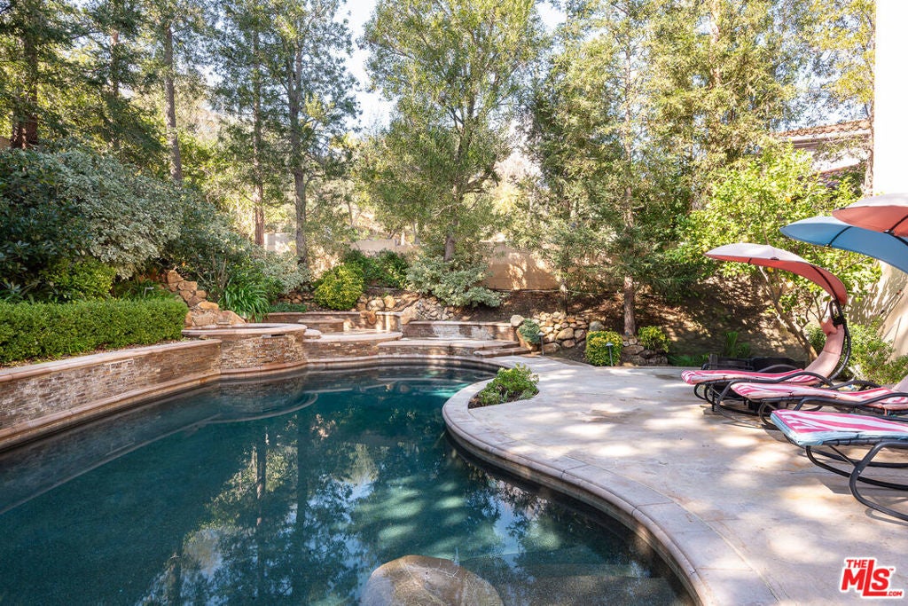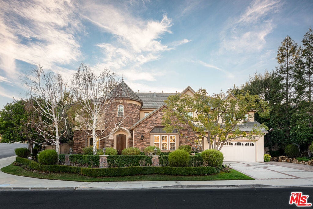 Tucked behind the prestigious guard-gated enclave of Mont Calabasas, this exceptional corner-lot estate offers an extraordinary blend of elegance, comfort, and rare privacy. Set apart with expansive frontage and beautifully mature landscaping, the residence exudes a classic traditional charm that is both warm and inviting from the moment you arrive. Thoughtfully designed for both sophisticated entertaining and everyday living, the home showcases a gracious floor plan filled with natural light and impeccable craftsmanship. At its heart is a stunning chef's kitchen, anchored by a generous center island and outfitted with premium Viking stainless-steel appliances. Seamlessly open to the inviting family room, this space features a richly detailed coffered ceiling and a welcoming fireplace creating the perfect setting for gatherings of any size. An impressive bonus/game room with its own fireplace and wet bar provides a versatile retreat for recreation and relaxation, while a dedicated home gym offers an ideal space for wellness and fitness. Six beautifully appointed bedrooms include a luxurious primary suite complete with a private balcony, intimate sitting retreat, spa-inspired all-stone bath, and dual custom walk-in closets, an indulgent sanctuary to begin and end each day. Refined interior finishes elevate the home throughout, including gleaming hardwood floors, elegant crown moldings, custom window treatments, beadboard ceilings, and dual staircases that enhance both form and function. The resort-style backyard is a private oasis designed for year-round enjoyment. A sparkling pool and spa with tranquil waterfall serve as the centerpiece, complemented by a covered patio with built-in barbecue center, a charming freestanding stacked-stone fireplace, and a spacious play area. Surrounded by lush, mature trees and meticulously curated landscaping, the grounds provide an unparalleled sense of seclusion and serenity rarely found in today's market. This is more than a home, it is a beautifully crafted lifestyle opportunity in one of Calabasas' most sought-after communities.