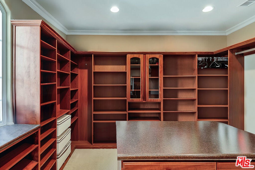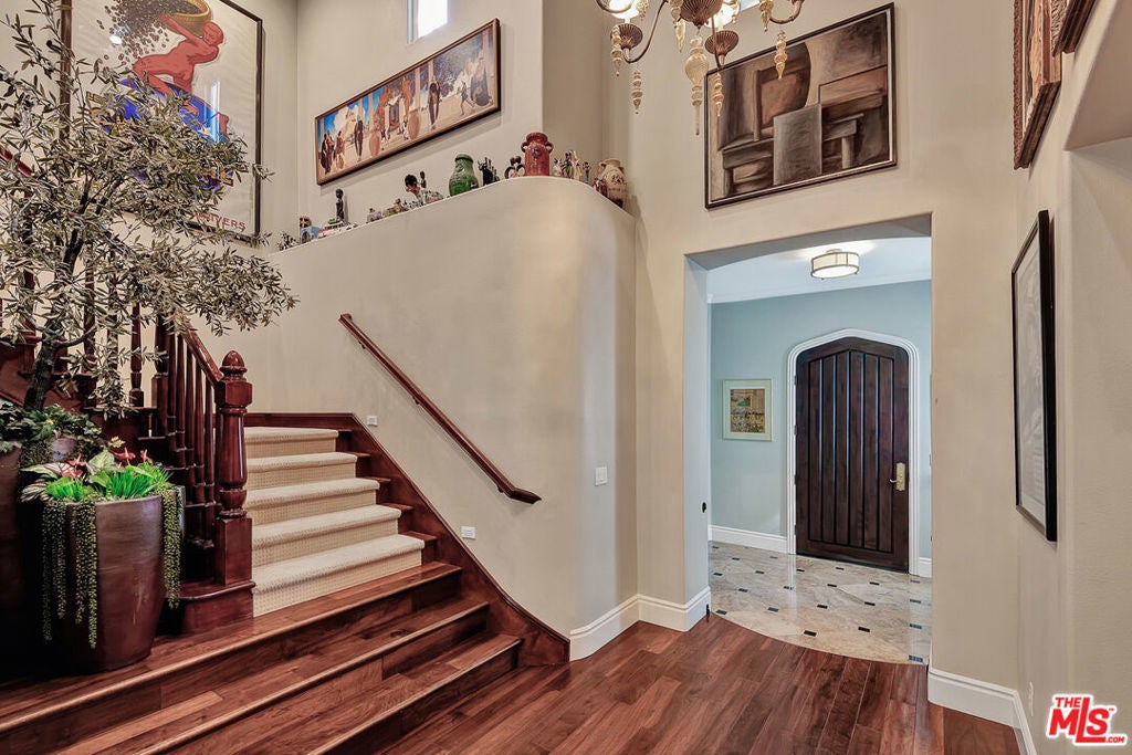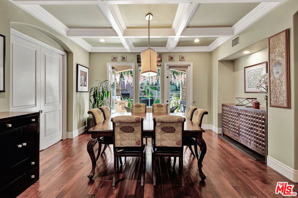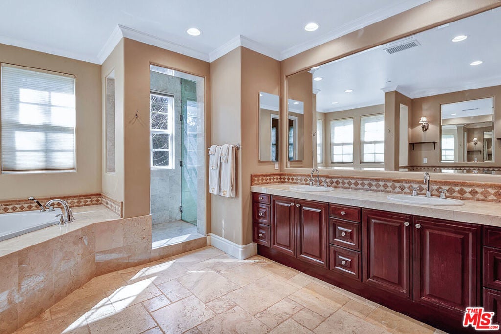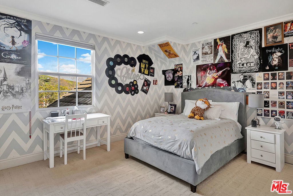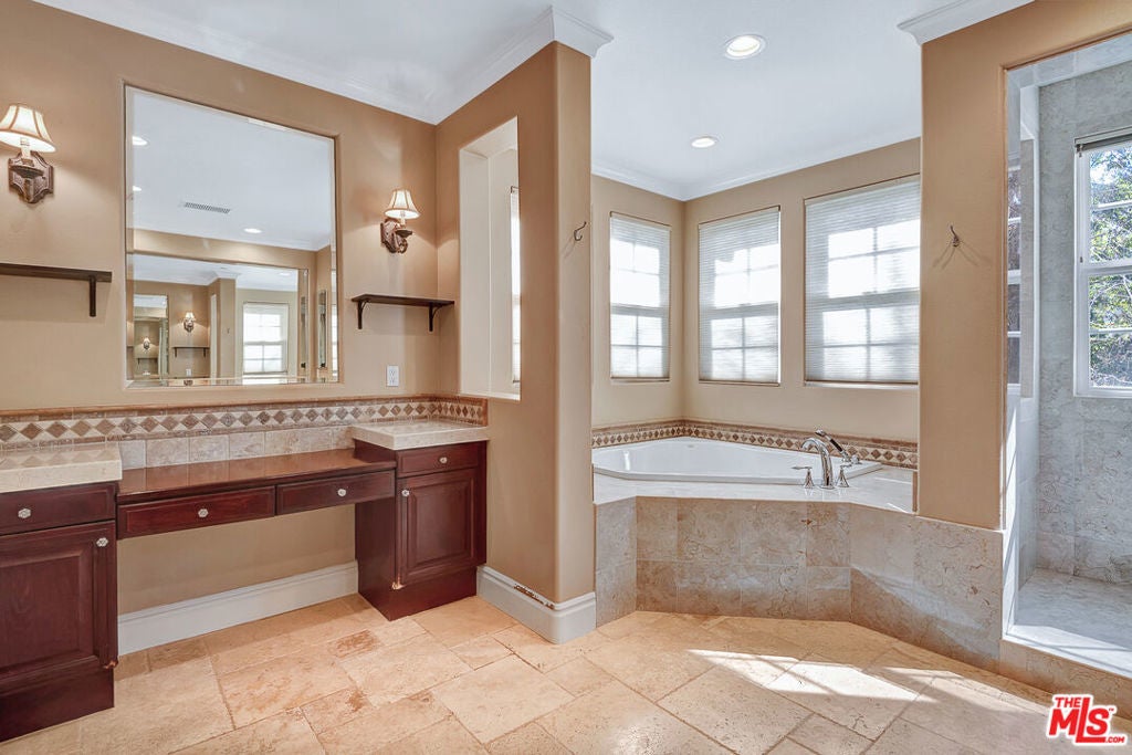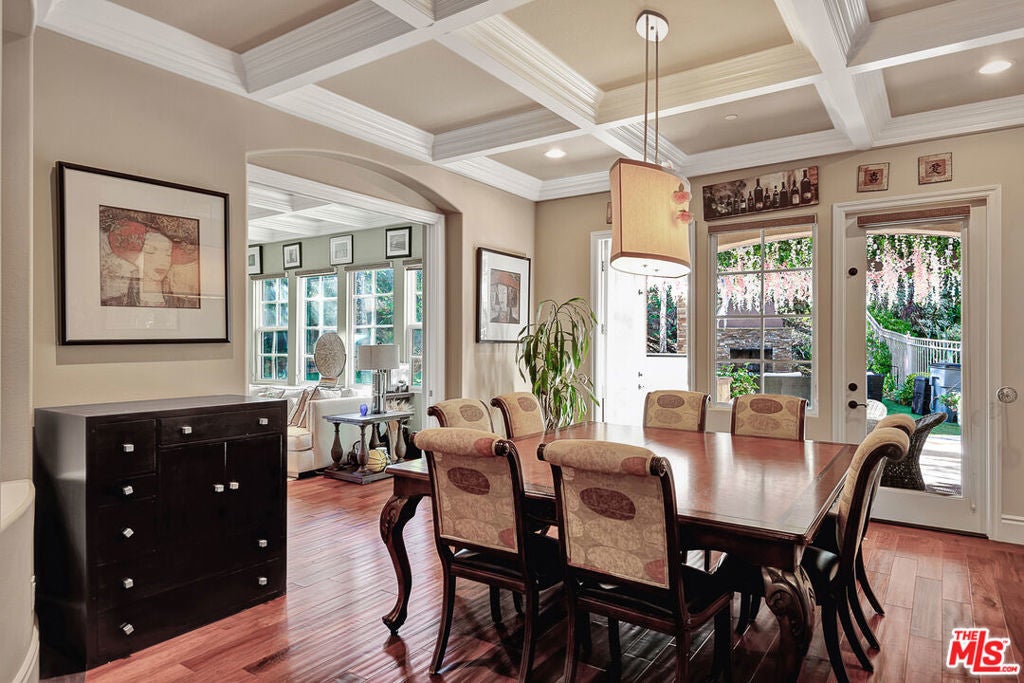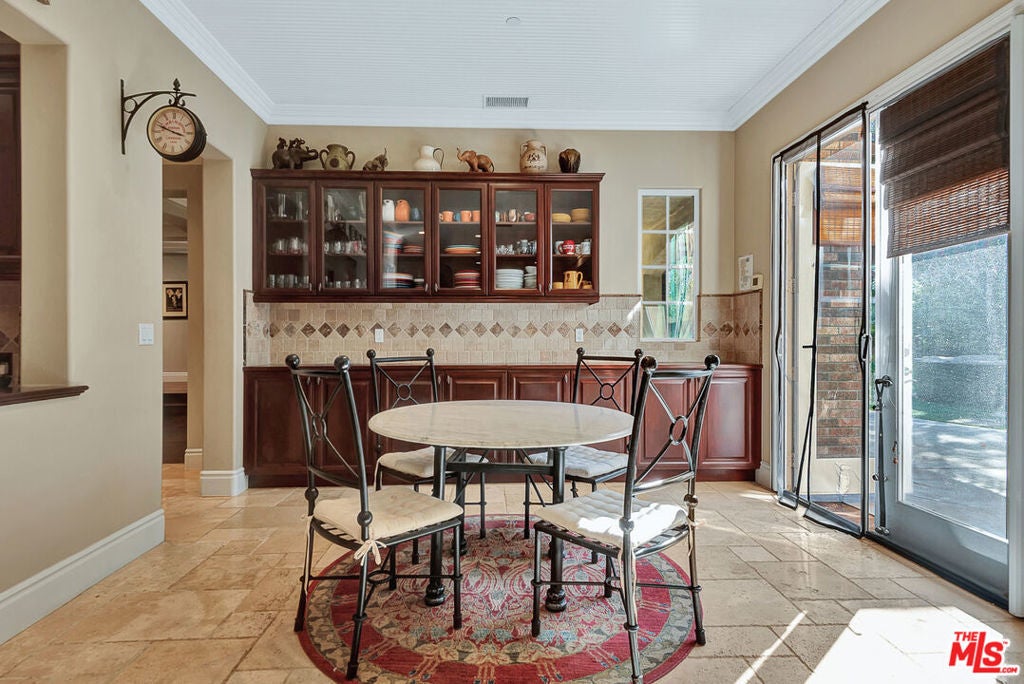 Tucked behind the prestigious guard-gated enclave of Mont Calabasas, this exceptional corner-lot estate offers an extraordinary blend of elegance, comfort, and rare privacy. Set apart with expansive frontage and beautifully mature landscaping, the residence exudes a classic traditional charm that is both warm and inviting from the moment you arrive. Thoughtfully designed for both sophisticated entertaining and everyday living, the home showcases a gracious floor plan filled with natural light and impeccable craftsmanship. At its heart is a stunning chef's kitchen, anchored by a generous center island and outfitted with premium Viking stainless-steel appliances. Seamlessly open to the inviting family room, this space features a richly detailed coffered ceiling and a welcoming fireplace creating the perfect setting for gatherings of any size. An impressive bonus/game room with its own fireplace and wet bar provides a versatile retreat for recreation and relaxation, while a dedicated home gym offers an ideal space for wellness and fitness. Six beautifully appointed bedrooms include a luxurious primary suite complete with a private balcony, intimate sitting retreat, spa-inspired all-stone bath, and dual custom walk-in closets, an indulgent sanctuary to begin and end each day. Refined interior finishes elevate the home throughout, including gleaming hardwood floors, elegant crown moldings, custom window treatments, beadboard ceilings, and dual staircases that enhance both form and function. The resort-style backyard is a private oasis designed for year-round enjoyment. A sparkling pool and spa with tranquil waterfall serve as the centerpiece, complemented by a covered patio with built-in barbecue center, a charming freestanding stacked-stone fireplace, and a spacious play area. Surrounded by lush, mature trees and meticulously curated landscaping, the grounds provide an unparalleled sense of seclusion and serenity rarely found in today's market. This is more than a home, it is a beautifully crafted lifestyle opportunity in one of Calabasas' most sought-after communities.