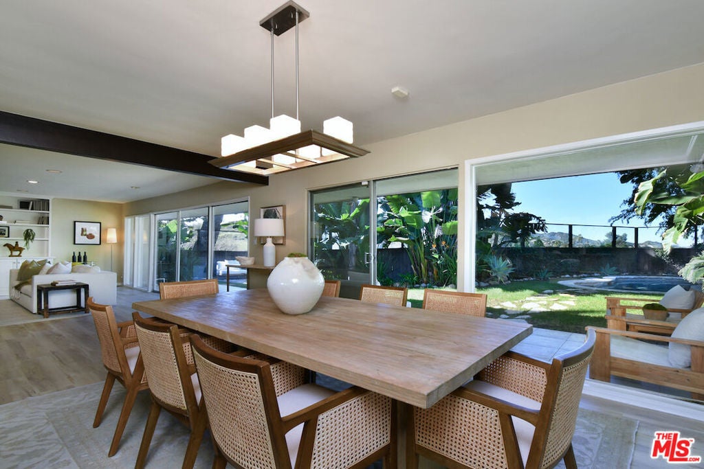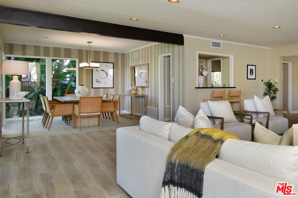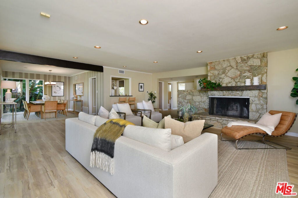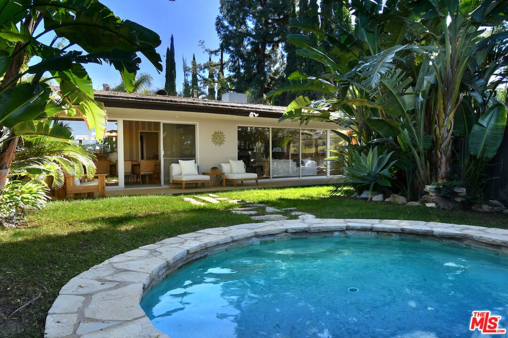 Gated and set back from the street, this single-story mid-century home offers a well-designed floor plan with open living spaces and walls of glass that frame the surrounding views. A welcoming garden entry leads to an expansive living room with a natural stone fireplace, built-in bookcases, and direct access to the formal dining room and bar, creating a comfortable flow for everyday living and entertaining. The updated center-island kitchen includes a breakfast area, Viking oven and range, generous storage, and a pantry. The spacious primary suite features a dressing area and an en-suite bath. Private backyard with a lounging pool/spa, covered patio, and deck, surrounded by mature landscaping and trees. Additional highlights include an indoor laundry room, a two-car detached garage with potential for an ADU, and an oversized driveway for off-street parking. Great neighborhood near the top of Sherman Oaks and close to Mulholland Drive, the home has easy access to Beverly Hills, Ventura Blvd. and the Westside. Roscomare Road School District.
