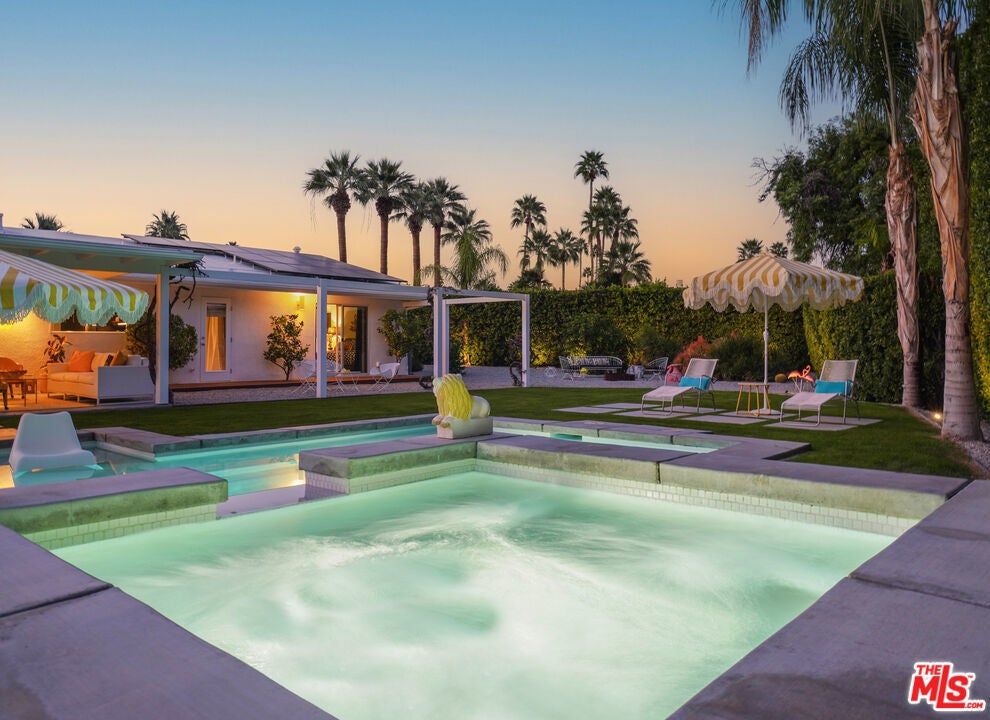 For rent or sale. Reimagined midcentury ranch situated on a jumbo .35-acre lot in Sunrise Park, offering quintessential Palm Springs living. This rare oversized property is discreetly tucked behind walls and hedges, exuding charm and featuring resort-style grounds with a pool, spa, detached cabana, multiple seating areas, and sweeping, wire-free mountain views. Gossip poolside while taking in views of Mt. San Jacinto by day and the aerial tram by night, or chill in the vibey cabana retreat overlooking the pool. The fully hedged property offers exceptional privacy and includes a two-car garage as well as ample space for a vintage trailer, RV, future addition, and ADU/guest house. Interiors boast a pared-down aesthetic with concrete floors and whitewashed walls, providing a neutral backdrop for art and furnishings. The bespoke kitchen offers generous storage, a gas range, quartz countertops, and a picture window overlooking the pool and outdoor lounge and dining areas. All rooms open directly to the pool and gardens, including the primary bedroom with its ensuite bath and dual wardrobes. Two guest bedrooms share a hall bath, with one bedroom featuring pocket-door access, creating a junior primary suite. Ideally located between the airport and downtown Palm Springs, the home is walkable to Sunrise Park, the city's swim center, library, sports fields, PS Cultural Center/Camelot Theatre, weekly farmers market, and numerous shops and restaurants. Note that the Sunrise Park neighborhood currently allows full short-term vacation rental permits. Additional upgrades include a transferable solar lease with a fixed, low monthly electricity payment, newer HVAC system, mini-split in the primary bedroom, new water heater, new exterior paint, and a recoated foam roof with warranty. The rear property line spans approximately 130 feet with no neighboring properties behind. Whether entertaining on a grand or intimate scale, this rare and private property is designed for memorable desert living.
