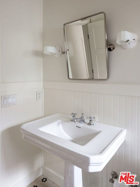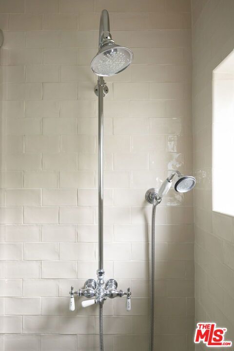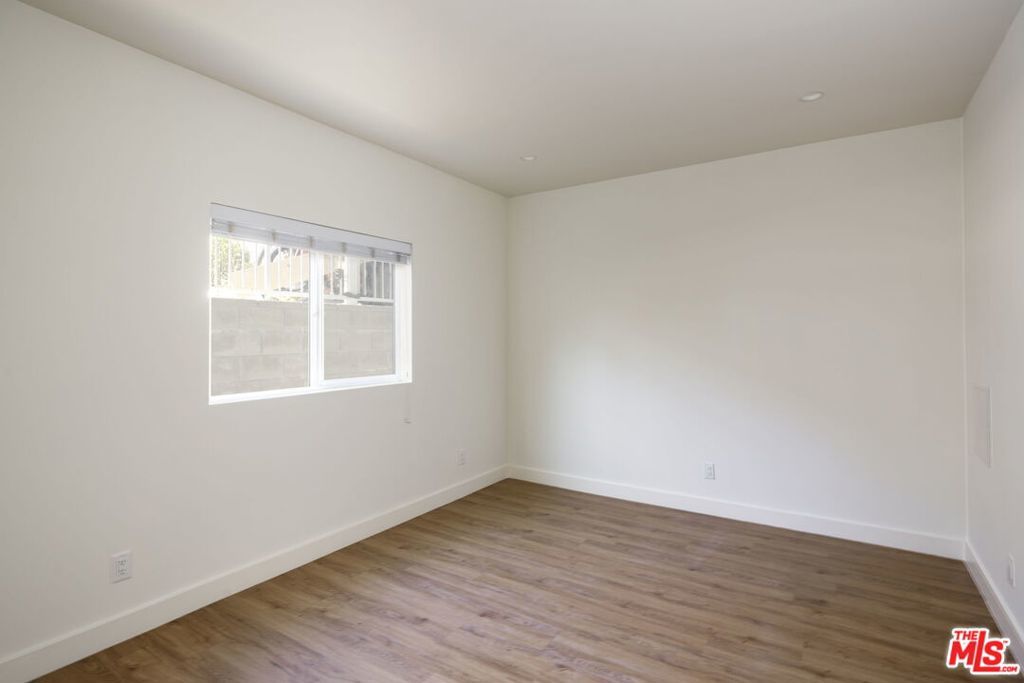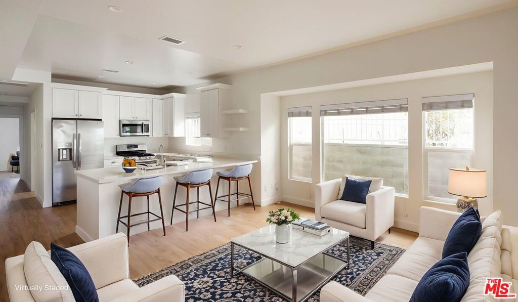 This delightful two-bedroom stands above a tree-lined street, a block from Silver Lake's vibrant Sunset Junction. A beautiful brick staircase flanked by lush greenery and rose bushes leads to the main entrance. Inside, this lower unit opens to a wonderful blend of character with modern updates enhanced by an abundance of natural light. A bay window centers the living room that overlooks a kitchen with stainless steel appliances, a dishwasher, ample counter space, and bar seating for morning lattes and impromptu guests. The bedrooms are positioned on either side of the floor plan, offering flexibility for use as a main bedroom and home office, or for roommates. The bathrooms stand out with details like wainscoting, daisy-patterned tiled floors, and glass-enclosed showers. The primary bedroom has a walk-in closet. Additional perks include central air and heat, an in-unit, side-by-side washer and dryer, and secured off-street parking.