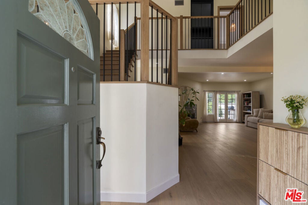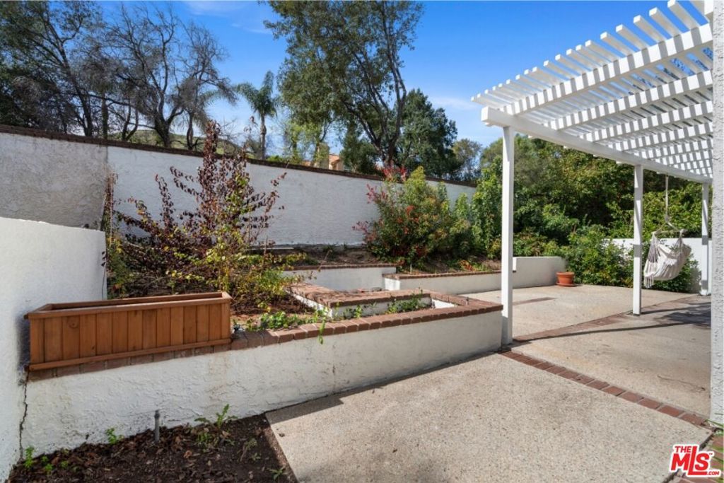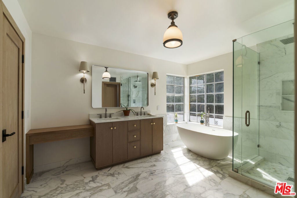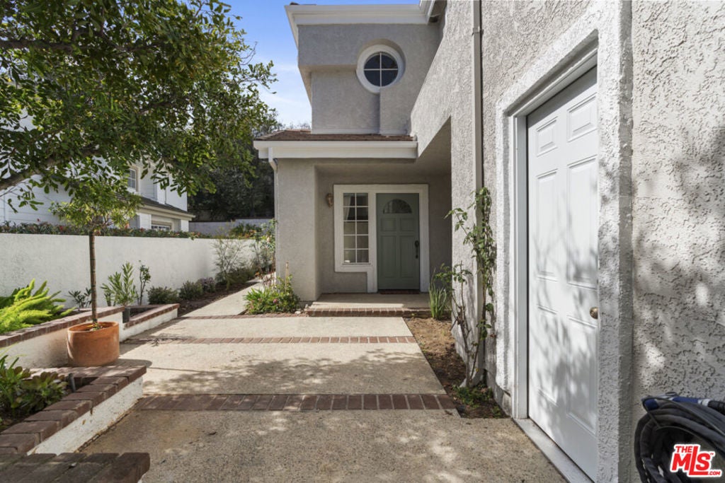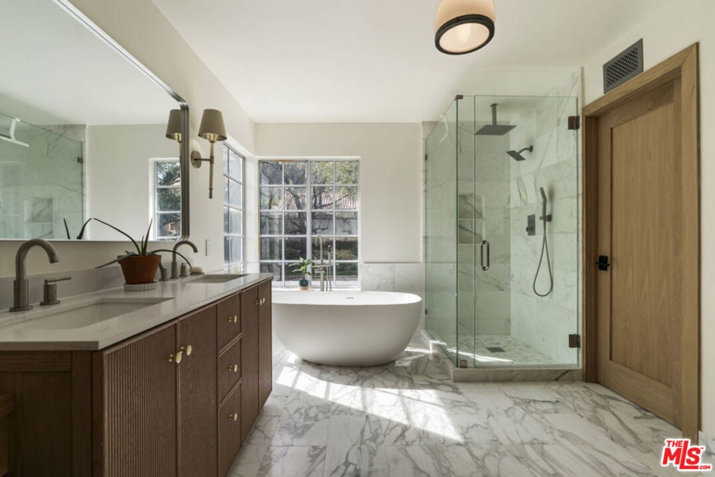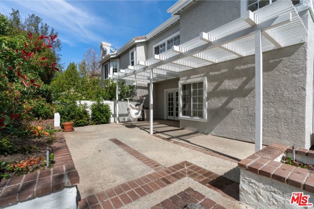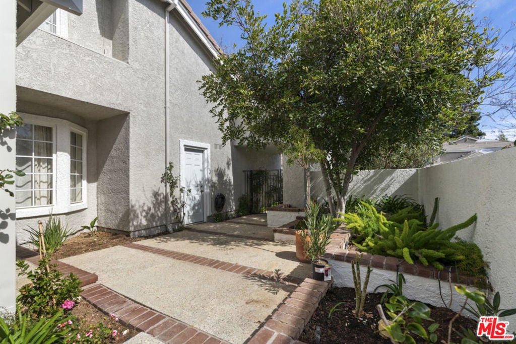 Stop searching. Call your moving company. It's time to submit your offer. This completely renovated North Ranch townhome in the Braemar community of Westlake Village offers 2,057 square feet, 2 bedrooms, and 3 bathrooms with high-end, thoughtful finishes throughout. Flooded with natural light, the home is complemented by soaring ceilings and oversized windows that create volume and openness from the moment you enter. A dramatic two-story entry showcases a Timothy Oulton Frozen Ring pendant suspended above the staircase, establishing a striking architectural focal point. White oak floors flow seamlessly across both levels, paired with custom white oak cabinetry and matching stair detailing for a cohesive, intentional design. The powder room is finished with limestone tile, an onyx sink, and curated fixtures. The kitchen balances form and function with marble countertops, a waterfall stone peninsula, GE and Samsung appliances, and a farmhouse sink. The main living area centers around a statement marble fireplace and opens through French doors to a private landscaped patio designed for effortless indoor-outdoor living. Upstairs, a versatile flex space offers room for a home office, gym, or secondary lounge. The primary suite delivers a spa-level experience with Calacatta marble floors and walls, a freestanding soaking tub framed by oversized windows, a glass-enclosed shower, and a custom vanity. The guest suite is complete with its own sitting area and a beautifully finished custom bathroom. Located in North Ranch, minutes from Boccaccio's, The Landing Grill & Sushi Bar, and The Promenade at Westlake with boutique retail and dining. HOA amenities include a community pool, spa, tennis and basketball courts, and a private park.