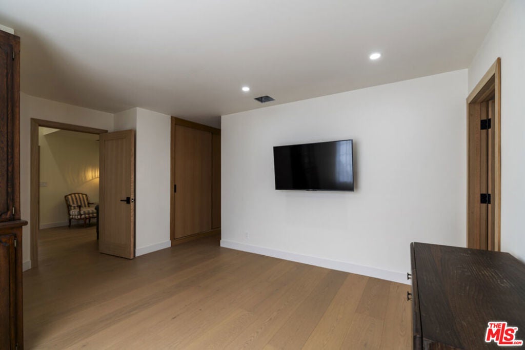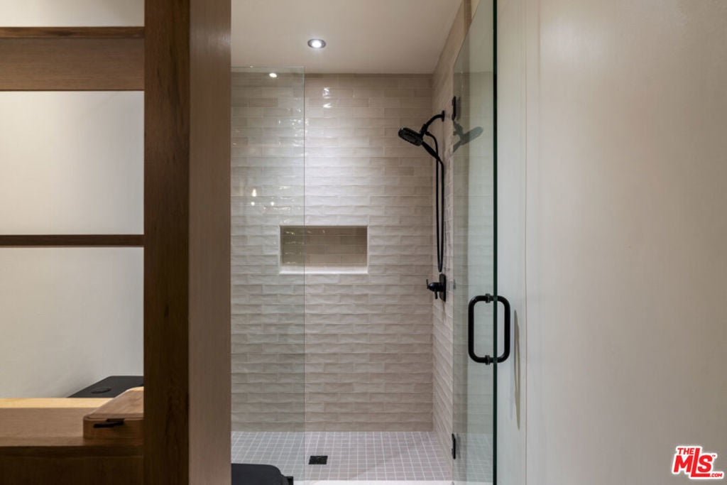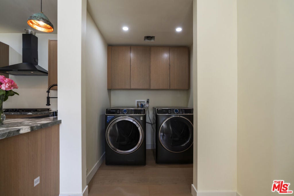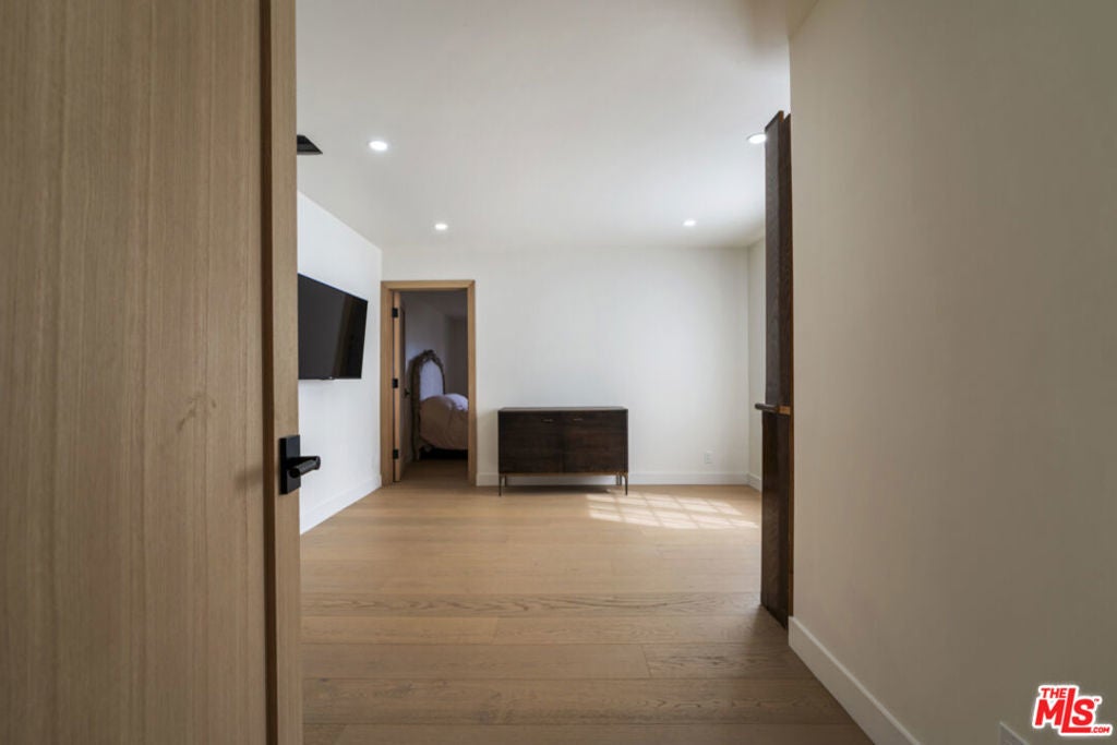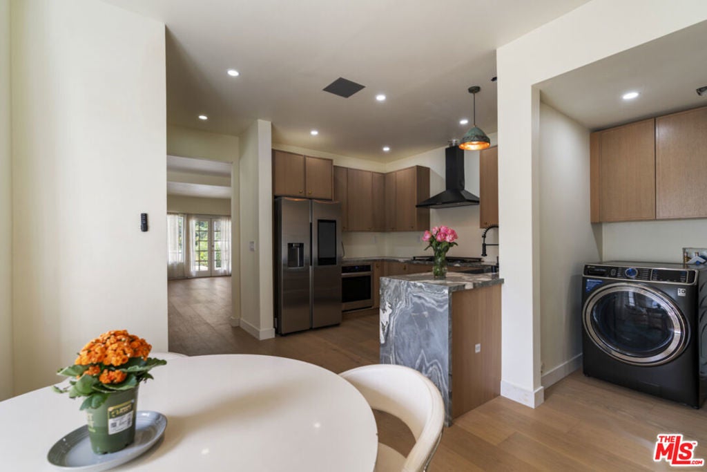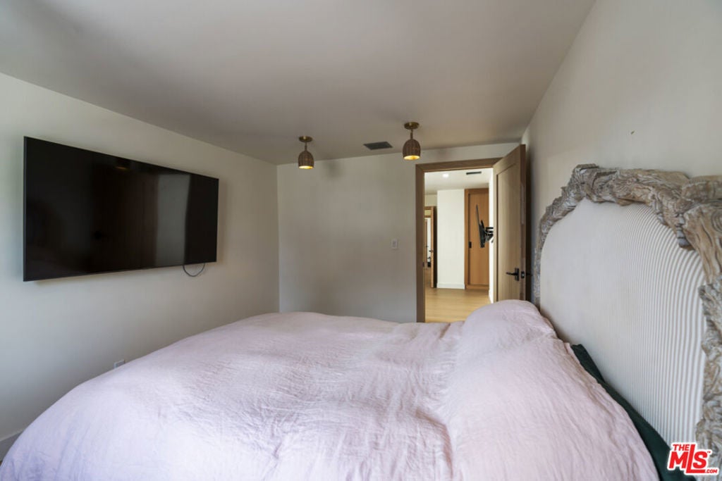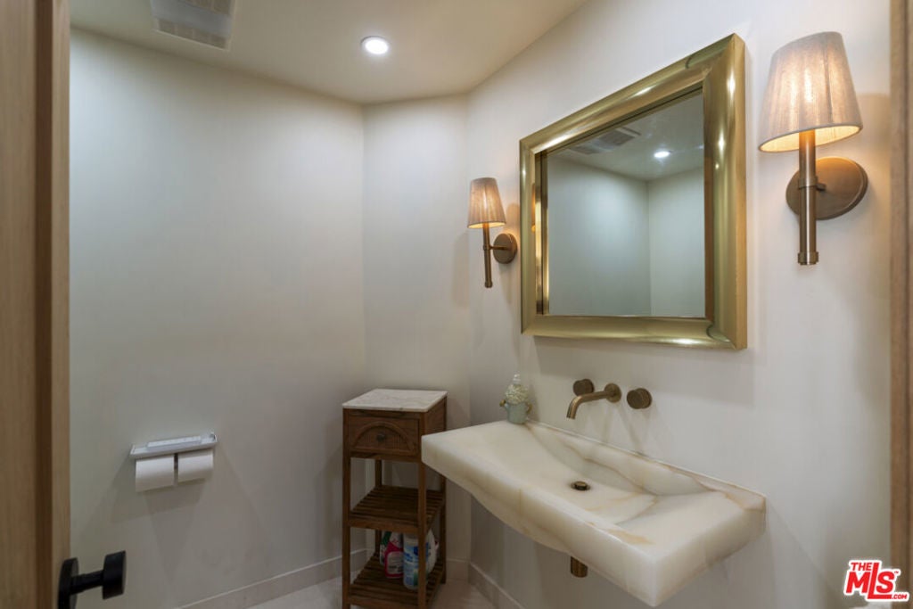 Stop searching. Call your moving company. It's time to submit your offer. This completely renovated North Ranch townhome in the Braemar community of Westlake Village offers 2,057 square feet, 2 bedrooms, and 3 bathrooms with high-end, thoughtful finishes throughout. Flooded with natural light, the home is complemented by soaring ceilings and oversized windows that create volume and openness from the moment you enter. A dramatic two-story entry showcases a Timothy Oulton Frozen Ring pendant suspended above the staircase, establishing a striking architectural focal point. White oak floors flow seamlessly across both levels, paired with custom white oak cabinetry and matching stair detailing for a cohesive, intentional design. The powder room is finished with limestone tile, an onyx sink, and curated fixtures. The kitchen balances form and function with marble countertops, a waterfall stone peninsula, GE and Samsung appliances, and a farmhouse sink. The main living area centers around a statement marble fireplace and opens through French doors to a private landscaped patio designed for effortless indoor-outdoor living. Upstairs, a versatile flex space offers room for a home office, gym, or secondary lounge. The primary suite delivers a spa-level experience with Calacatta marble floors and walls, a freestanding soaking tub framed by oversized windows, a glass-enclosed shower, and a custom vanity. The guest suite is complete with its own sitting area and a beautifully finished custom bathroom. Located in North Ranch, minutes from Boccaccio's, The Landing Grill & Sushi Bar, and The Promenade at Westlake with boutique retail and dining. HOA amenities include a community pool, spa, tennis and basketball courts, and a private park.