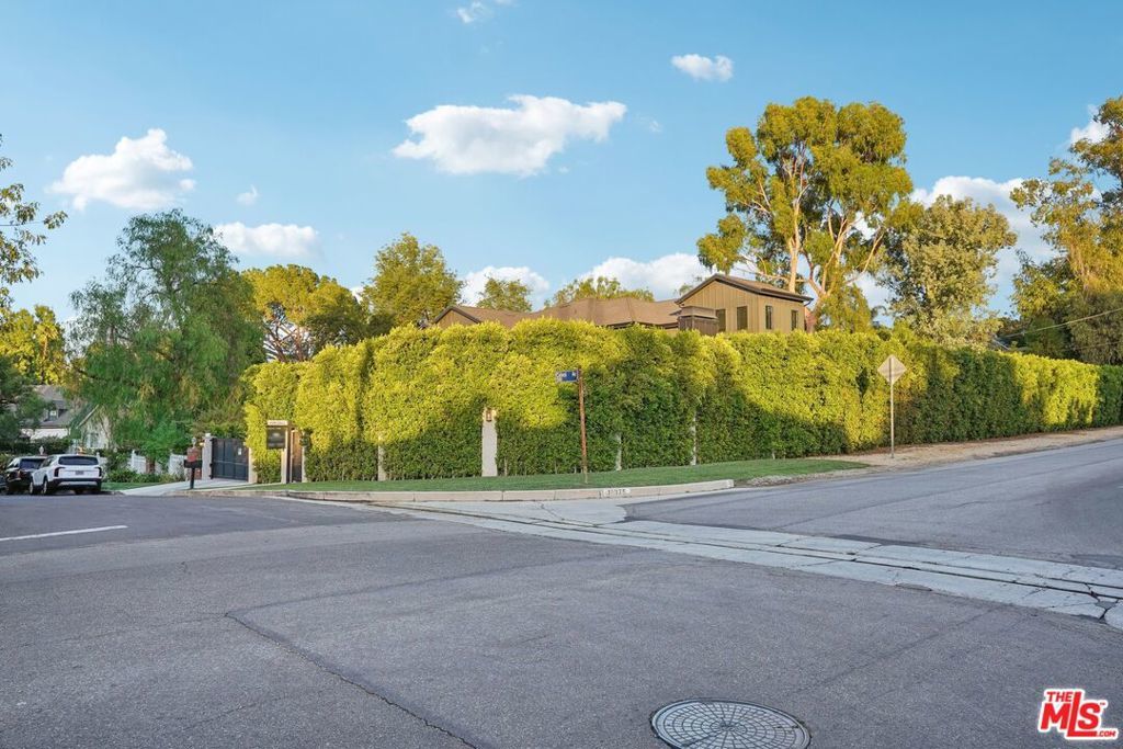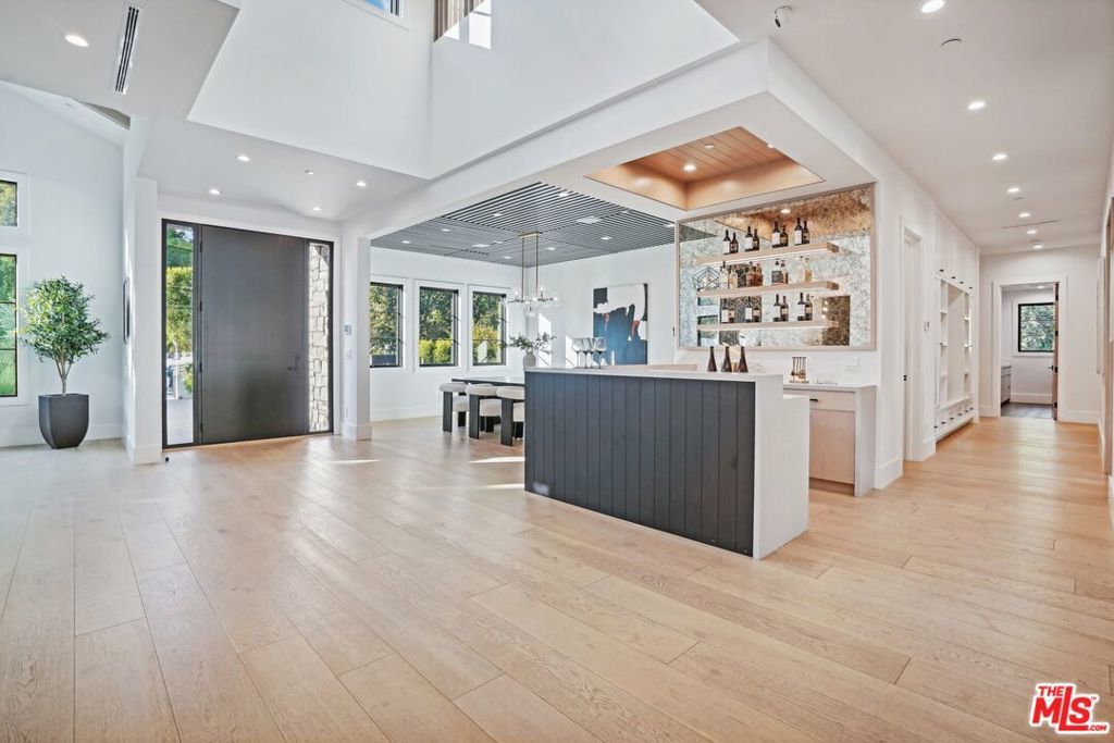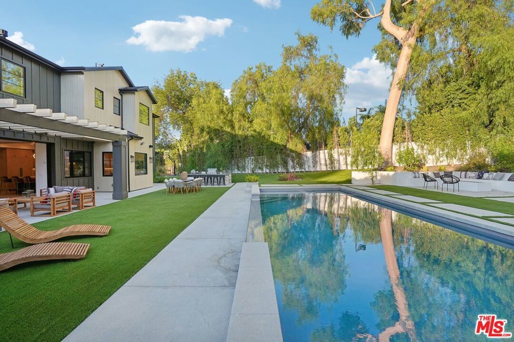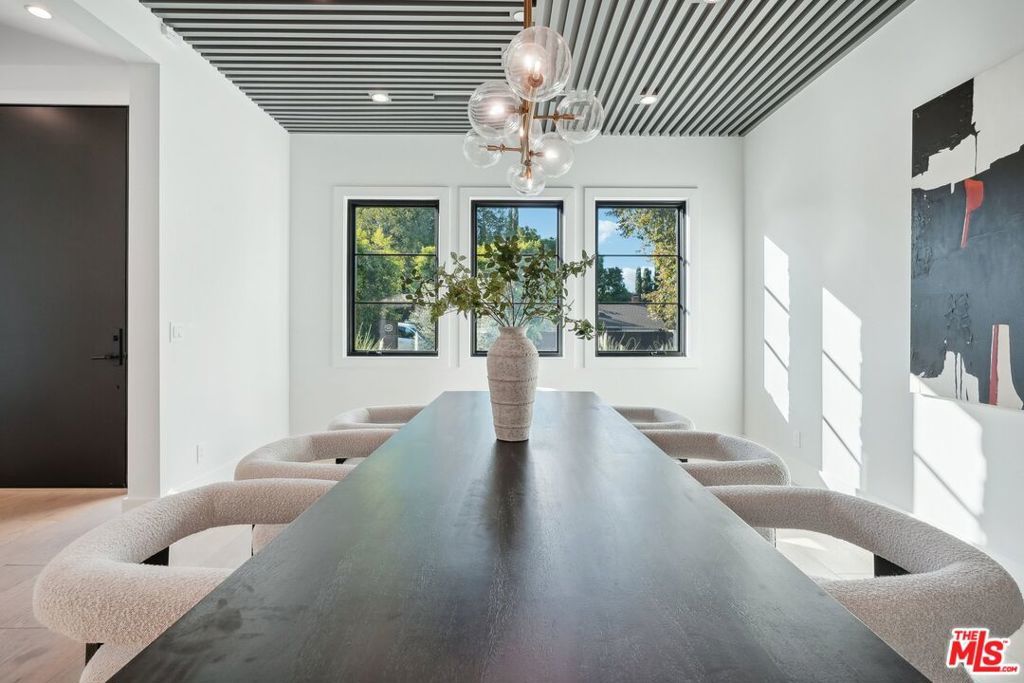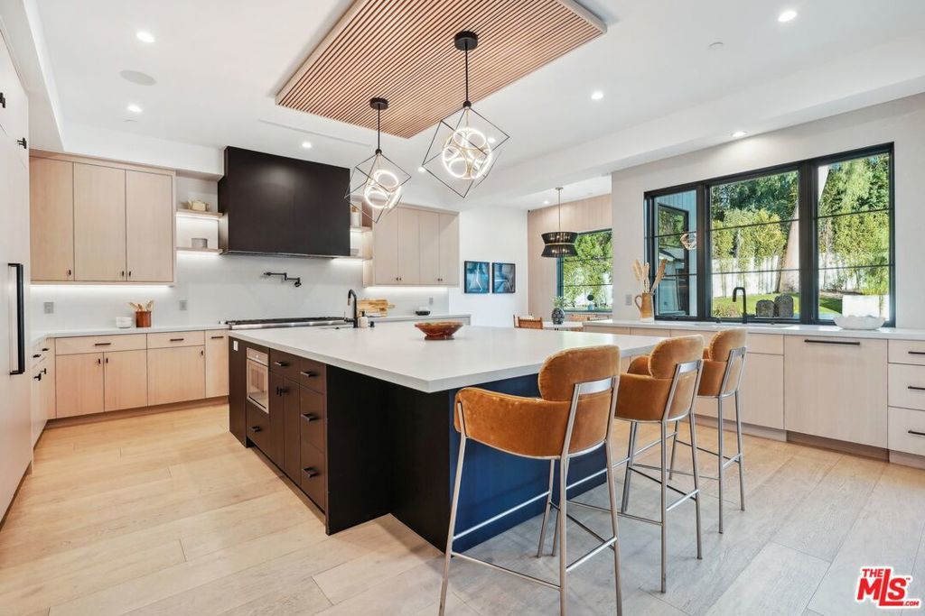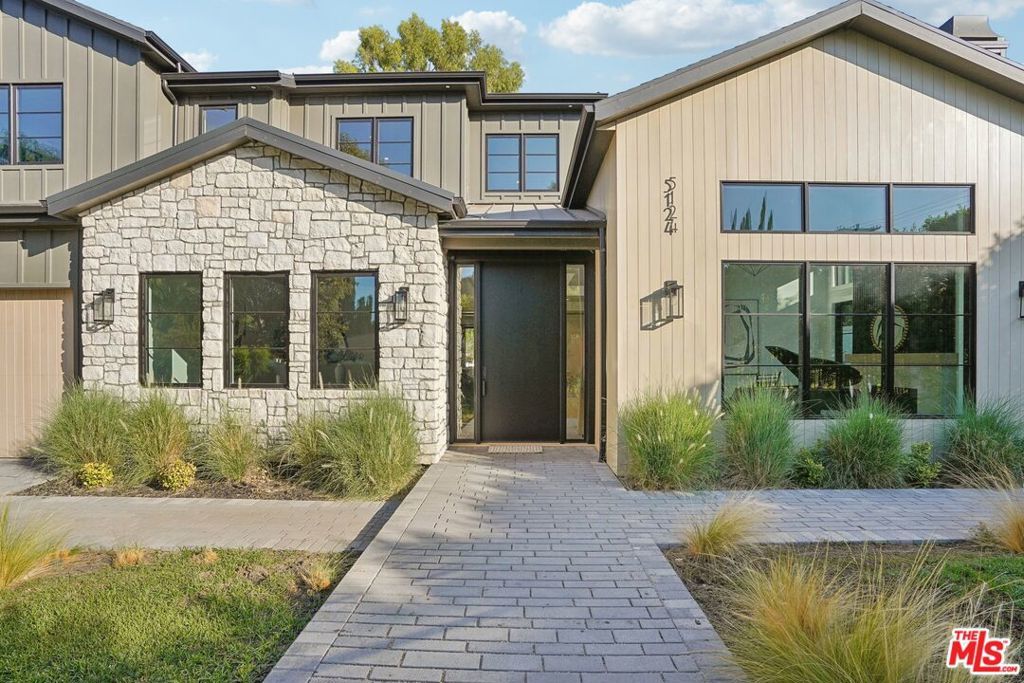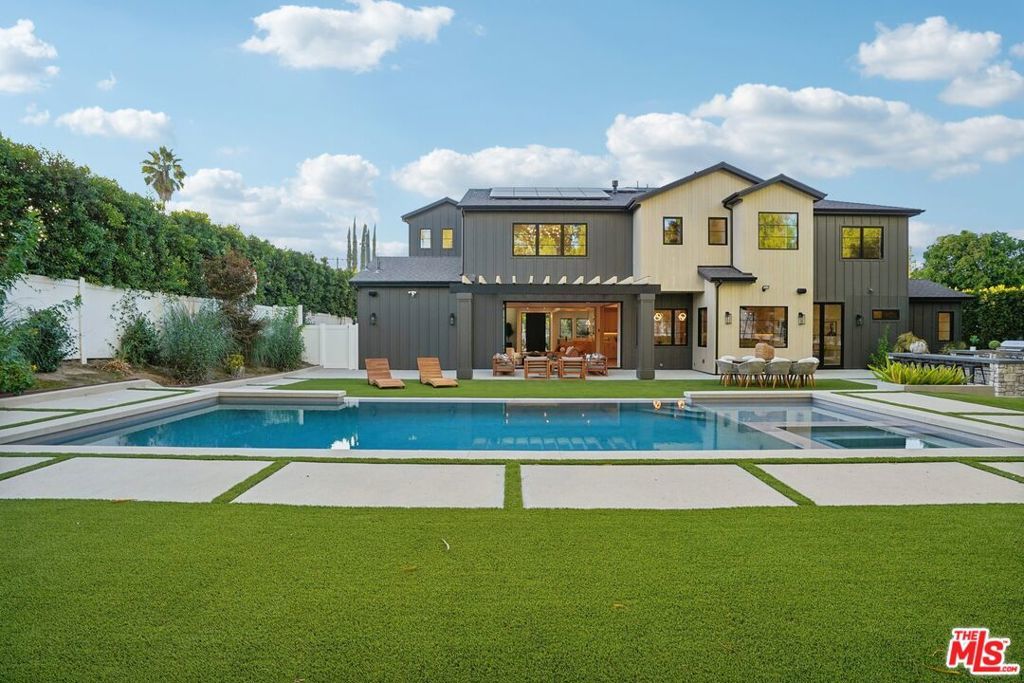 Discover the pinnacle of luxury in this brand-new gated estate located South of the Boulevard in the heart of Tarzana, CA. Built with the finest materials and high-end designer finishes, this secluded residence offers an exceptional living experience combined with the convenience of all the Valley has to offer. On the first floor, step through the oversized front door into an open-concept layout flooded with natural light from expansive windows and adorned with soaring ceilings. The living room, featuring a fireplace and two-story vaulted ceilings with exposed wood beams, exudes elegance. The formal dining room, perfect for hosting dinner parties and gatherings, is highlighted by a stunning wood slat ceiling. The gourmet kitchen is a chef's delight, boasting a massive center island with a breakfast counter, top-of-the-line appliances, a walk-in pantry, and a cozy breakfast nook. Adjacent to the kitchen, the family room offers a beautiful stone fireplace, built-in cabinetry, coffered ceilings, and pocket glass doors that transition effortlessly to outdoor living. Also on the main level, find a downstairs ensuite bedroom, an office with built-ins and a French door leading outside, a laundry room, a mudroom, a movie theater, and a dry bar with a wine fridge.