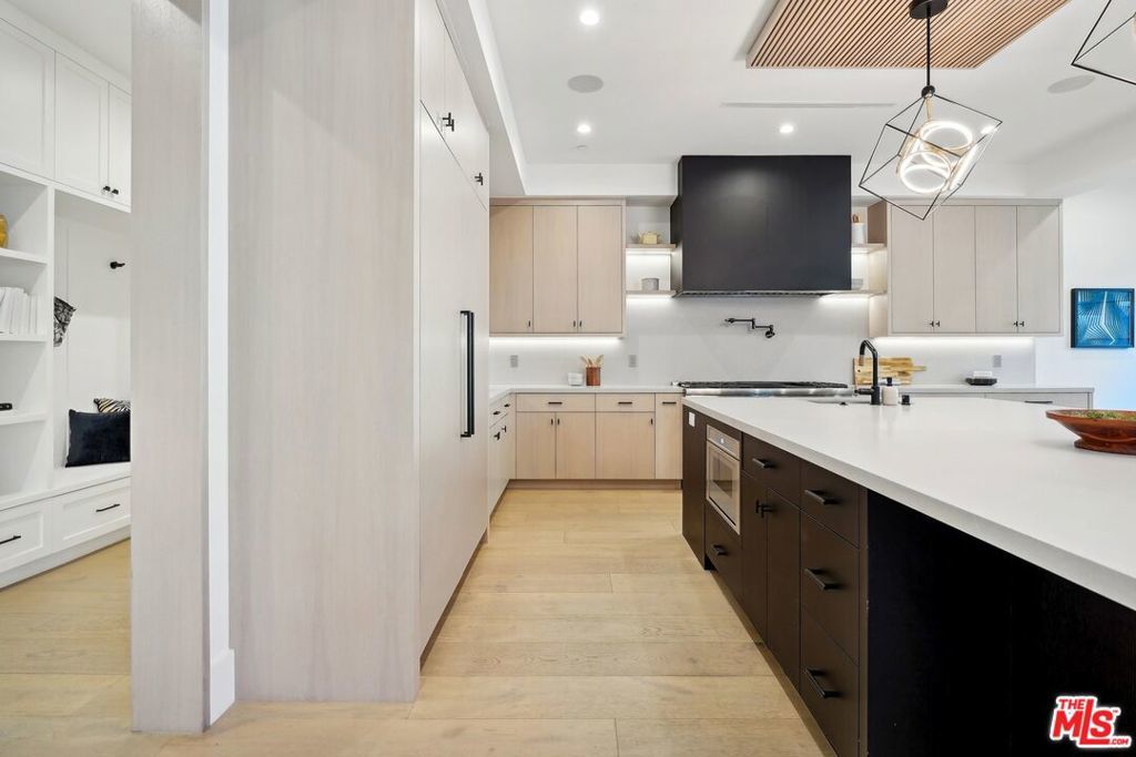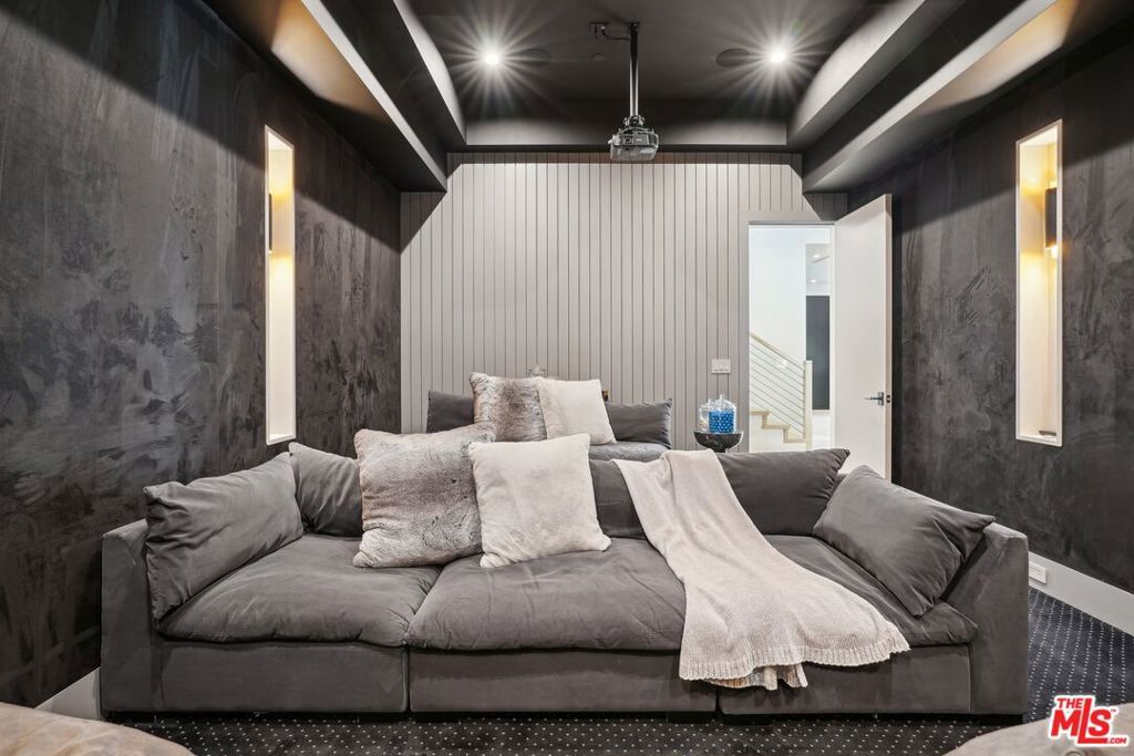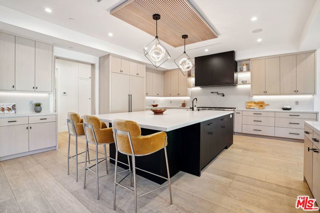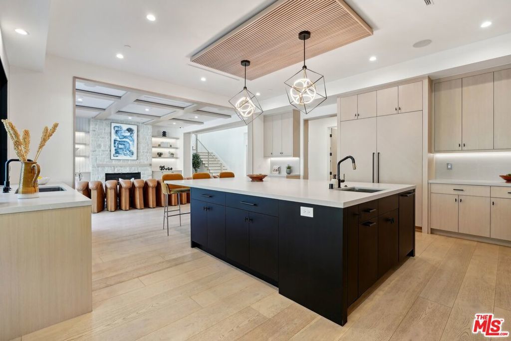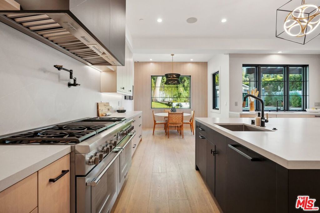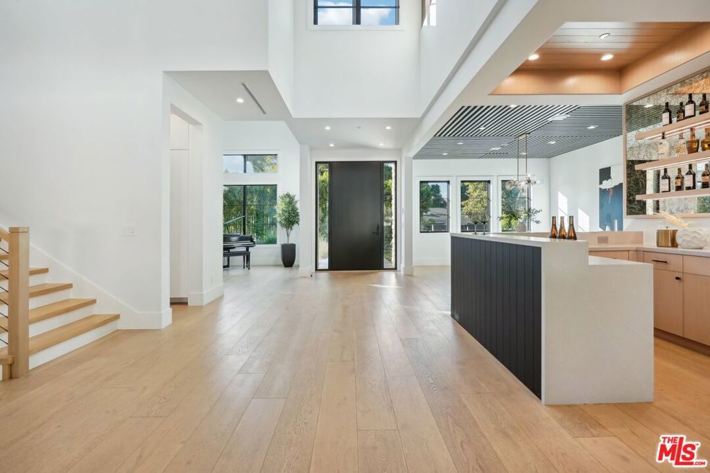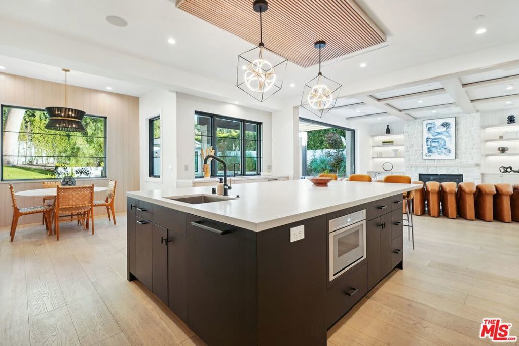 Discover the pinnacle of luxury in this brand-new gated estate located South of the Boulevard in the heart of Tarzana, CA. Built with the finest materials and high-end designer finishes, this secluded residence offers an exceptional living experience combined with the convenience of all the Valley has to offer. On the first floor, step through the oversized front door into an open-concept layout flooded with natural light from expansive windows and adorned with soaring ceilings. The living room, featuring a fireplace and two-story vaulted ceilings with exposed wood beams, exudes elegance. The formal dining room, perfect for hosting dinner parties and gatherings, is highlighted by a stunning wood slat ceiling. The gourmet kitchen is a chef's delight, boasting a massive center island with a breakfast counter, top-of-the-line appliances, a walk-in pantry, and a cozy breakfast nook. Adjacent to the kitchen, the family room offers a beautiful stone fireplace, built-in cabinetry, coffered ceilings, and pocket glass doors that transition effortlessly to outdoor living. Also on the main level, find a downstairs ensuite bedroom, an office with built-ins and a French door leading outside, a laundry room, a mudroom, a movie theater, and a dry bar with a wine fridge.