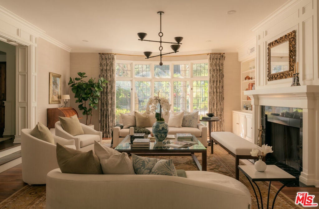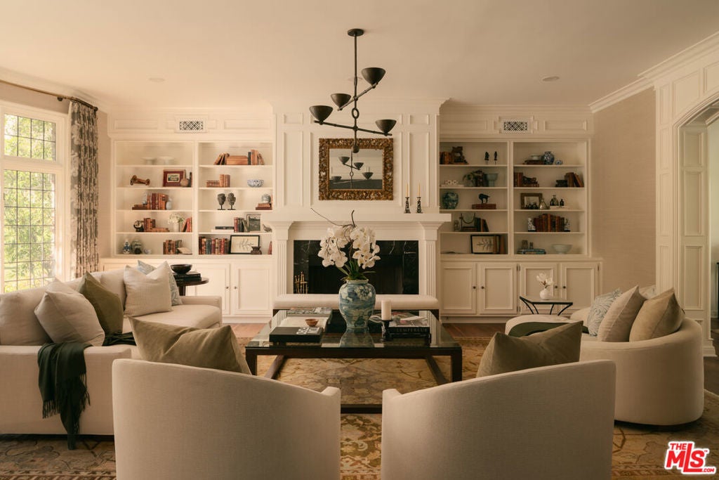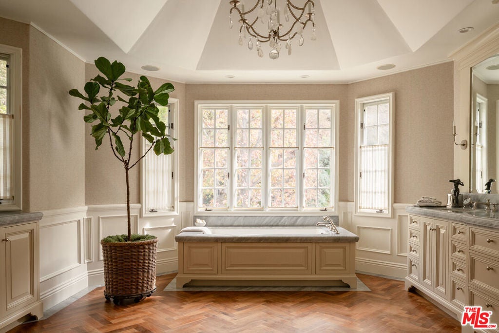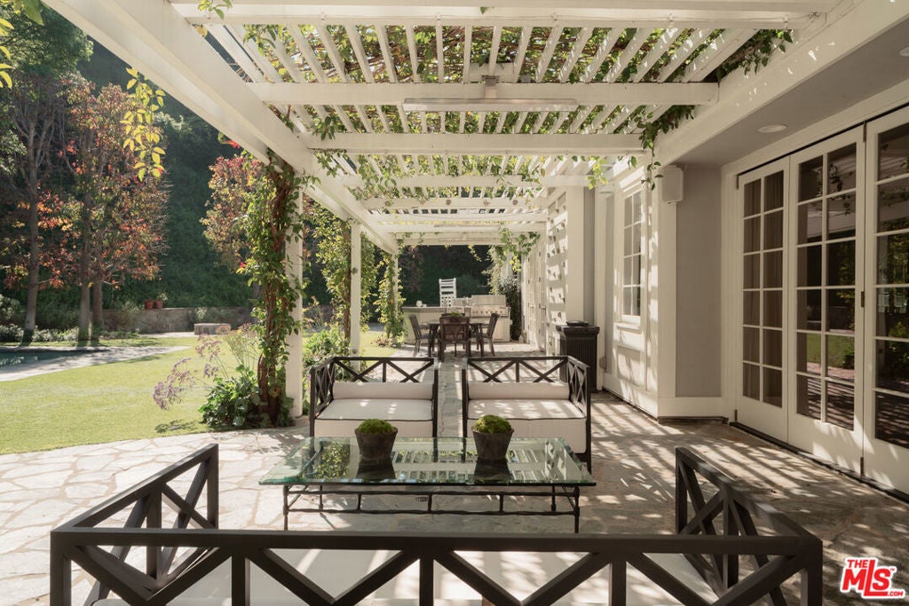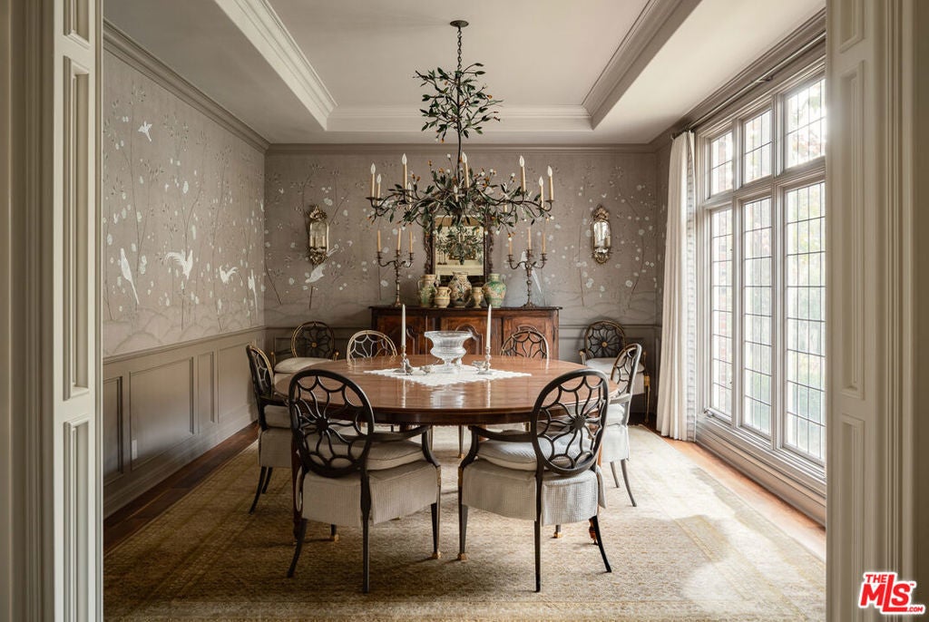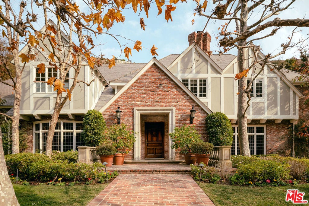 One of the most significant homes within the exclusive gates of Moraga Estates, among just 38 residences in this coveted Bel Air enclave. Discreetly set behind an expansive, tree-lined frontage stretching nearly 600 feet, the stately Tudor residence is surrounded by rolling hillside views, its classic brick faade softened by curated landscaping and a canopy of mature sycamores. Original parquet in the foyer with added custom walnut floors throughout and thick doors with hand-forged hardware anchor the interiors in material richness. The formal dining room is wrapped in hand-painted wallpaper with tall leaded-glass windows lining the room, drawing in soft natural light and framing tranquil views of the surrounding greenery. The chef's kitchen features Wolf appliances, a farmhouse sink, a large island, and an adjacent pantry includes a second refrigerator, a wine refrigerator, and large-capacity freezer. The kitchen dining area has a concealed pop-up television and access through three French doors that open to a trellised patio with Barbeque area. Nearby, a built-in bar with additional beverage, wine and ice machine. A separate wood-paneled library offers a quiet retreat with a large fireplace, custom built-ins, and an ensuite bath, making it ideal as an office or guest suite. One of the home's most artful vignettes, the powder room is wrapped in ethereal, painterly wallpaper and grounded by striking black marble flooring. An oval window with a radial grille casts soft, diffused light across the space, illuminating a hand-carved antique vanity and custom marble sink. The primary suite opens to a private terrace with sweeping hillside views often visited by deer. The bathroom evokes the feeling of a treehouse spa with large windows, dual vanities with filtered water, dual toilet closets with Toto Washlets, a seven-foot soaking tub, and a multi-head rain shower. Chevron-patterned walnut and marble floor and ambient lighting add a sense of calm and continuity. Double dressing rooms include custom cabinetry and built-in safes. The guest wing includes three generously sized bedrooms with ensuite baths and walk-in closets. Along the hallway there's additional storage with three walk-in closets and two linen cabinets. Further down the hallway is a family lounge and a large bonus room that currently serves as a music studio. An additional guest bedroom, walk-in closet and bath is down the backstairs. Outside, a vine-draped pergola runs the full length of the home, strung with twinkle lights and warmed by built-in heaters. The grounds feature a large pool and spa, Swedish sauna, herb garden, firepit with lounge seating, a separate pool bathroom with shower, climbing wall, gymnastics rings, yoga sling, and Rogue stall bars. A fully equipped outdoor kitchen and dining area enhance the experience. The stone driveway leads to a gated portico and an expansive motor court with access to the climate-controlled three-car garage. Security is paramount on Moraga Drive. The community security features 24-hour gated guard service, roving patrol vehicles, and a self-launching drone with infrared technology, making Moraga one of the most advanced residential surveillance systems in the country.
