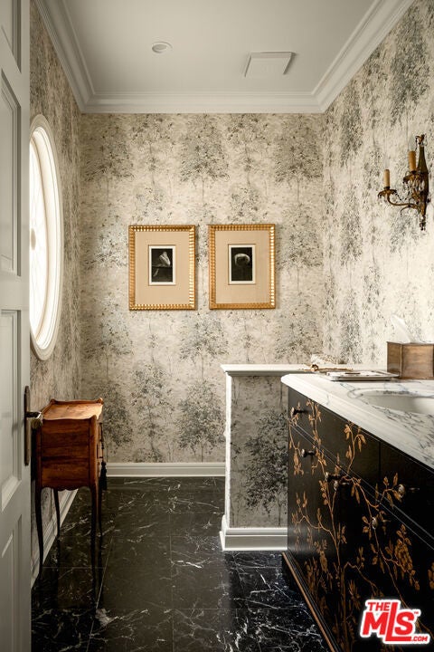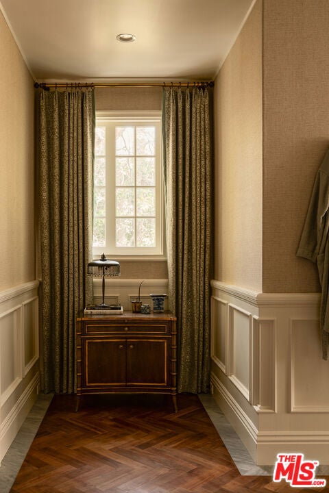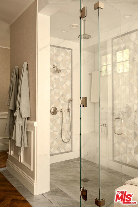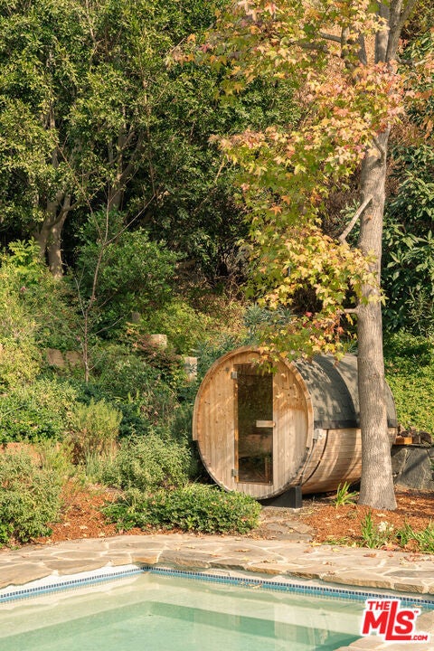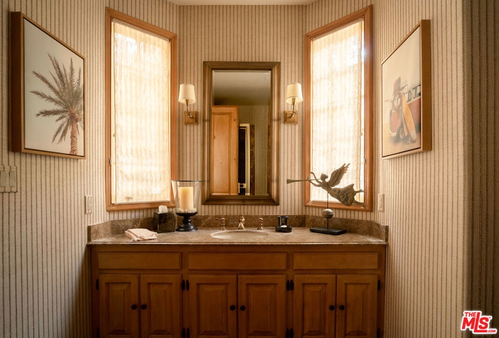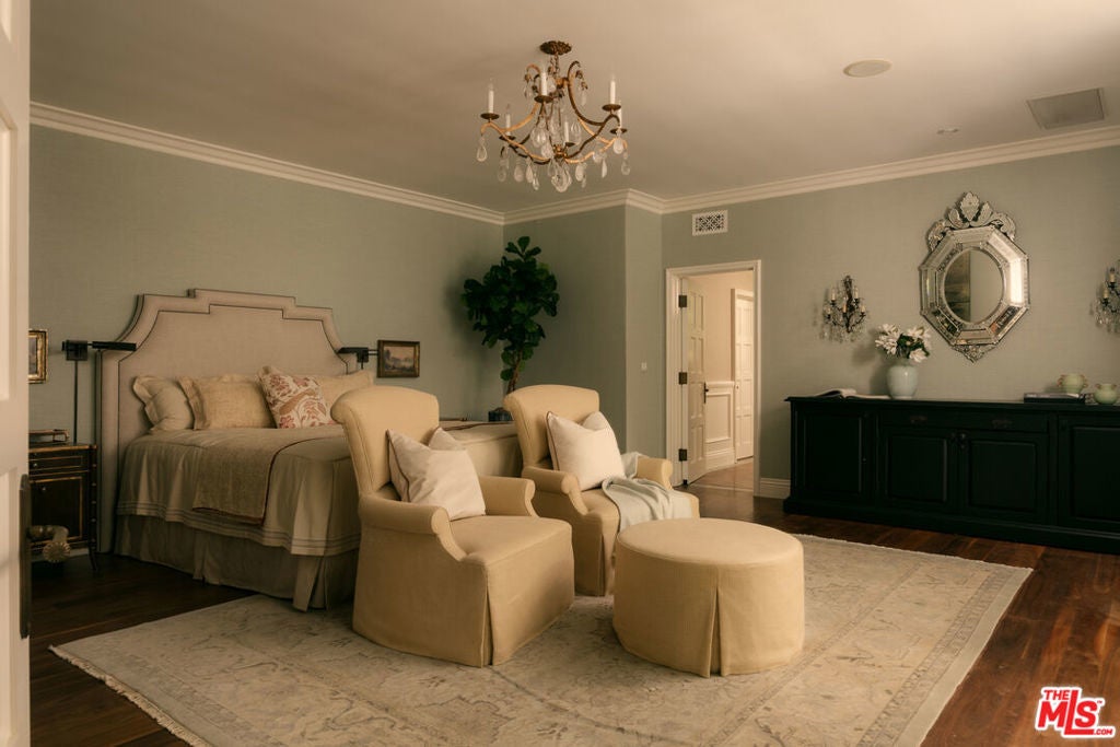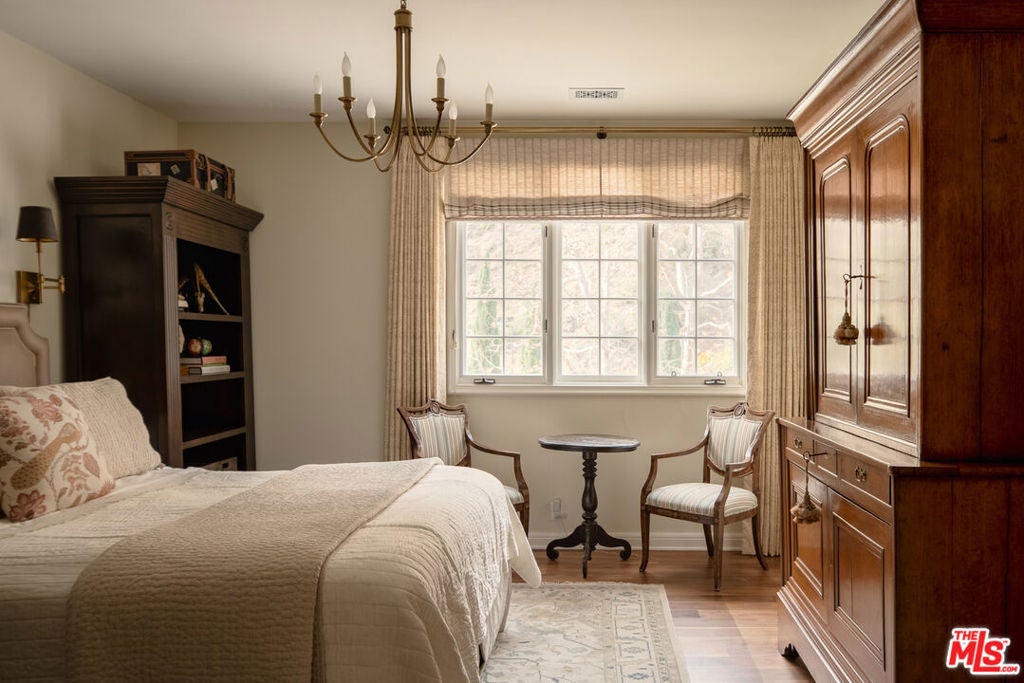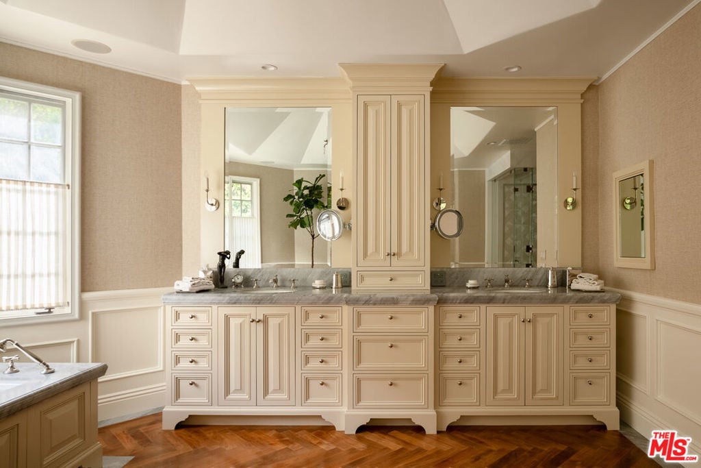 One of the most significant homes within the exclusive gates of Moraga Estates, among just 38 residences in this coveted Bel Air enclave. Discreetly set behind an expansive, tree-lined frontage stretching nearly 600 feet, the stately Tudor residence is surrounded by rolling hillside views, its classic brick faade softened by curated landscaping and a canopy of mature sycamores. Original parquet in the foyer with added custom walnut floors throughout and thick doors with hand-forged hardware anchor the interiors in material richness. The formal dining room is wrapped in hand-painted wallpaper with tall leaded-glass windows lining the room, drawing in soft natural light and framing tranquil views of the surrounding greenery. The chef's kitchen features Wolf appliances, a farmhouse sink, a large island, and an adjacent pantry includes a second refrigerator, a wine refrigerator, and large-capacity freezer. The kitchen dining area has a concealed pop-up television and access through three French doors that open to a trellised patio with Barbeque area. Nearby, a built-in bar with additional beverage, wine and ice machine. A separate wood-paneled library offers a quiet retreat with a large fireplace, custom built-ins, and an ensuite bath, making it ideal as an office or guest suite. One of the home's most artful vignettes, the powder room is wrapped in ethereal, painterly wallpaper and grounded by striking black marble flooring. An oval window with a radial grille casts soft, diffused light across the space, illuminating a hand-carved antique vanity and custom marble sink. The primary suite opens to a private terrace with sweeping hillside views often visited by deer. The bathroom evokes the feeling of a treehouse spa with large windows, dual vanities with filtered water, dual toilet closets with Toto Washlets, a seven-foot soaking tub, and a multi-head rain shower. Chevron-patterned walnut and marble floor and ambient lighting add a sense of calm and continuity. Double dressing rooms include custom cabinetry and built-in safes. The guest wing includes three generously sized bedrooms with ensuite baths and walk-in closets. Along the hallway there's additional storage with three walk-in closets and two linen cabinets. Further down the hallway is a family lounge and a large bonus room that currently serves as a music studio. An additional guest bedroom, walk-in closet and bath is down the backstairs. Outside, a vine-draped pergola runs the full length of the home, strung with twinkle lights and warmed by built-in heaters. The grounds feature a large pool and spa, Swedish sauna, herb garden, firepit with lounge seating, a separate pool bathroom with shower, climbing wall, gymnastics rings, yoga sling, and Rogue stall bars. A fully equipped outdoor kitchen and dining area enhance the experience. The stone driveway leads to a gated portico and an expansive motor court with access to the climate-controlled three-car garage. Security is paramount on Moraga Drive. The community security features 24-hour gated guard service, roving patrol vehicles, and a self-launching drone with infrared technology, making Moraga one of the most advanced residential surveillance systems in the country.
