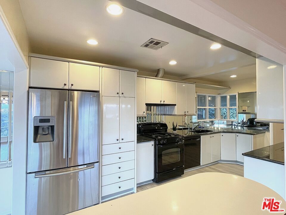Hidden behind gates on a scenic Studio City hillside, this striking residence offers three bedrooms, three bathrooms, and sweeping panoramic city-to-mountain views. Expansive windows and glass doors flood the home with natural light, creating a seamless indoor-outdoor flow ideal for both entertaining and quiet evenings in. The full kitchen opens to generous living areas anchored by a statement fireplace, adding warmth and architectural character. A covered garage, additional parking, and a gated driveway provide rare convenience and privacy. Set above it all, this home delivers a refined retreat with commanding views and undeniable presence.