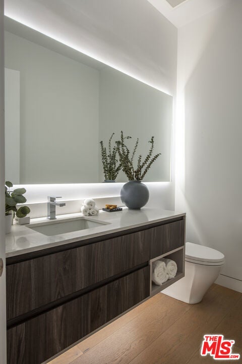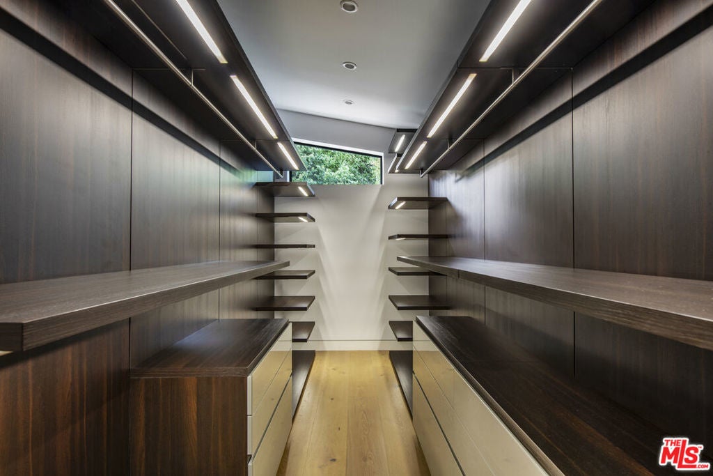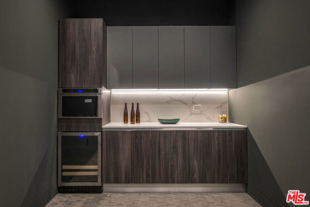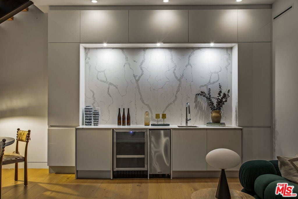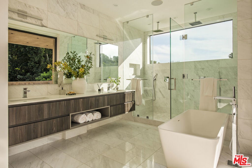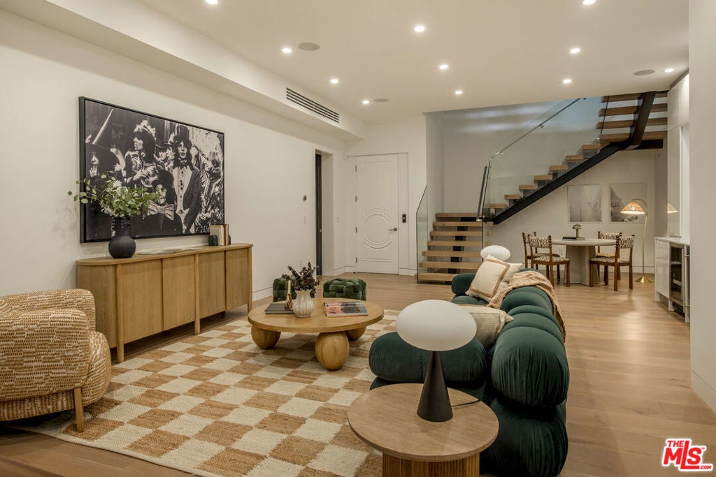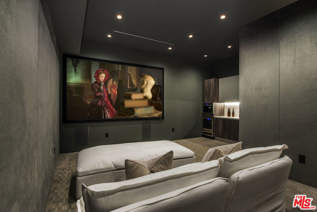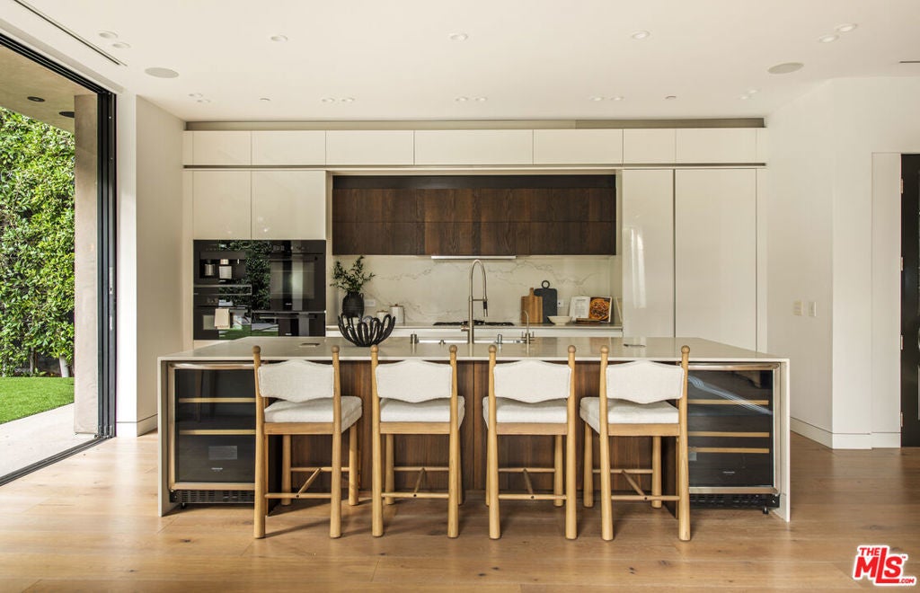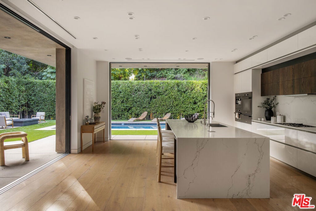 Perfectly positioned behind towering privacy hedges in Beverly Hills, this modern oasis sets a new standard of contemporary living, blending elevated design with the quintessential California lifestyle. A luminous open floor plan is framed by soaring ceilings and expansive gallery-style windows. Retractable Fleetwood walls-of-glass dissolve the boundary between inside and out. Wide-plank oak floors, a sleek fireplace, open dining area, and stylish powder room anchor the main living spaces. The European-inspired chef's kitchen is appointed with waterfall countertops, Miele appliances, wine storage, and refined custom finishes. The primary suite is scenic, with a spa-like bathroom and private balcony. Three additional ensuite bedrooms, along with multiple bonus/flex rooms are ideal for an office, den, gym, or maid's quarters. Designed for elevated entertaining, the lower level hosts a lounge with two bars, powder room, and a state-of-the-art screening room. Outdoors, an expansive patio overlooks a secluded, resort-style backyard complete with a sparkling pool and spa, outdoor kitchen, and fire pit. Crowning the residence is a stylish rooftop deck with fire pit, offering city and canyon views. Additional highlights include automated smart-home technology, surround sound, elevator, gated entry with circular driveway, and a two-car garage. Just minutes from the heart of Beverly Hills, this exceptional Modern estate presents a rare opportunity to own a feature-rich, design-forward home.