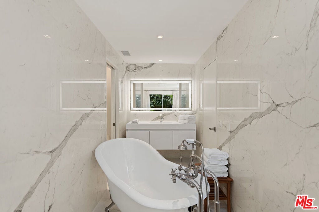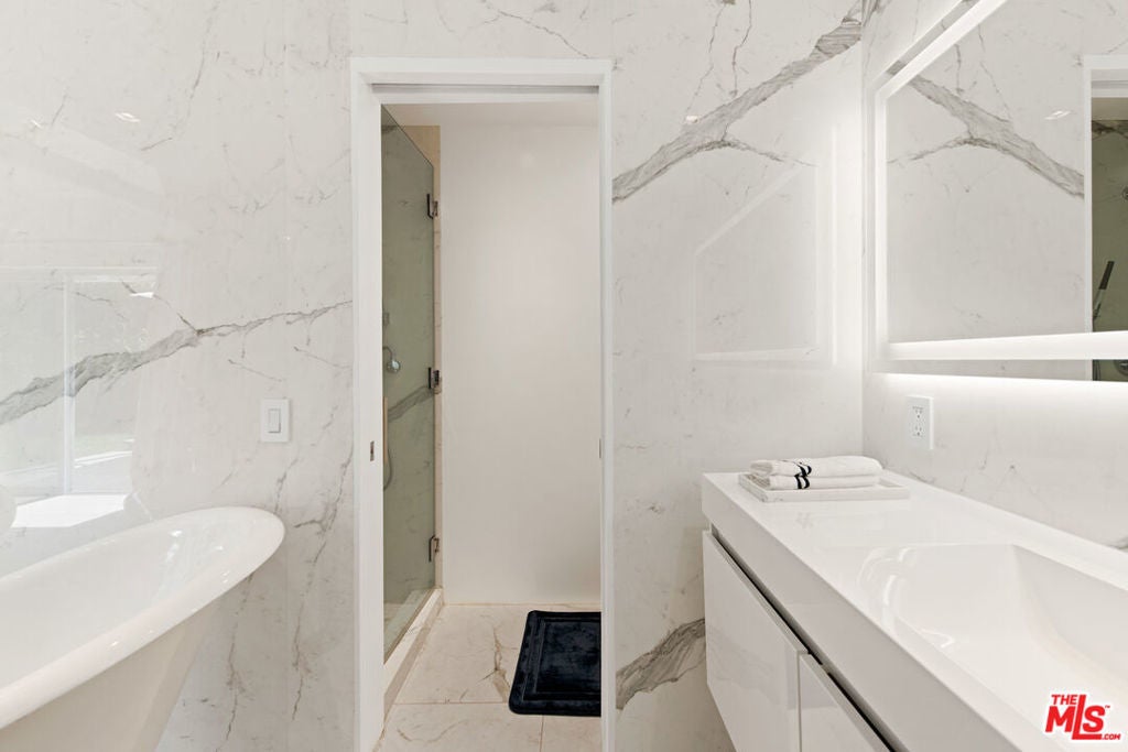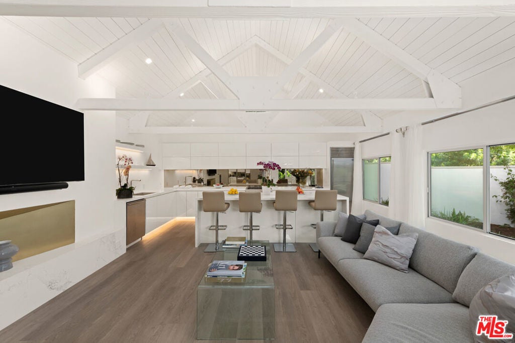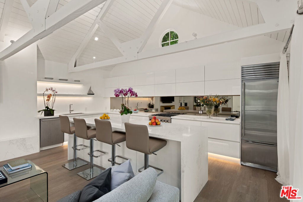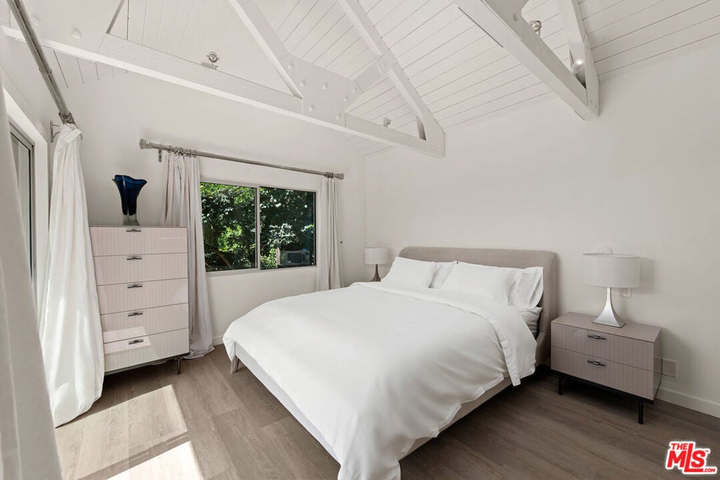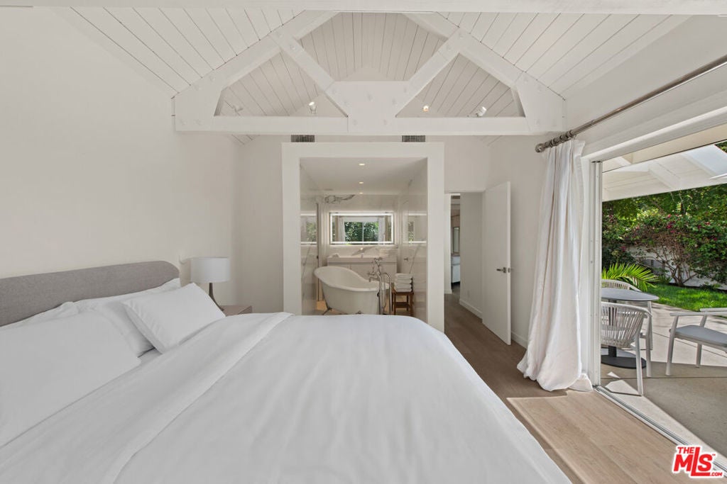 The perfect Malibu getaway, Petit Chateau des Bois is a single-level garden guesthouse with bright, spacious interiors updated for superb comfort and relaxed indoor-outdoor living and entertaining. Gated and very private, life at the chateau revolves around a large, open great room with vaulted, trussed ceilings, fireplace, wood floors, ample seating, and a storage loft. This lovely space, with multiple sets of garden-facing windows, adjoins the beautifully updated kitchen, which has a waterfall-style island with bar seating, dramatic under-cabinet lighting, abundant storage space, and top-quality appliances. The all-marble spa-style bath is immaculate and charming, with a freestanding tub. The bedroom has high, trussed ceilings and wide sliding glass doors that open to a wraparound patio and lawn for relaxing, dining, and entertaining. The property is equipped with air conditioning, DoorBird system, parking, and a backyard shed with laundry and storage space. An occasional creek sits on the property line. This is an ideal escape, close to Point Dume, beaches, and miles of trails for hiking and riding.