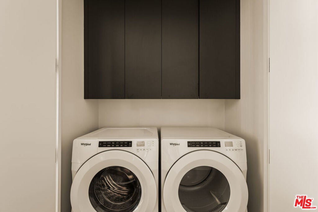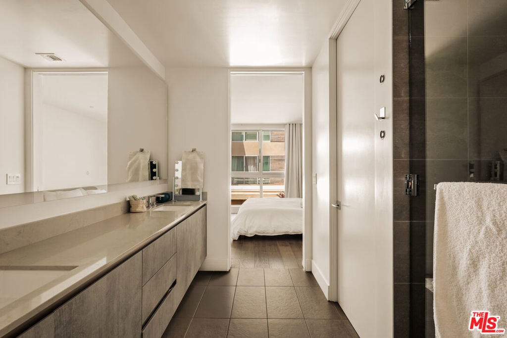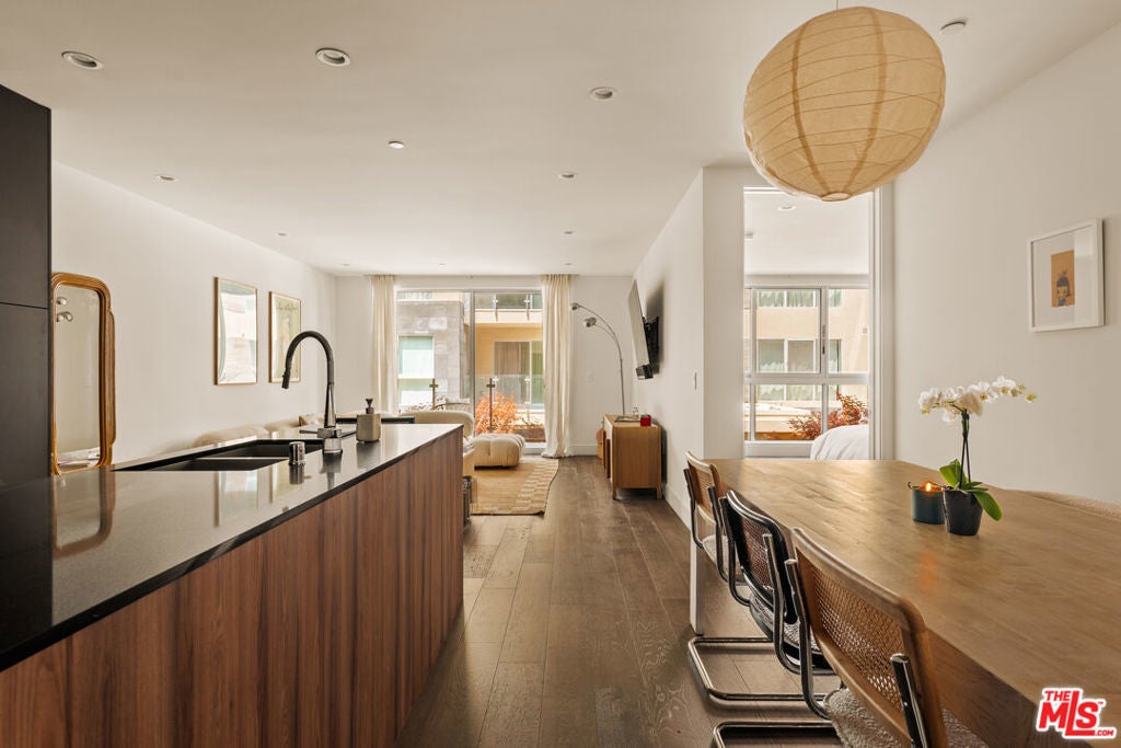 The residence unfolds with warm, thoughtful design and clean architecture, layered with texture and modern details. The open-plan layout is anchored by a striking kitchen that balances function and design: custom flat-front cabinetry in rich wood and charcoal tones pairs beautifully with sleek black stone countertops. Professional-grade Wolf appliances, a stainless steel vent hood, and an integrated Sub-Zero refrigerator elevate the kitchen into a true culinary workspace, while a waterfall island with an oversized sink invites both cooking and gathering. Adjacent to the kitchen, a dedicated dining area comfortably accommodates a full dining table, making it ideal for entertaining. Beyond the kitchen, the living area is framed by expansive windows that bring in soft daylight, along with a generous seating area. The flow between kitchen, dining, and living spaces feels seamless yet intentional, making the home equally suited for hosting or quiet retreat. Sliding glass doors and large panes of glass visually extend the living space outward, in addition to a large balcony. The bedroom is serene and spacious, offering room for a king-size bed and additional furnishings without compromising openness. Floor-to-ceiling windows continue the theme of light and calm, while custom window treatments provide privacy. The ensuite bathroom features a long stone vanity with ample storage and a walk-in glass shower. Finishes are clean, modern, and timeless. Completing the residence is a discreet laundry closet with full-size Whirlpool washer and dryer and custom upper cabinetry. It's a space designed for contemporary living, where beauty and functionality exist in equal measure, offering a refined yet effortless place to call home.