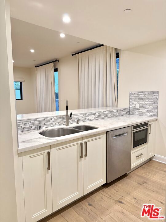 Nestled on serene, tree-lined Ashton Avenue in the heart of West LA, this stylish condo offers sleek sophistication. Surrounded by multi-million-dollar homes that create a safe, true-community atmosphere, the residence features high ceilings, gleaming hardwood floors, recessed LED lighting, and a cozy gas fireplace that set an inviting tone for relaxing or entertaining. The gourmet kitchen impresses with Italian-style cabinetry, luxurious countertops, a premium Bertazzoni gas range, Bosch stainless-steel appliances, and an open breakfast bar that flows effortlessly into the dining area. The expansive primary suite provides a private sanctuary with a generous walk-in closet and a spa-like bathroom boasting ample space, an oversized shower, and a deep soaking tub. A well-proportioned second bedroom with its own full bath adds flexibility for guests, a home office, or additional living space. Step outside to your private balcony for a peaceful retreat perfect for morning coffee or evening unwinding. Walking distance to the highly sought-after, top-rated Fairburn Avenue Elementary School, and minutes from UCLA, Westwood Village and Century City. This location delivers West LA living at its absolute finest. 2 garage parking spots included.