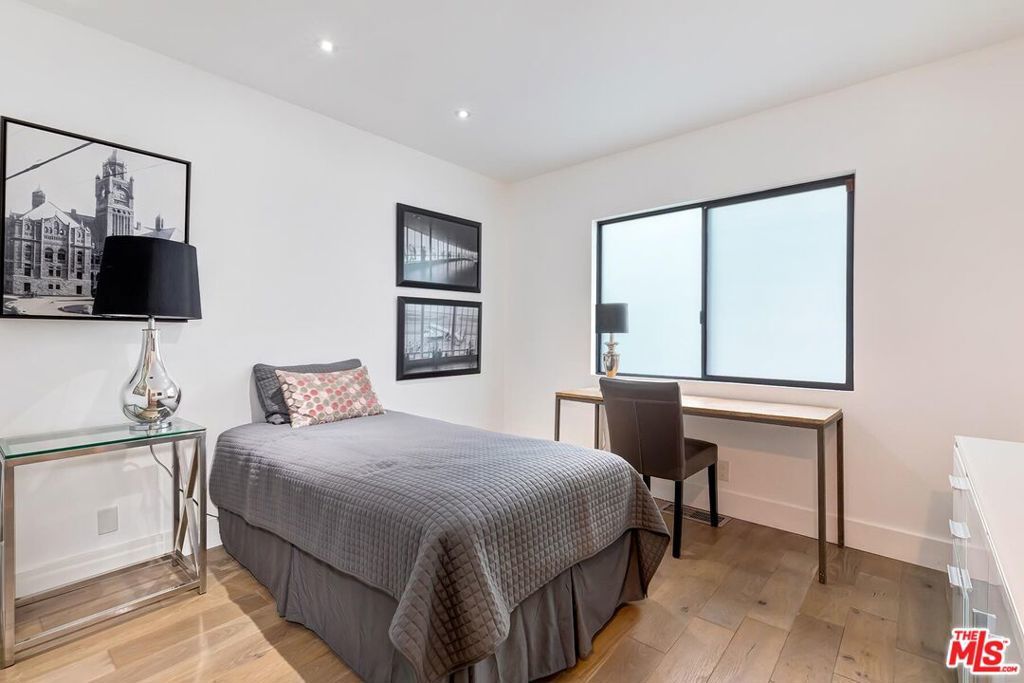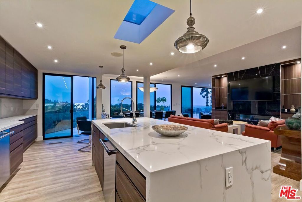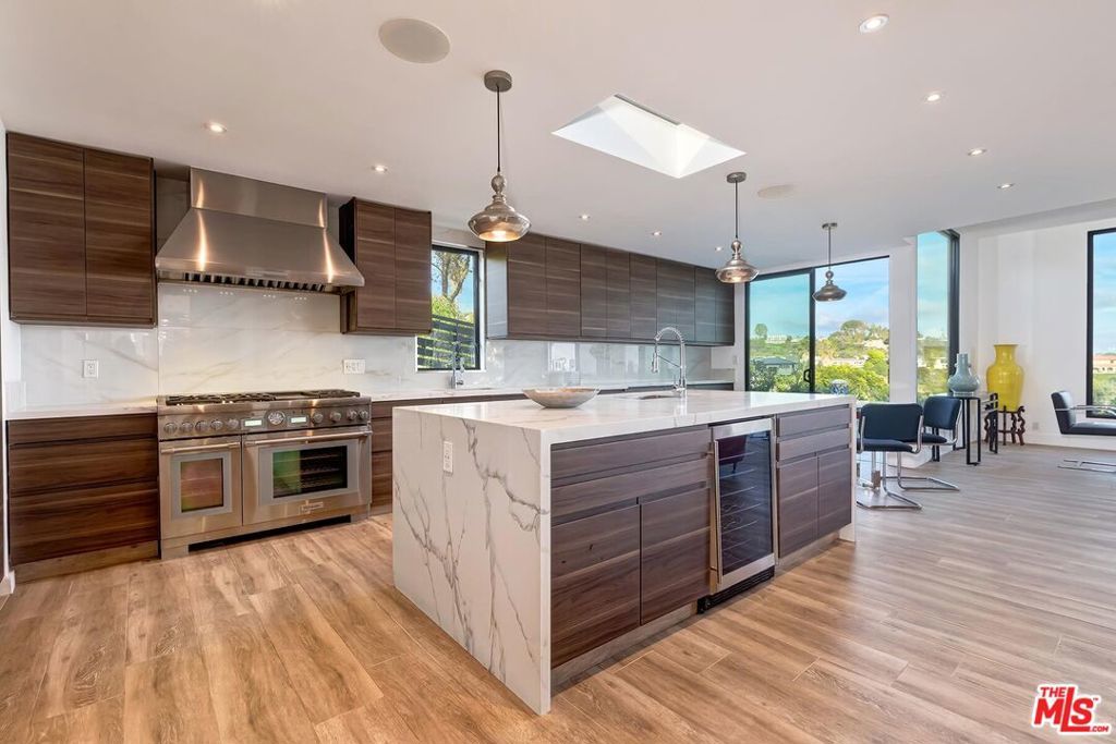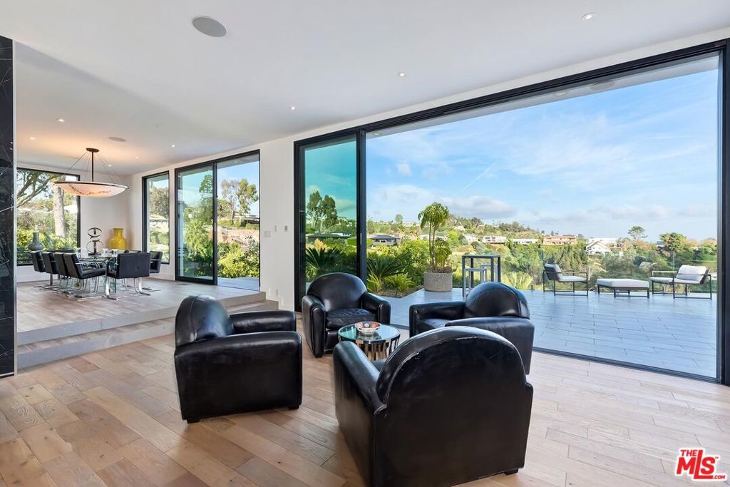 Absolutely breathtaking city and hillside views define this single-story contemporary in prime Bel Air. Featuring 4 bedrooms, 5.5 baths, and a dedicated office, this fully remodeled & move in ready residence showcases sleek, modern design and a sophisticated, contemporary aesthetic throughout. Sun-drenched interiors with expansive walls of glass seamlessly connect indoor and outdoor living. A spectacular backyard retreat with a pool, spa, and oversized entertainer's patio all set against panoramic, head-on views. Designed for both grand-scale entertaining and effortless everyday living with an impressive living room, formal dining area, and a lounge-style wet bar. The open-concept kitchen flows directly into the family room, creating a true gathering space at the heart of the home. A luxurious large primary suite opens to the backyard and features two private bathrooms with two oversized walk-in closets. Bedrooms 2 & 3 offer generous proportions with en-suite baths, while a 4th bedroom located just off the kitchen provides flexibility for guests or staff. Spacious three-car direct-entry garage and convenient circular driveway. Completely private and serene, this is a rare opportunity to own a single-story, move in ready contemporary with extraordinary views in one of Los Angeles' most coveted neighborhoods. Furnishing available for separate purchase.