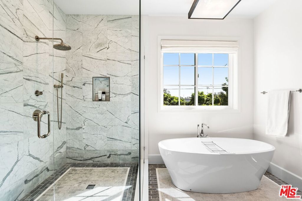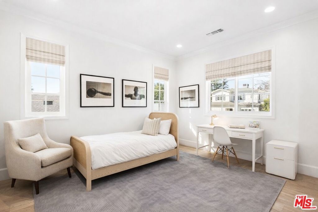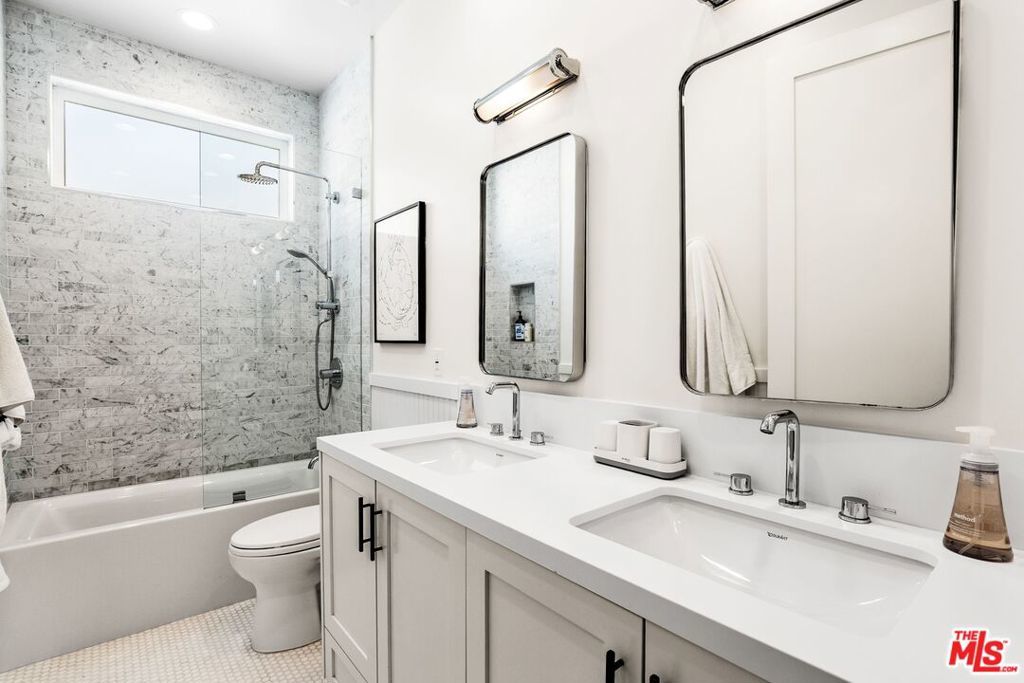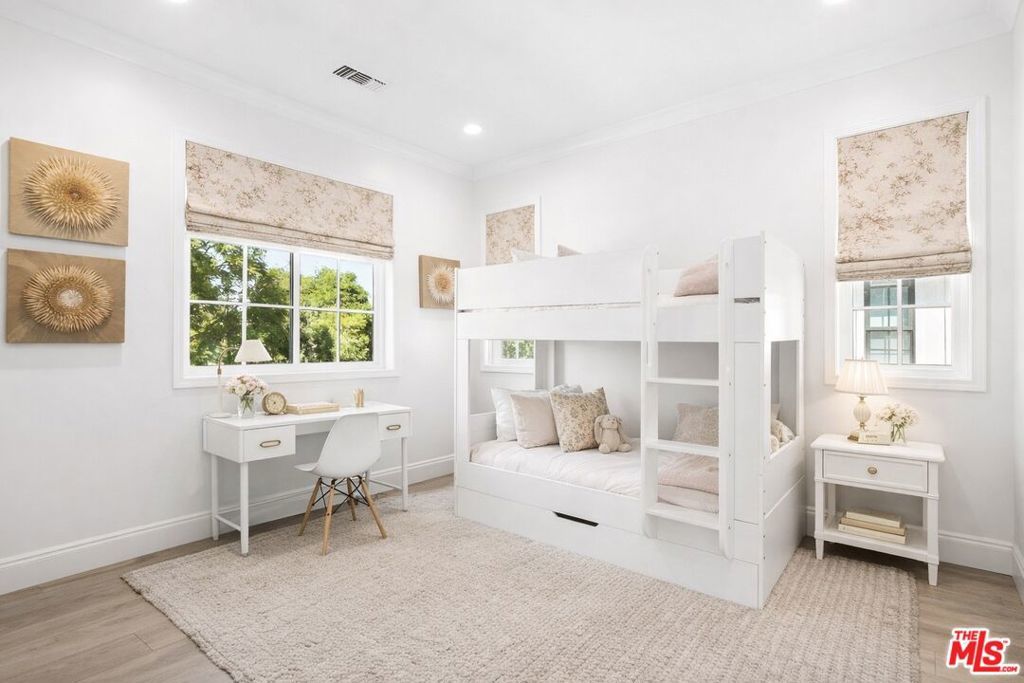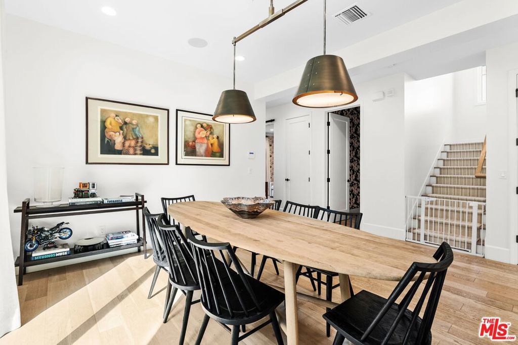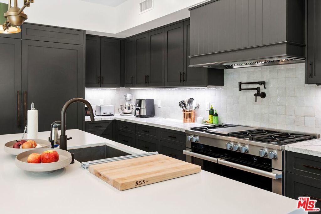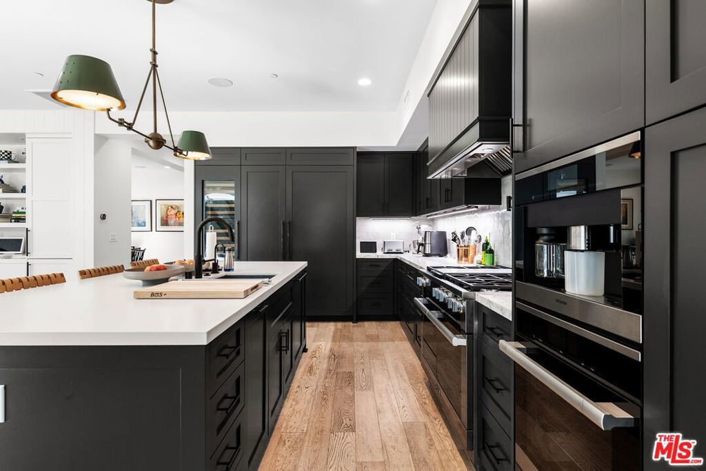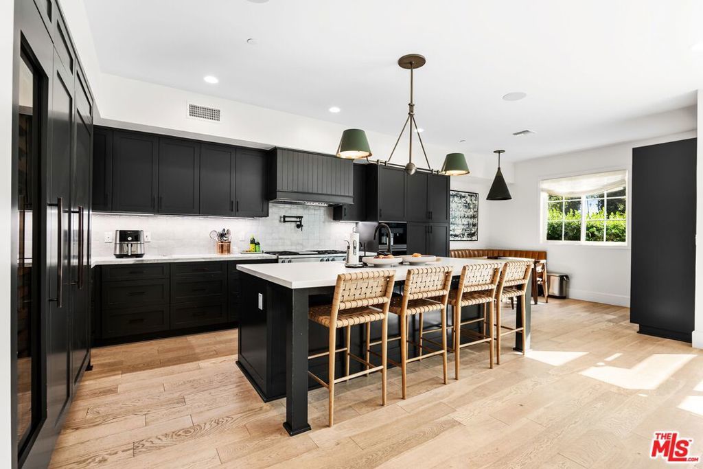 Chic, designer-done traditional on a large 6,000 sq. ft. lot in the coveted Brentwood Glen community! Built in 2021 and thoughtfully executed with a refined transitional aesthetic, this sophisticated, private, and gated residence sits on a true cul-de-sac street and offers over 3,145 sq. ft. of beautifully curated living space, complete with a stunning backyard oasis featuring a pool and jacuzzi with electric cover. Upon entering this striking two-story home, you're immediately drawn to the wide-plank wood floors, detailed millwork, curated lighting, and clean architectural lines that create warmth and understated luxury throughout. The layout is open yet intentional, with soaring ceilings and expansive sliding doors that flood the interiors with natural light. The fully appointed chef's kitchen is both functional and impressive, showcasing Sub-Zero refrigeration and wine storage, a Miele six-burner range with grill top, Miele coffee system, warming drawer, oversized island with seating, abundant pantry space, and a custom built-in breakfast nook. The space flows effortlessly into the spacious family room, creating a seamless indoor-outdoor connection to the outdoor dining area ideal for entertaining and everyday living. A private first-floor suite with separate entrance, en-suite bath, and a walk-in closet, offers flexibility for guests, multigenerational living, or a dedicated office. Upstairs, you'll find well-proportioned secondary bedrooms and a substantial bonus room currently designed as a playroom easily functioning as a fifth bedroom, media room, or executive workspace. The primary suite is a true retreat, featuring a spa-inspired bath with dual vanities, freestanding soaking tub, walk-in shower, and a generous custom walk-in closet. Adding to the home's functionality, half of the garage has been thoughtfully converted into a fully equipped gym, complete with mirrored walls and built-in space for workout equipment creating a private, at-home fitness studio while still maintaining garage utility. The backyard is designed for year-round enjoyment, anchored by a sleek rectangular pool and jacuzzi, expansive grassy yard, and a covered outdoor dining area with heaters perfect for gatherings, summer evenings, and everyday family life. A gated entry and built-in basketball hoop complete the property, blending luxury with livability. Don't miss the opportunity to own a truly designer-executed home in a family-friendly neighborhood on a quiet cul-de-sac in the highly sought-after Kenter Canyon School District!