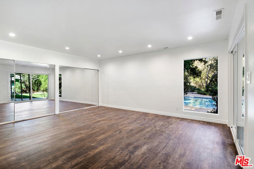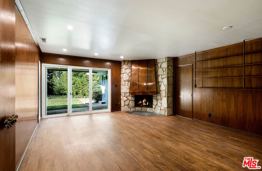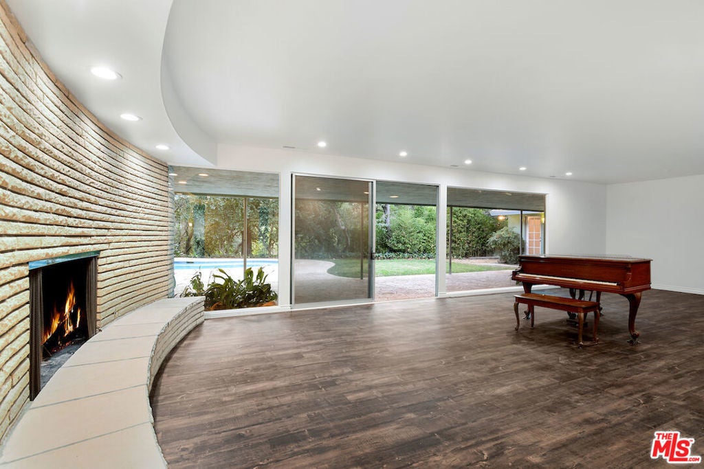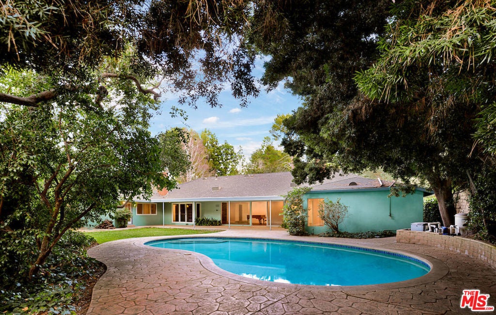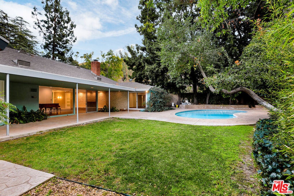 Nestled in nature within the highly coveted Fryman Estates, this exceptionally private Mid-Century Modern retreat offers a rare sense of serenity just moments from the very best of city living. A seamless blend of timeless architecture and thoughtful renovation, the home has been updated with modern amenities while preserving its original character and design integrity. Stylish double doors welcome you into a sun-drenched great room that effortlessly flows to the sparkling pool and expansive outdoor entertaining areas. Surrounded by lush landscaping, the grounds provide multiple spaces for dining al fresco, lounging poolside, or hosting unforgettable gatherings under the stars. This spacious 5 bedroom, 3 bath residence features a stunning wood-paneled library/office rich with original architectural detail, a warm and inviting living room anchored by a striking curved stone fireplace, a dedicated dining area, and a charming breakfast nook with its own private patio. Thoughtfully designed for both grand entertaining and intimate everyday living, the home offers a variety of distinct yet connected spaces to relax, work, and unwind.Ideally located near major studios, renowned dining, and premier shopping, this rare architectural gem offers the perfect balance of tranquility, style, and convenience. An extraordinary opportunity not to be missed.