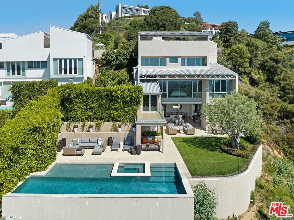 Nestled in the serene hillside of the highly coveted Upper Riviera, this home blends minimalist design with sweeping ocean and mountain views. The 5-bedroom, 7-bath residence spans 6,257 square feet and offers the comfort and refinement of a high-end retreat, with abundant natural light and ocean views from nearly every room. A formal entry leads to a commercial-grade elevator connecting all four levels of the home. The main living area features soaring ceilings, polished concrete floors, steel detailing, and oversized glass pocket doors that seamlessly merge indoor and outdoor spaces. The open floor plan includes a living room with custom fireplace, separate family room, dining area, and chef's kitchen with large center island, Wolf appliances, and wine fridge. The upper levels include five ensuite bedrooms, including a remarkable primary retreat with gym, showroom-style closet, spa-like bath, ocean views, and a private office with balcony overlooking the lush backyard. Mature landscaping and hedges frame a peaceful outdoor setting with pool, spa, covered patio, and fruit and vegetable garden. Additional highlights include three laundry areas and parking for six or more cars. Ideally located near some of LA's best hiking and biking trails, with convenient access to Brentwood, Santa Monica, and the Palisades.