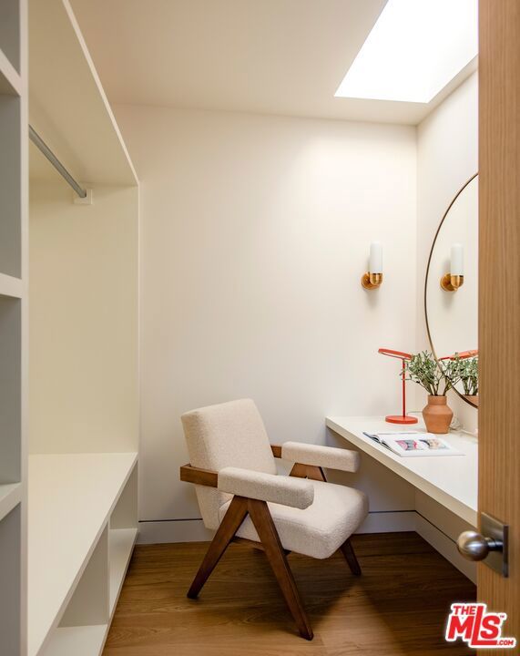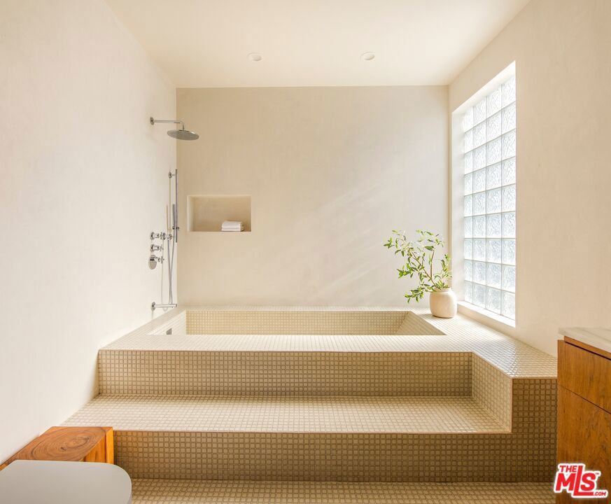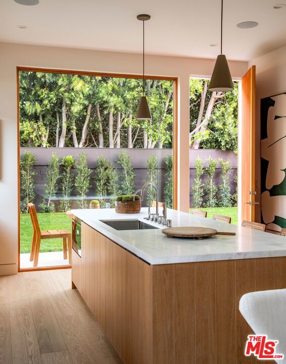 A striking, newly constructed architectural residence rooted in wood-forward contemporary design, distinguished by intentional detail and abundant natural light. Developed by Koral Real Estate and designed by architect Dean Levin of 22RE, this 4-bedroom, 4.5-bathroom home spans 3,516 SF of living space on a 5,596 SF lot in prime Mar Vista, highlighted by custom Douglas Fir detailing, a thoughtfully designed open layout, and elevated craftsmanship throughout. Inside, expansive windows flood the interiors with exceptional light, illuminating European-engineered white oak floors and clean-lined finishes that establish a warm, minimalist foundation. The designer kitchen is wrapped in custom white oak cabinetry and Greek Pentelikon honed marble countertops, featuring a Wolf appliance suite with double ovens and cooktop, paneled Thermador refrigeration, dual sinks, beverage refrigerator, and a generous island designed for gathering. The kitchen flows seamlessly into the spacious great room anchored by a travertine mantel with an EcoSmart fireplace, complemented by a dedicated dining area that feels both connected and distinct. Oversized windows overlook the private backyard retreat with patio, lawn, mature hedging, and a serene atrium, with two thoughtfully positioned doors offering convenient outdoor access. The main level also offers a dedicated office with adjacent full bath and a statement powder room. Upstairs, all bedrooms are en-suite, including the primary suite with soaring slanted ceilings. A pair of separate dressing corridors, each with built-in storage, lead to the spa-inspired bath featuring dual vanities, soaking tub, and a custom block glass walk-in shower. The exterior boasts a distinctive architectural presence defined by vertical-grain Douglas Fir siding, custom detailing, mature olive trees, and a private driveway with a two-car garage. This meticulously crafted new construction offers refined modern living on a desirable tree-lined street in the heart of Mar Vista, moments from top dining, shopping, and schools.