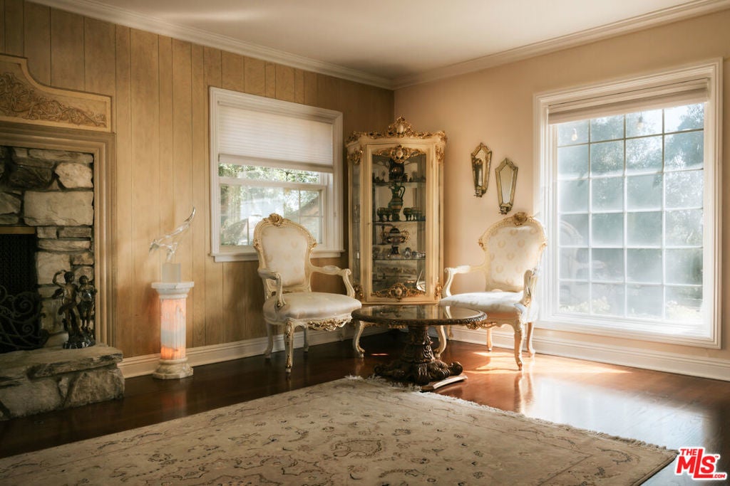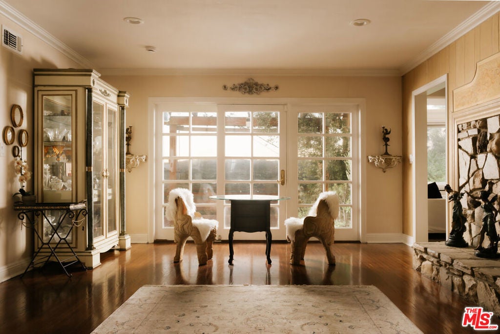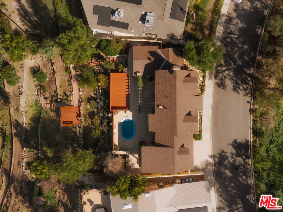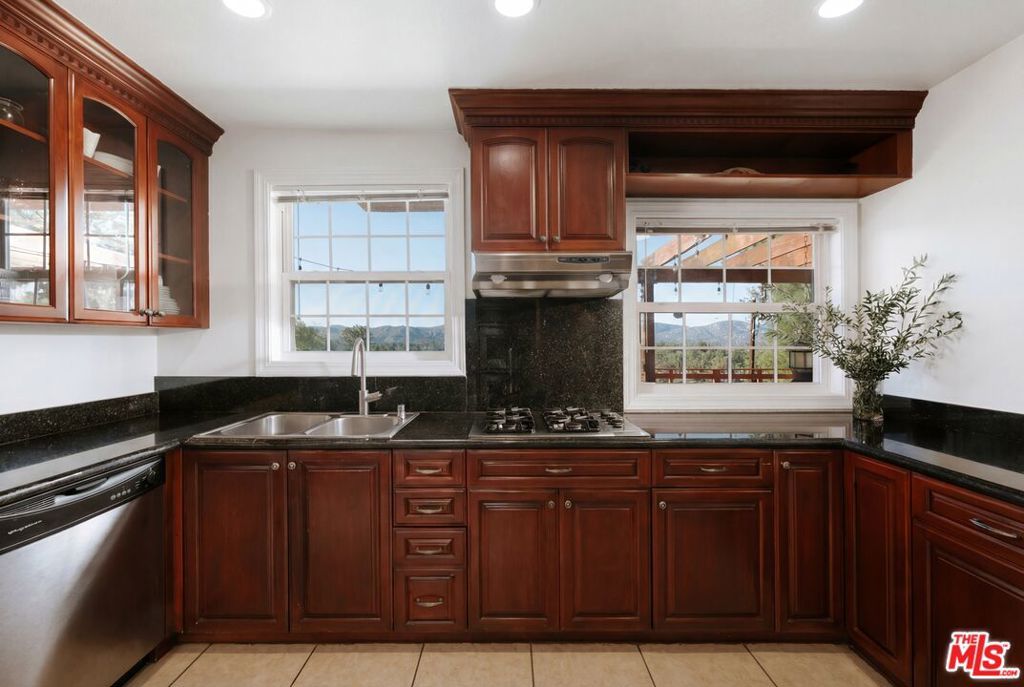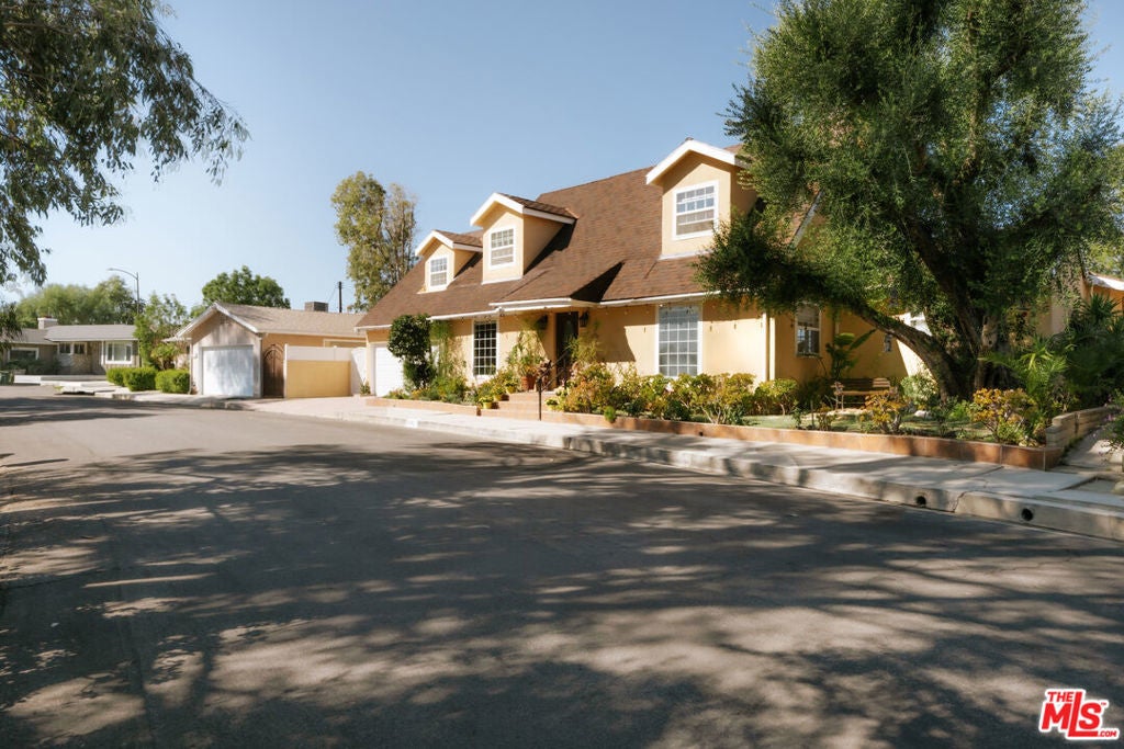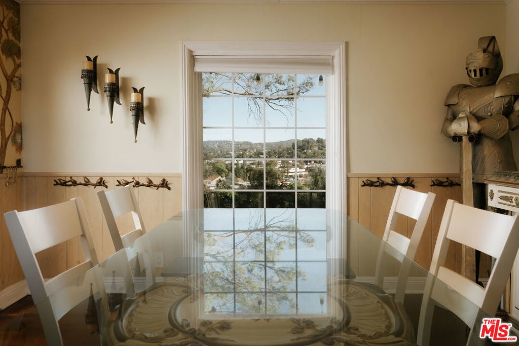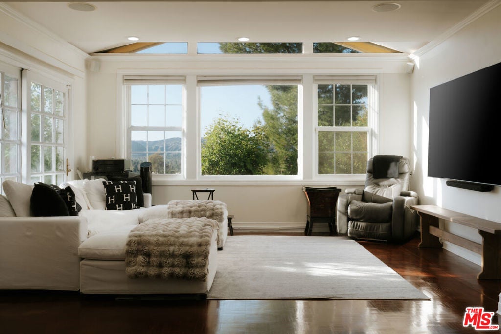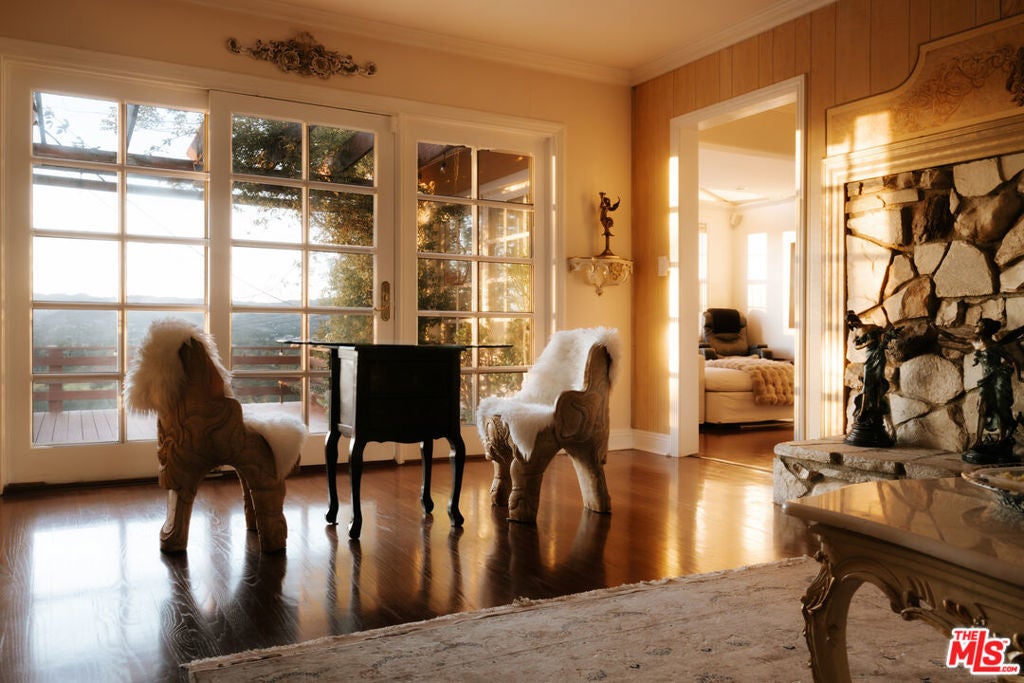 Location, views, and charm! Positioned at the end of a quiet cul-de-sac above the valley, 5741 Rolling Road captures sweeping panoramic city and hillside views, with natural light from sunrise to sunset. Inside, two spacious living rooms each feature their own fireplace, creating distinct yet inviting spaces to relax or gather. A formal dining room offers the perfect setting for both intimate dinners and larger celebrations. French doors and preserved vintage details bring warmth and character throughout. Mounted and in-wall speakers paired with a projector enhance the living room, making it ideal for movie nights and entertaining. Original hardwood floors run throughout the home. The kitchen features rich wood cabinetry, black granite countertops, stainless steel appliances, and generous storage to support both daily living and entertaining. A full bathroom with double sinks, a walk-in shower, and direct backyard access completes the main level. All bedrooms are located on the upper level, each capturing sweeping valley views. Two separate staircases create a layout that enhances privacy and easy flow throughout the home. The expansive primary bedroom includes an ensuite bath, walk-in closet, and a cozy balcony, perfect for enjoying the sunset. A secondary bedroom, accessed directly from the second staircase, functions like its own private suite with an ensuite bath and walk-in closet. It works well for guests, extended family, or a dedicated office. Additional bedrooms complete the second floor, each with scenic views. The backyard unfolds across multiple terraced levels designed for relaxation and recreation. The expansive main deck features an oversized jacuzzi and high-top bar, ideal for entertaining or enjoying sunsets. Steps lead to a second outlook deck and garden, then continue down to a third flat level that offers space for a sport court, playground, or other outdoor uses tailored to your needs. The garden includes olive, orange, lemon, pomegranate, mandarin, and apple trees. An outdoor shower adds convenience after enjoying the spa or yard. Recent upgrades include HVAC system, new water heater, electrical improvements, copper plumbing, a security system with cameras, and replaced garage door and motor. Residents enjoy easy access to Westfield Topanga and The Village at Westfield Topanga for shopping and dining, with the beach just a short drive away. The upcoming Rams Village development reflects continued investment in the area and supports the neighborhood's long-term growth.